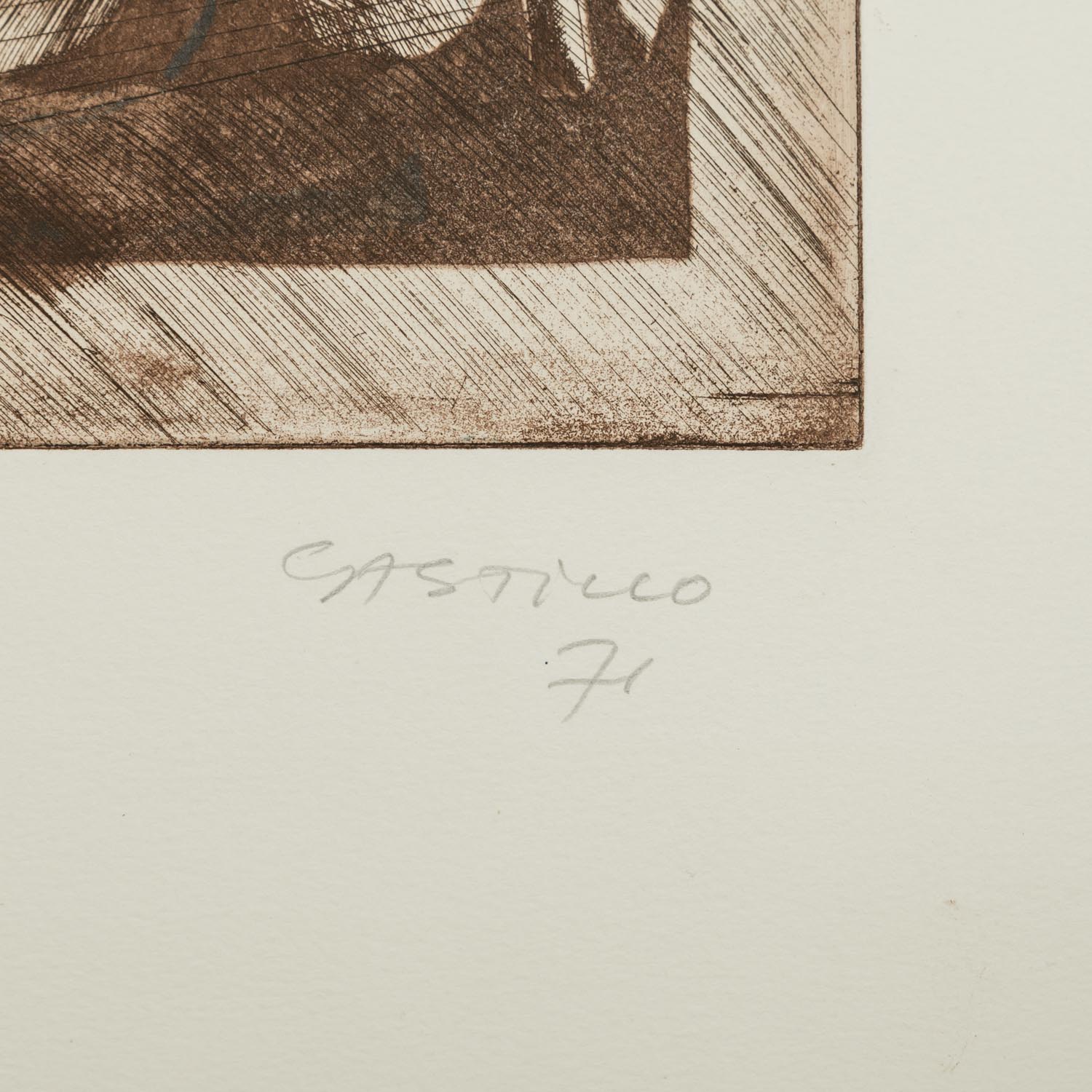 CASTILLO, JORGE (born 1933), "Figural composition", color aquatint / Arches France (with watermark), signed and dated by hand in pencil (19) 71, with pencil num. 58/150, blindstamp 'GRAPHIK INTERNATIONAL', HxW: plate ca. 39,5x50,5 cm, leaf ca. 57x76,5 cm. Slightly browned (towards the edge stronger), margins slightly wavy and creases.