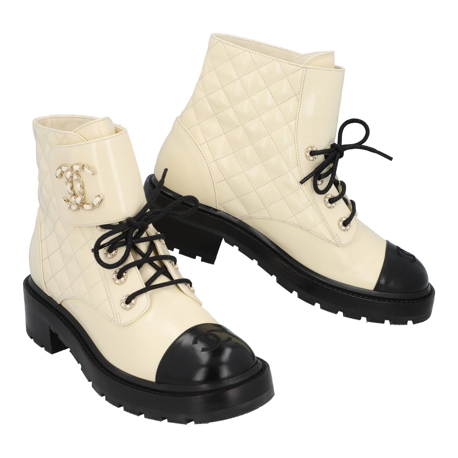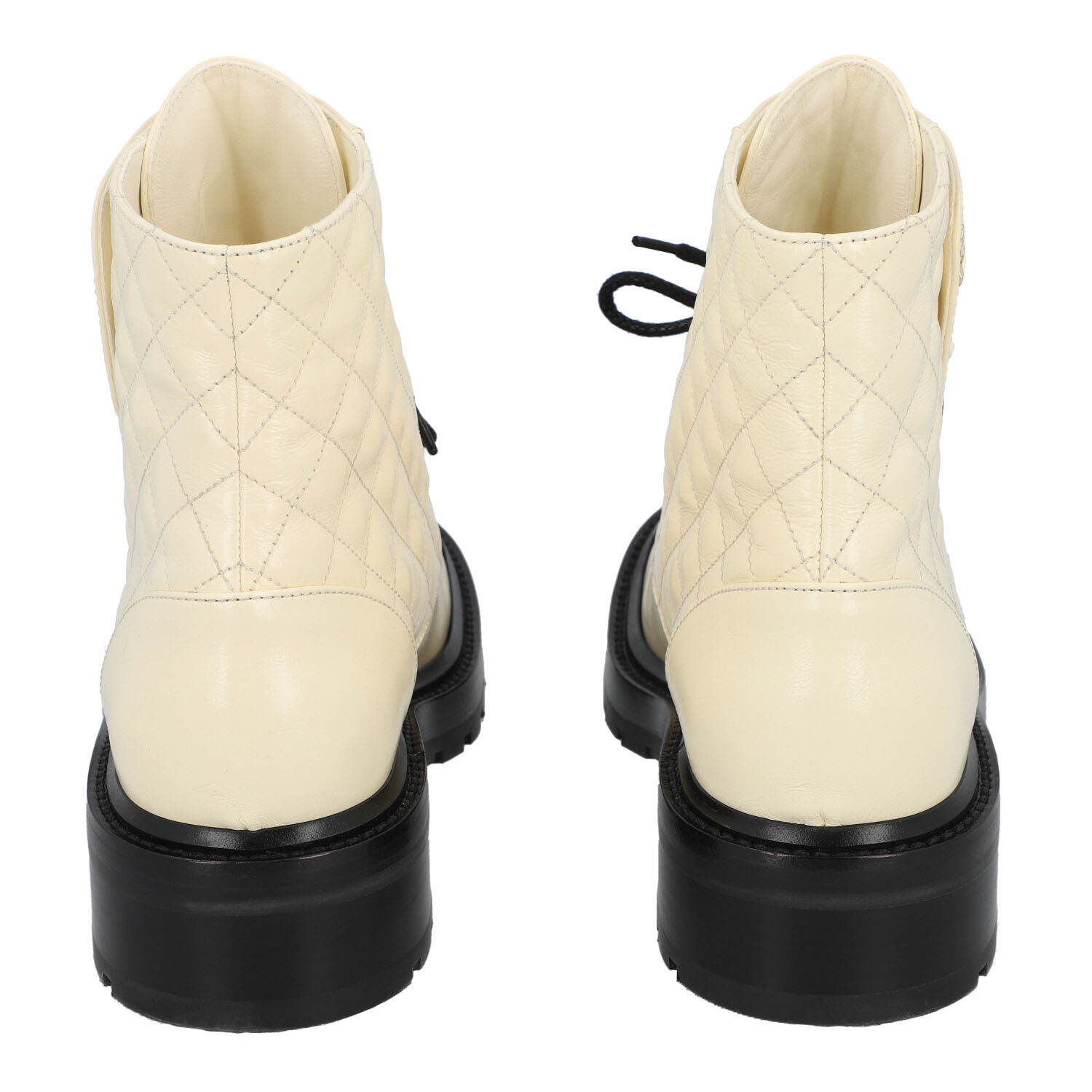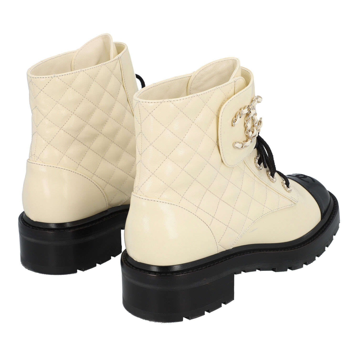 Ankle Boots aus beschichtetem Leder in Weiß mit klassischer Diamantsteppung, goldfarbener Hardware und robuster, gummierter Laufsohle mit Absatz in Schwarz. Schuhspitze mit Kappe in Schwarz und CC-Stickerei. Lasche mit Leder durchflochtener CC-Logo Applikation. Box anbei. Sehr guter Erhalt, dezente Gebrauchsspuren.