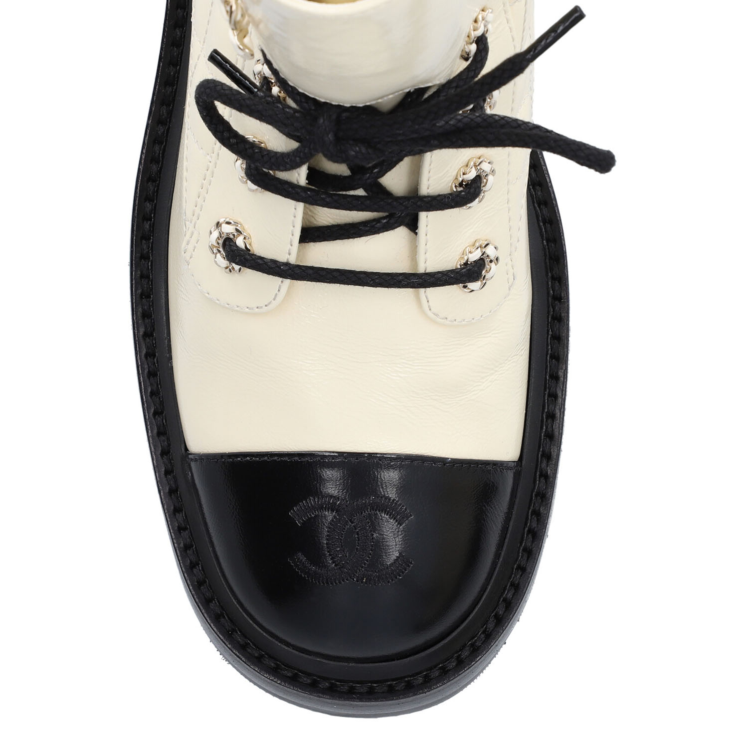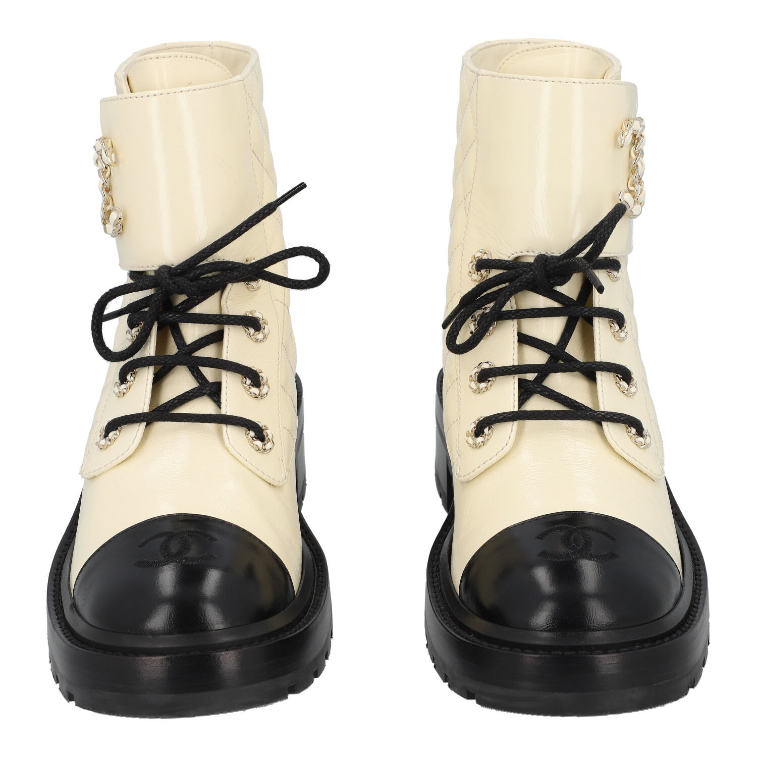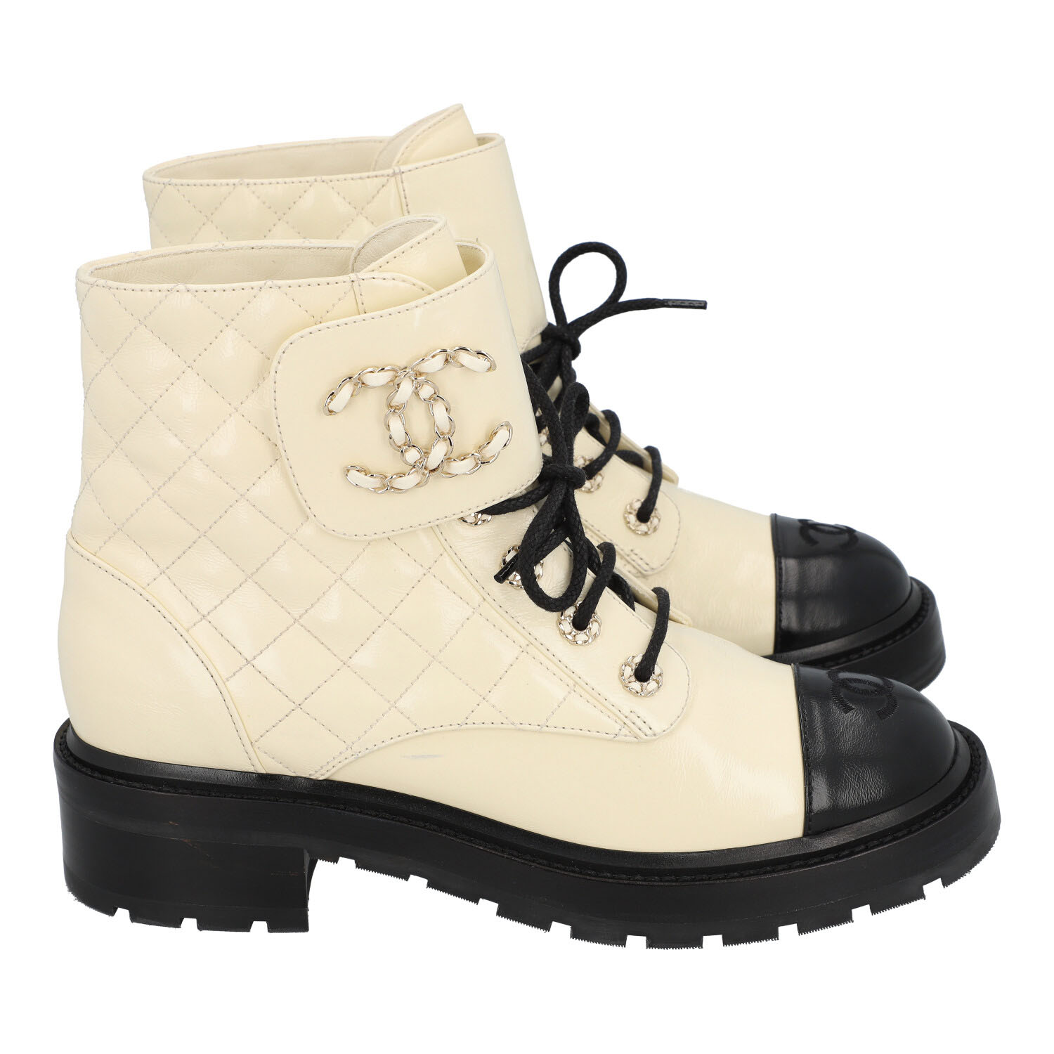 Ankle Boots aus beschichtetem Leder in Weiß mit klassischer Diamantsteppung, goldfarbener Hardware und robuster, gummierter Laufsohle mit Absatz in Schwarz. Schuhspitze mit Kappe in Schwarz und CC-Stickerei. Lasche mit Leder durchflochtener CC-Logo Applikation. Box anbei. Sehr guter Erhalt, dezente Gebrauchsspuren.
