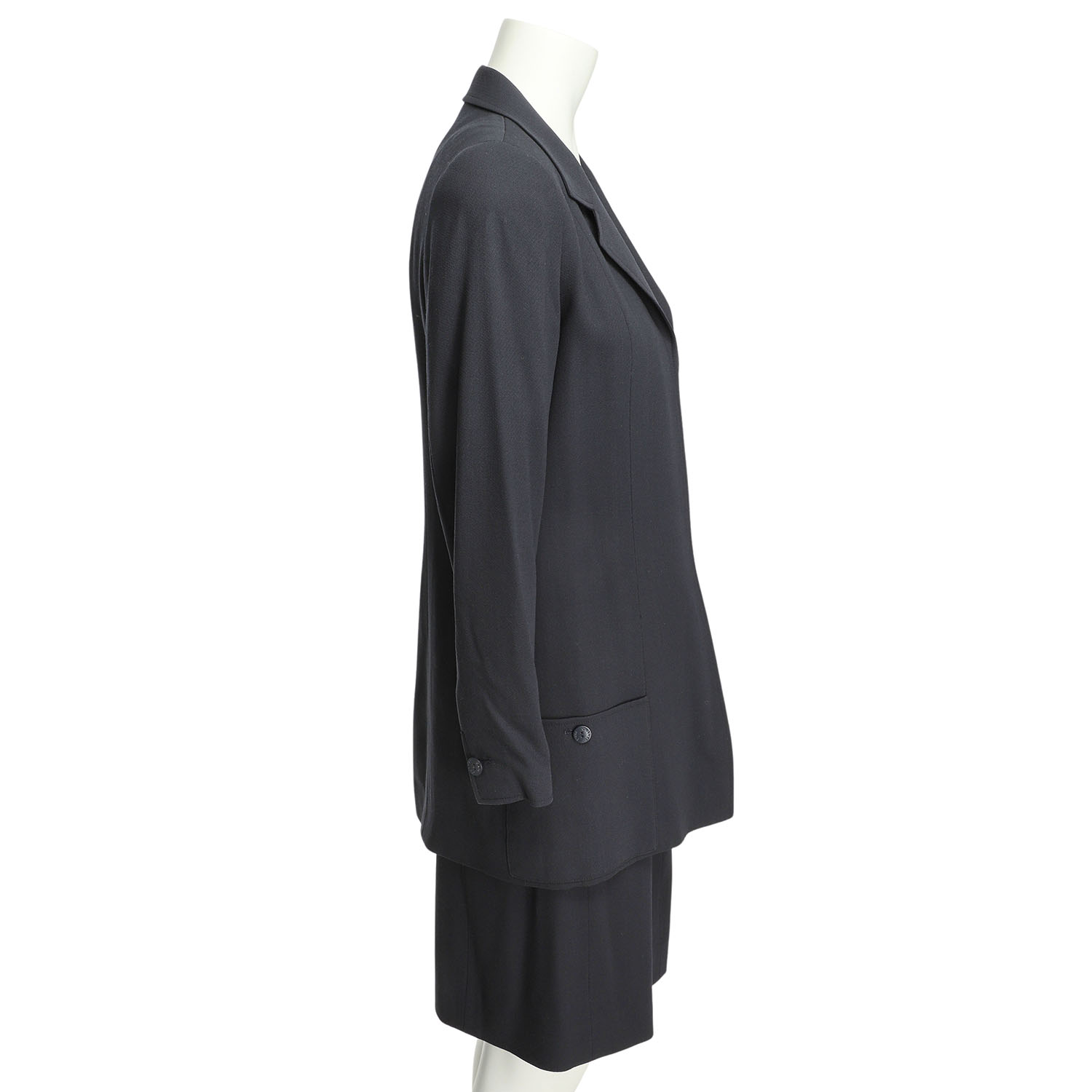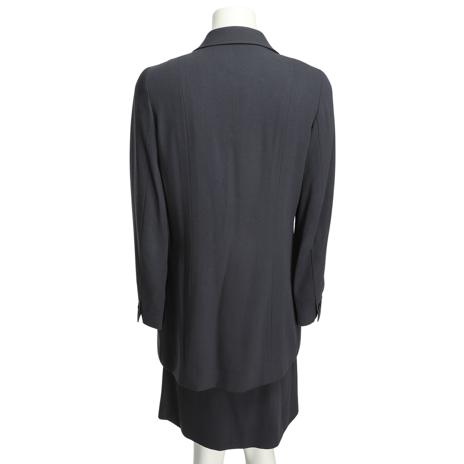 Wollgemisch. Dunkelblaues Modell mit Reverskragen und aufgesetzten Taschen. Gerader Rock mit Knopf- und Reißverschluss. Tragespuren vorhanden.