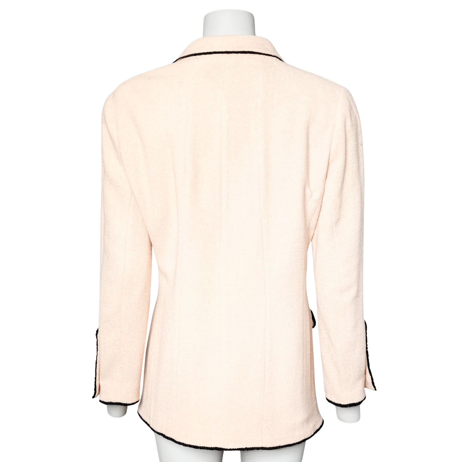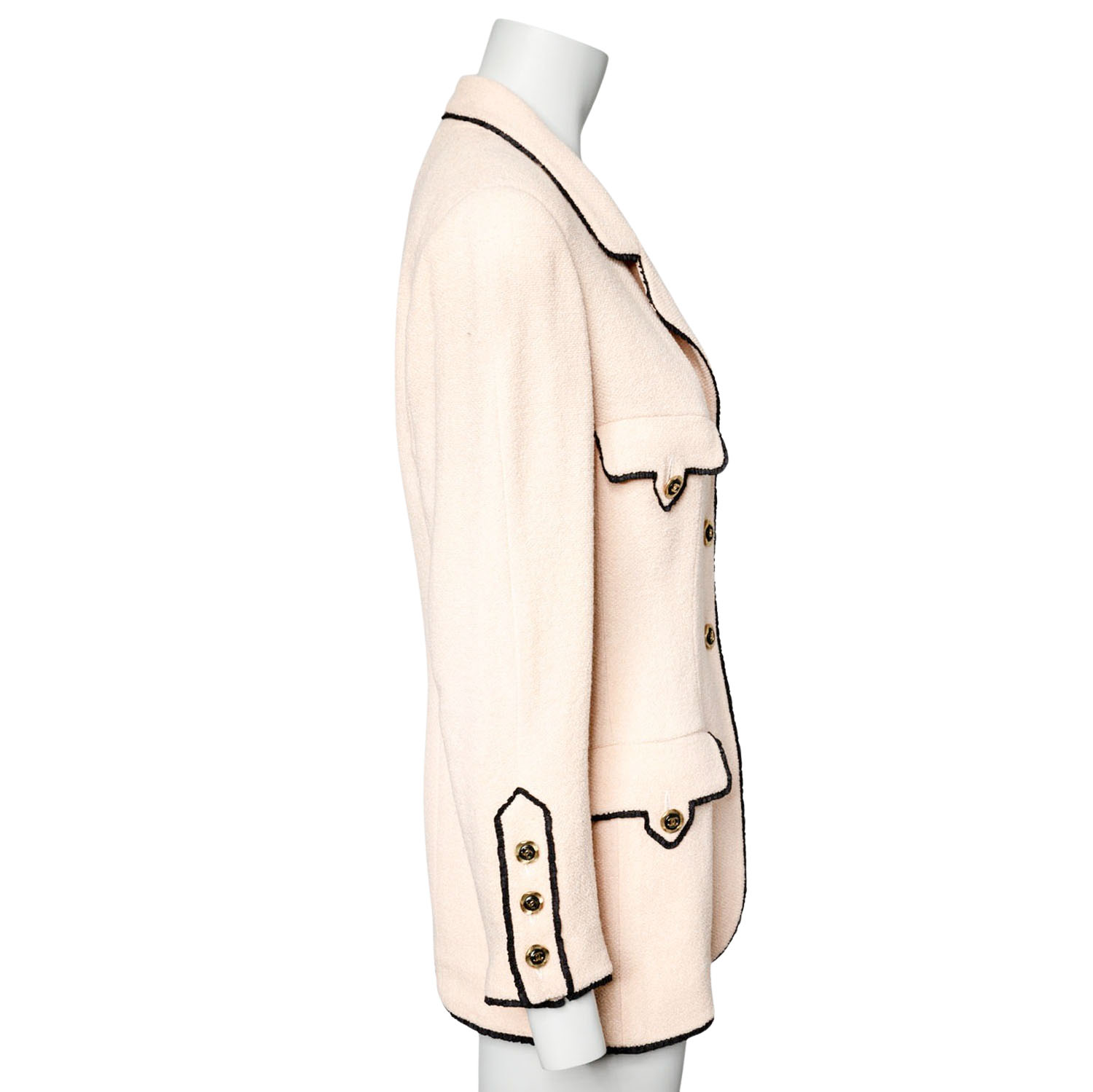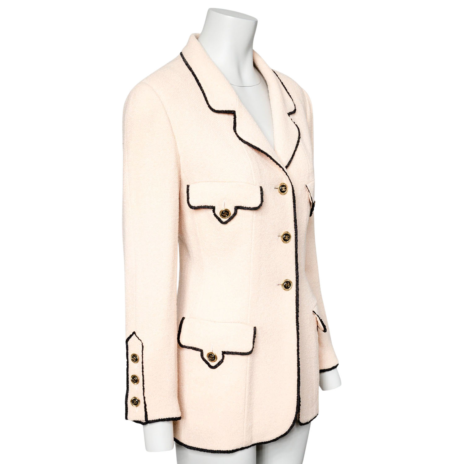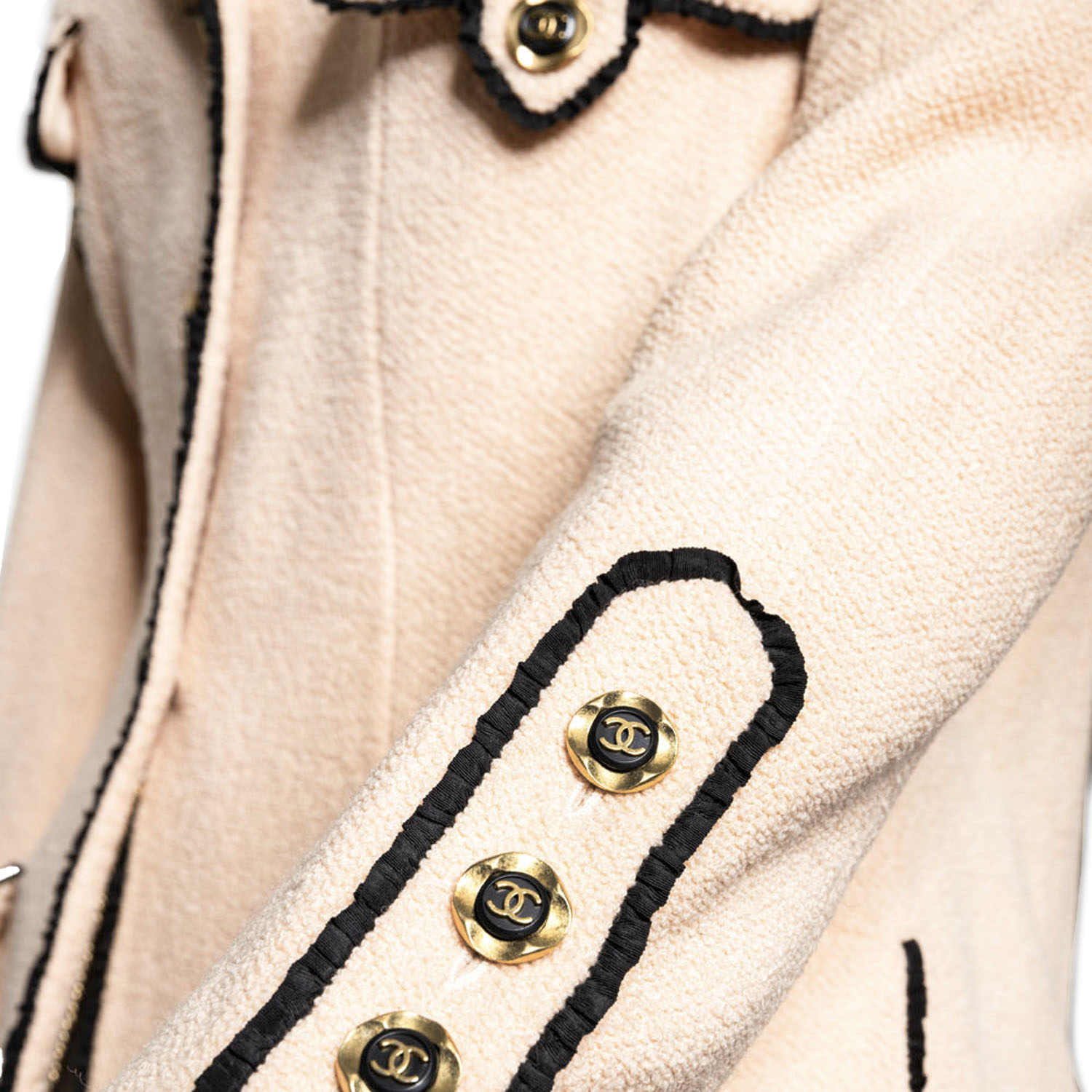 Koll. 1994. Wollgemisch in Apricot mit dekorativer, schwarzer Bordüre und goldfarbenen CC-Logo Knöpfen. Vier dekorative Taschen mit Überschlag. Innenfutter aus Seide. Leichte Altersspuren vorhanden, dennoch schöner, gepflegter Erhalt.