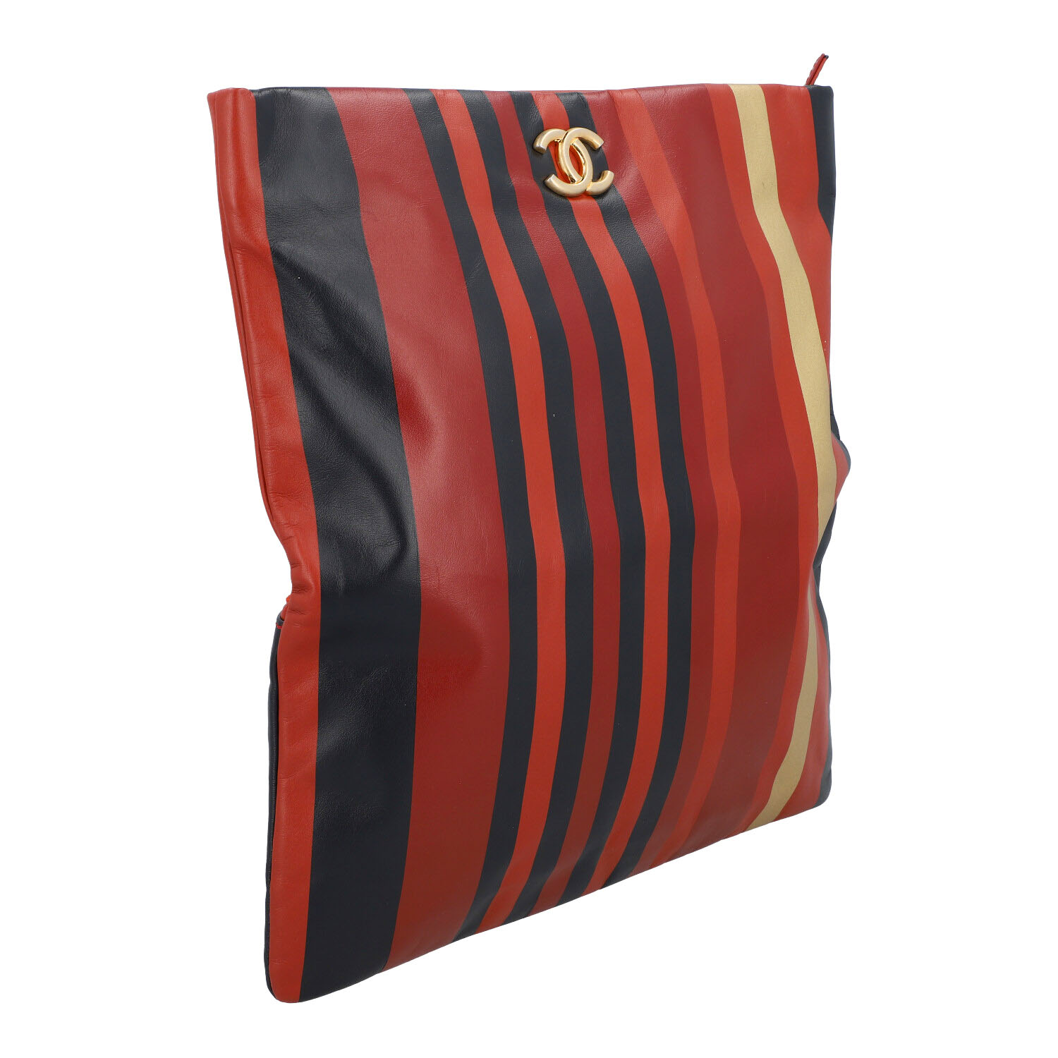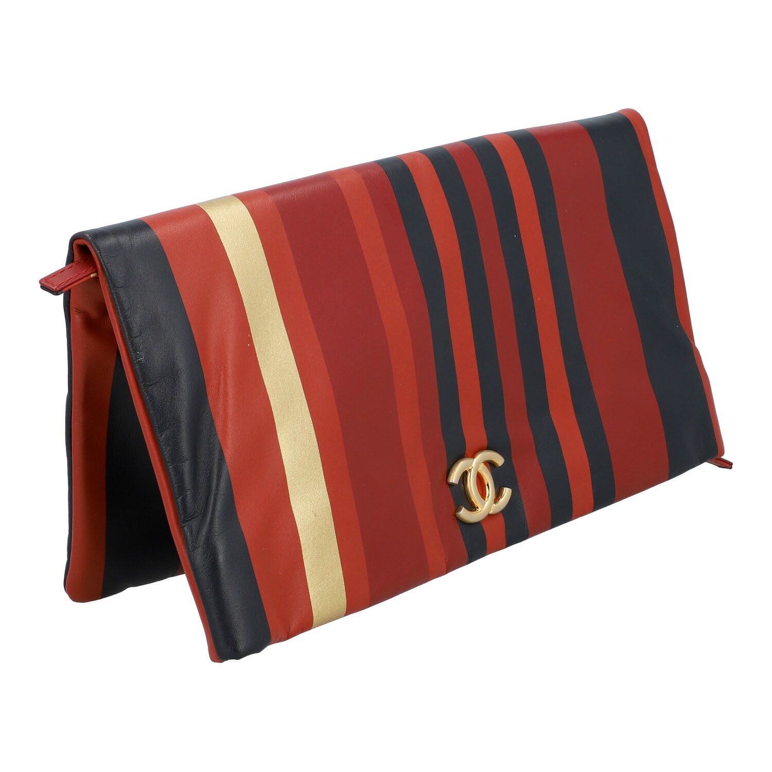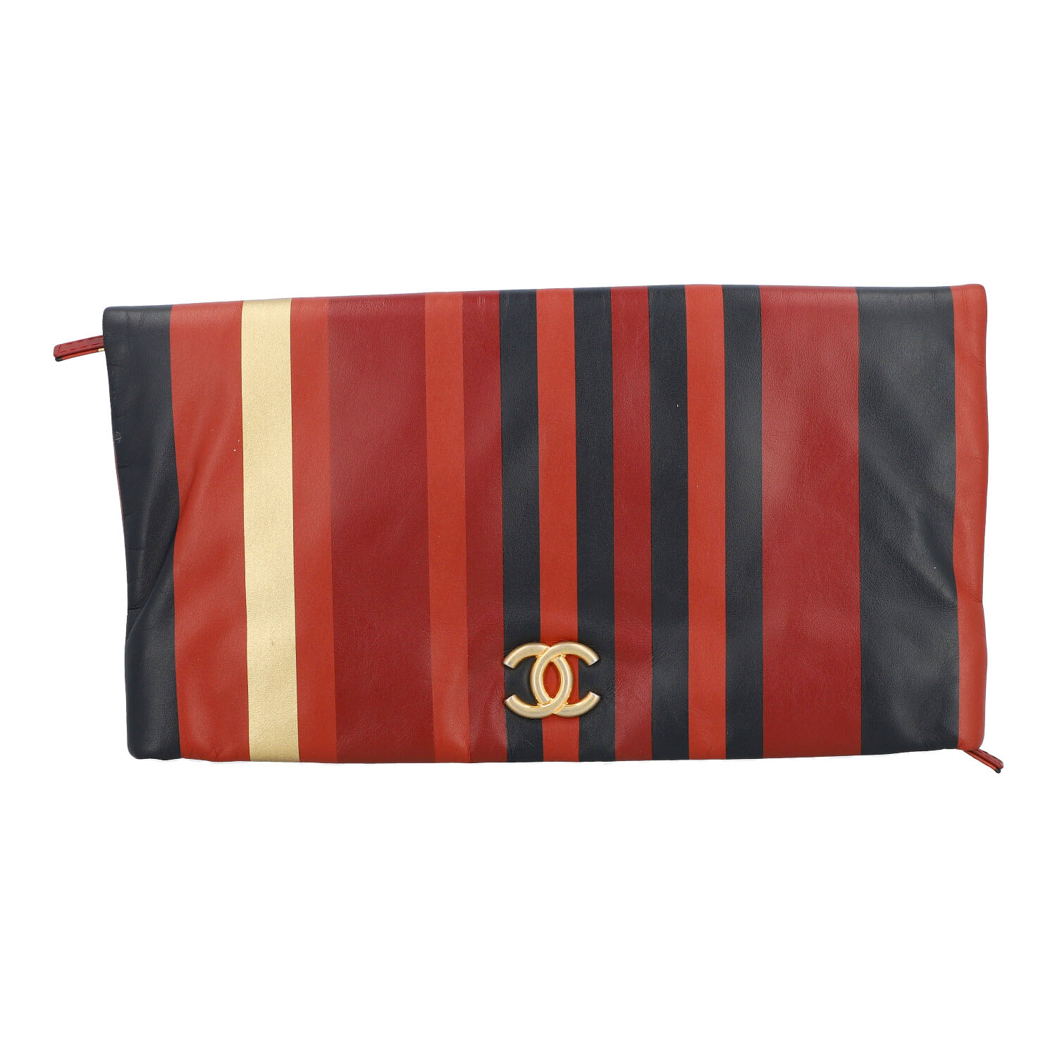 Griechenland Cruise Kollektion. Aufklappbare Clutch aus Leder in Rotbraun-Tönen mit Streifen in Schwarz und Goldfarben. Überschlag mit CC-Logo, zwei Fächer mit Reißverschluss und textilem Innenfutter. Staubbeutel und ID-Card anbei. Sehr guter Erhalt. 34x3x18,5cm.