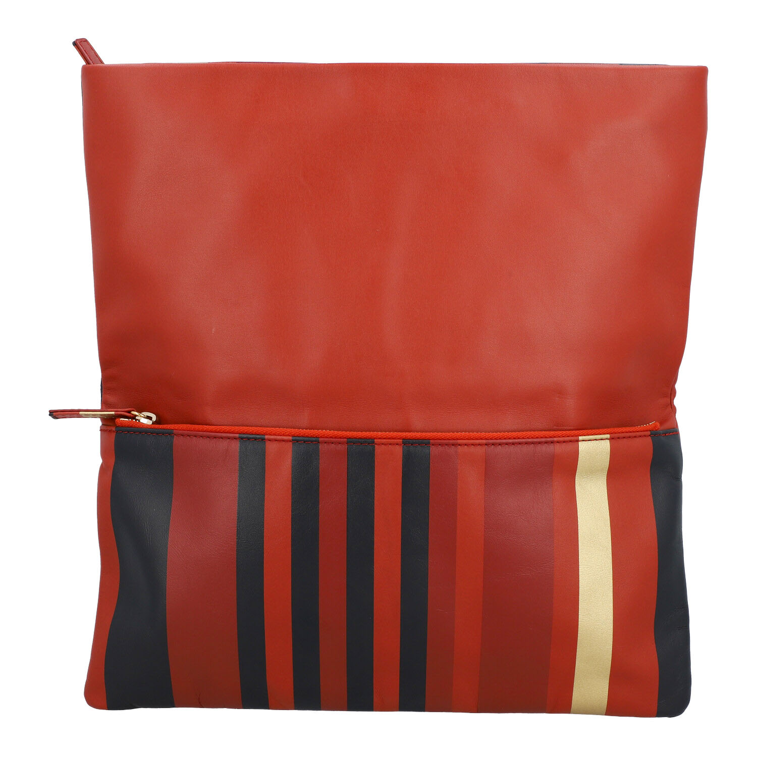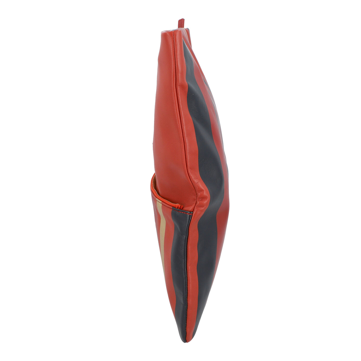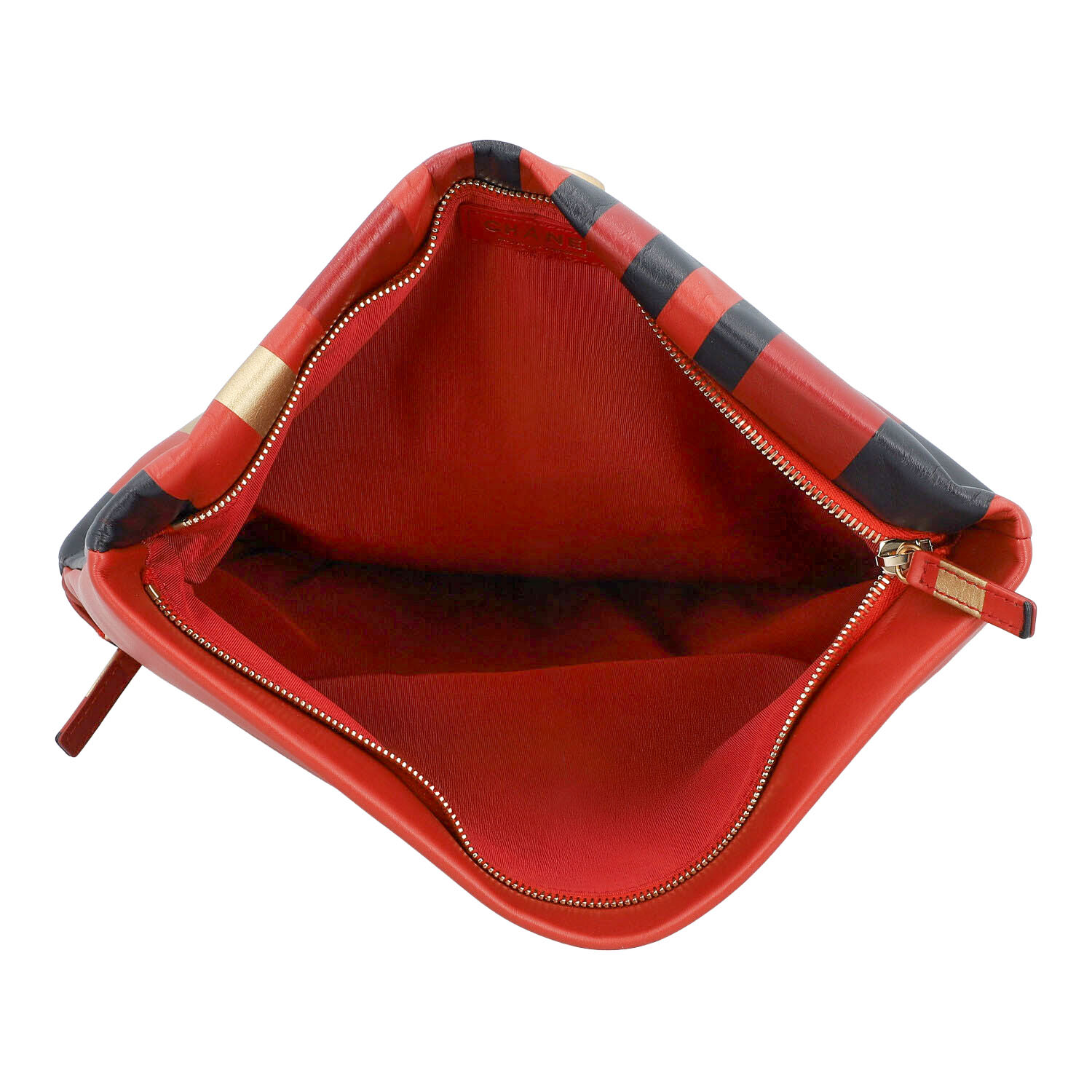 Griechenland Cruise Kollektion. Aufklappbare Clutch aus Leder in Rotbraun-Tönen mit Streifen in Schwarz und Goldfarben. Überschlag mit CC-Logo, zwei Fächer mit Reißverschluss und textilem Innenfutter. Staubbeutel und ID-Card anbei. Sehr guter Erhalt. 34x3x18,5cm.