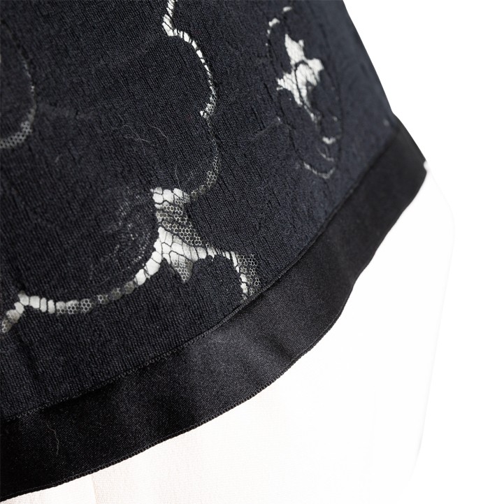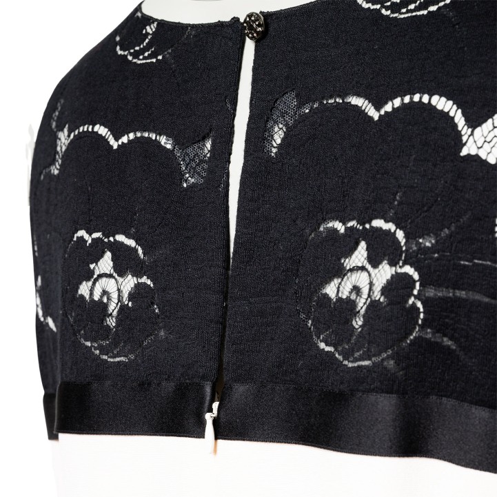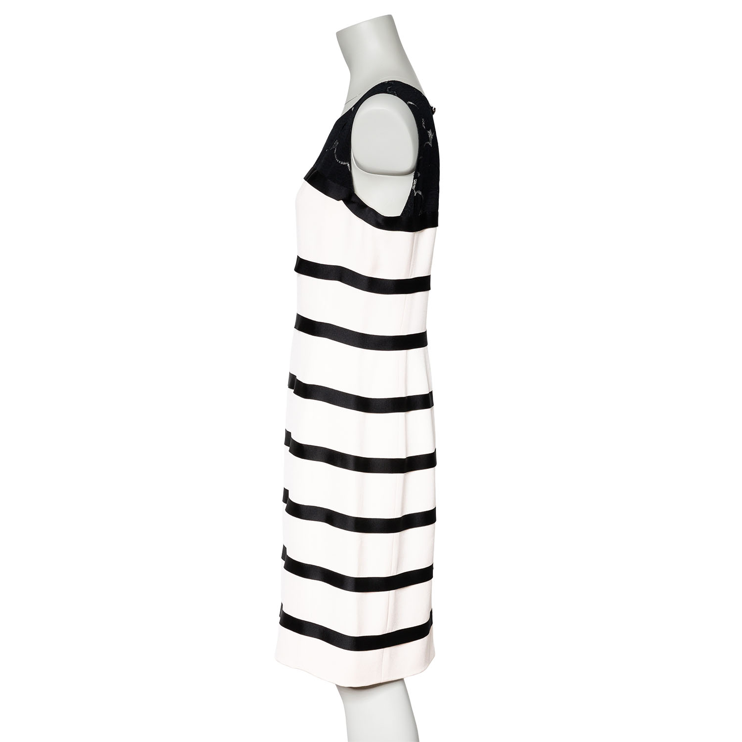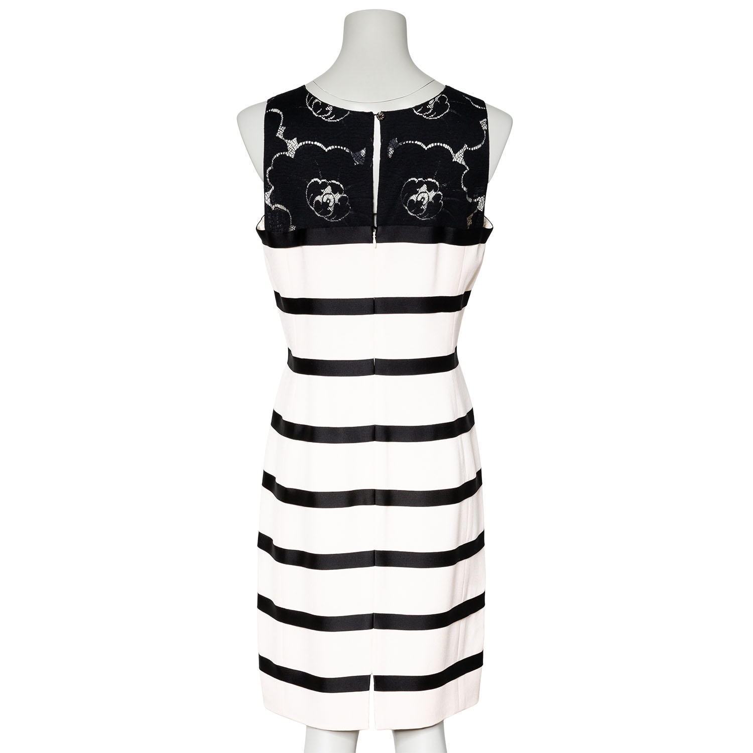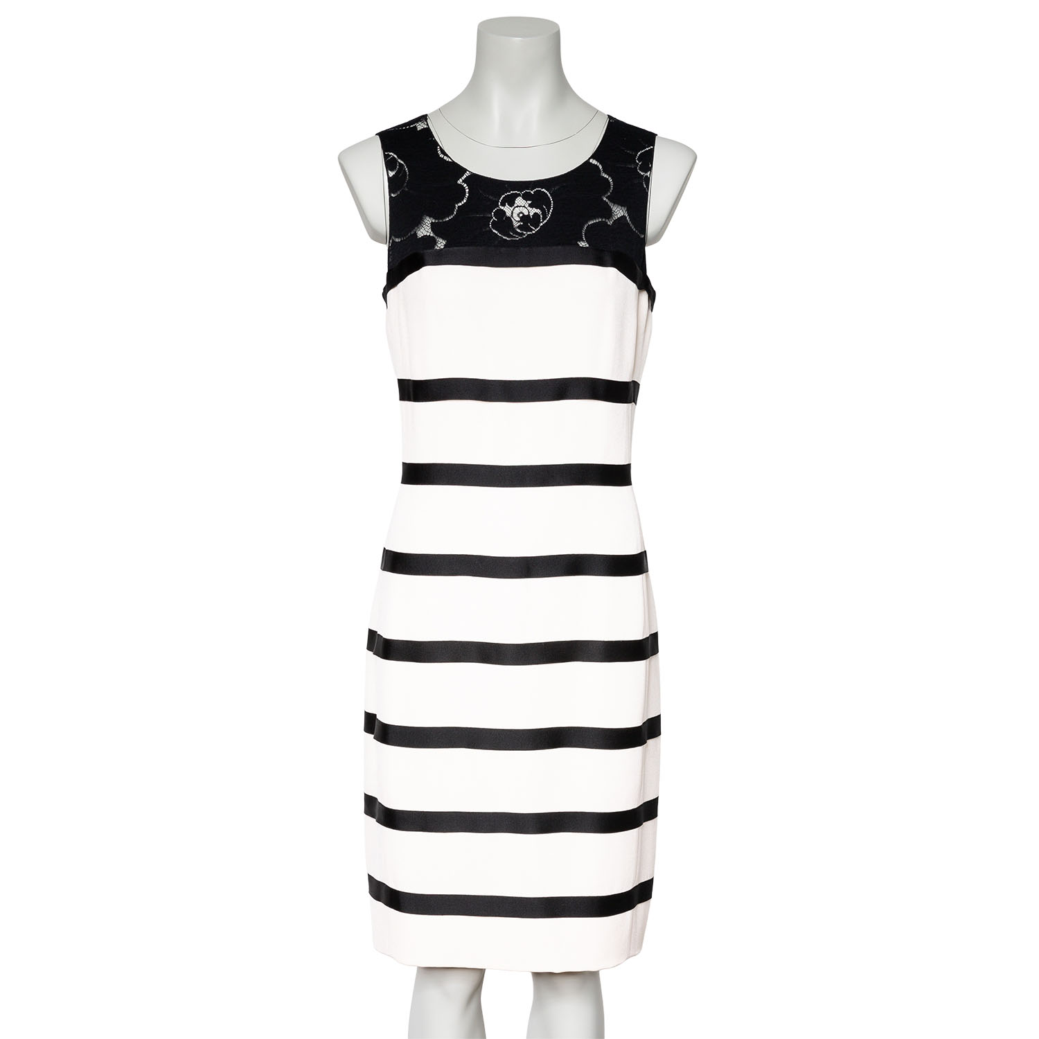 Gestreiftes Modell mit Spitzendekolleté im Kamelienmotiv und Reißverschluss im Rückteil. Tragespuren vorhanden.