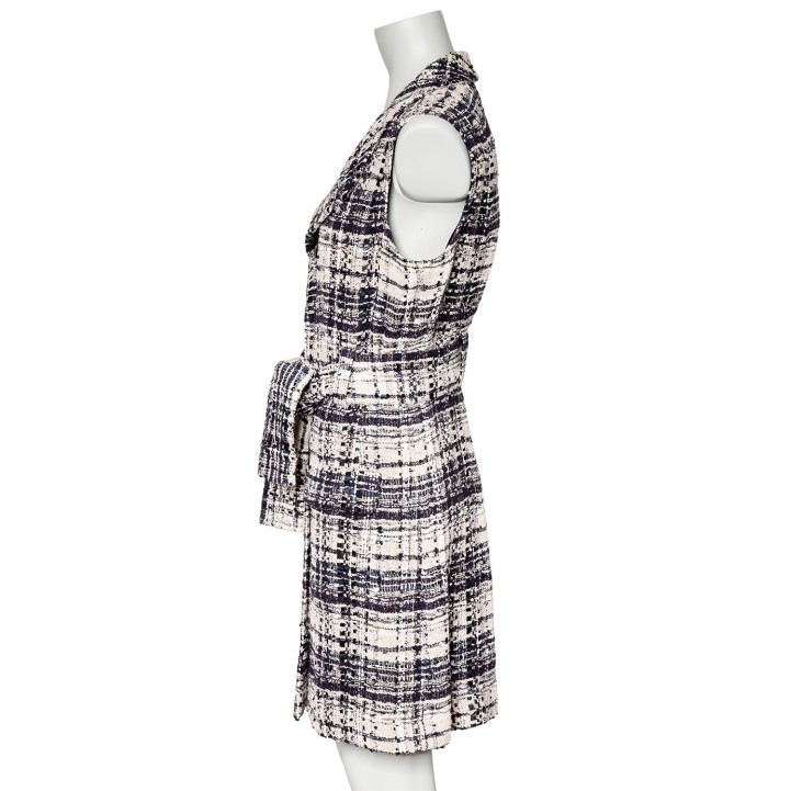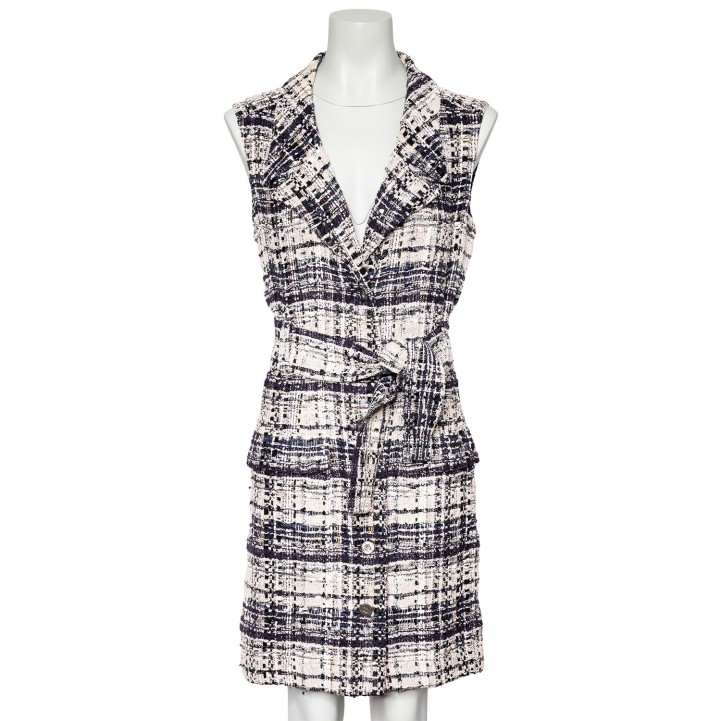 Ärmelloses Bouclé-Modell in Multicolor mit klassischem Reverskragen, durchgehender Knopfleiste, Pattentaschen und Taillengürtel. Tragespuren vorhanden.
