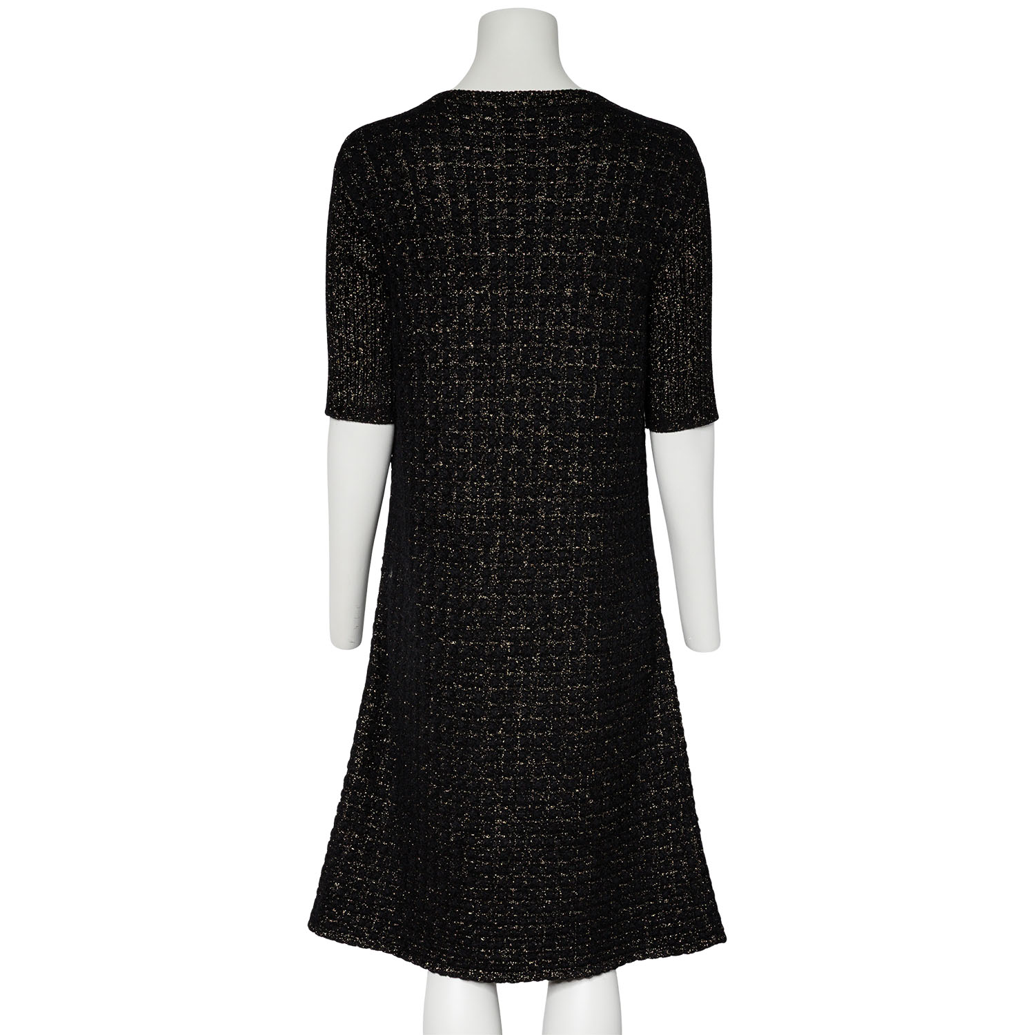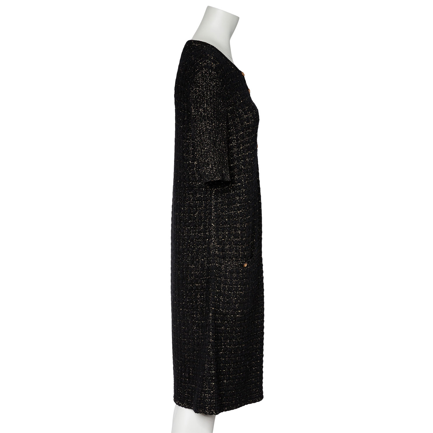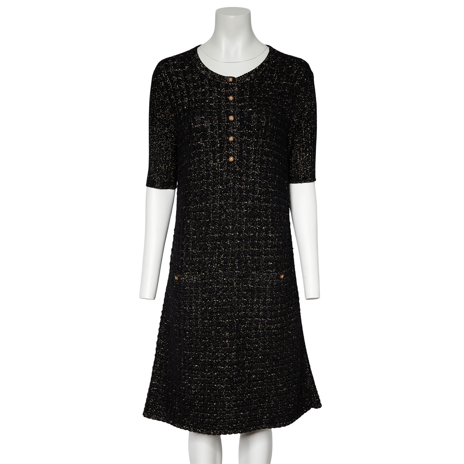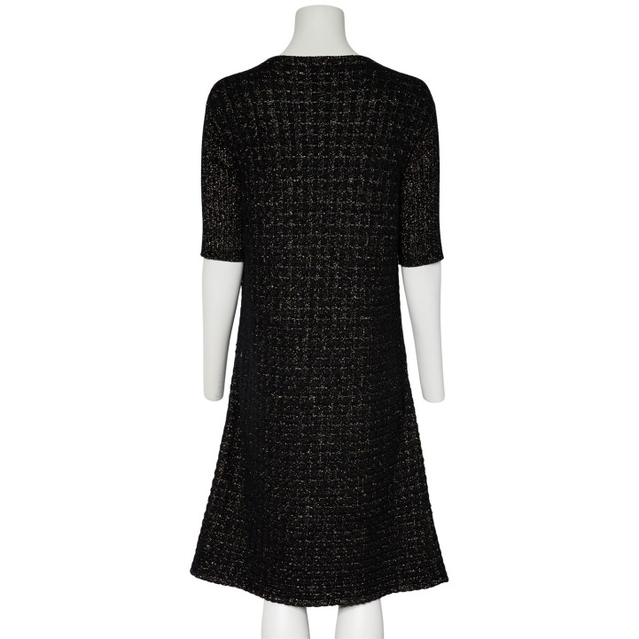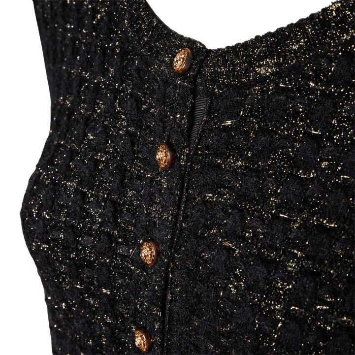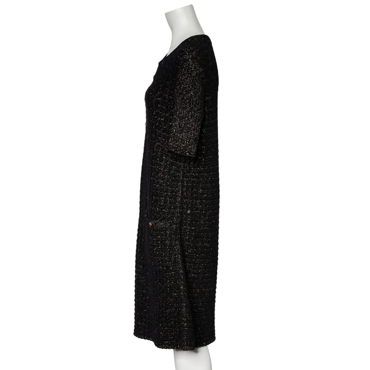 Schwarzes Modell mit goldfarbenen Zierfäden, kurzen Ärmeln, aufgesetzten Taschen und Knopfverschluss am Ausschnitt. Dezente Tragespuren vorhanden.