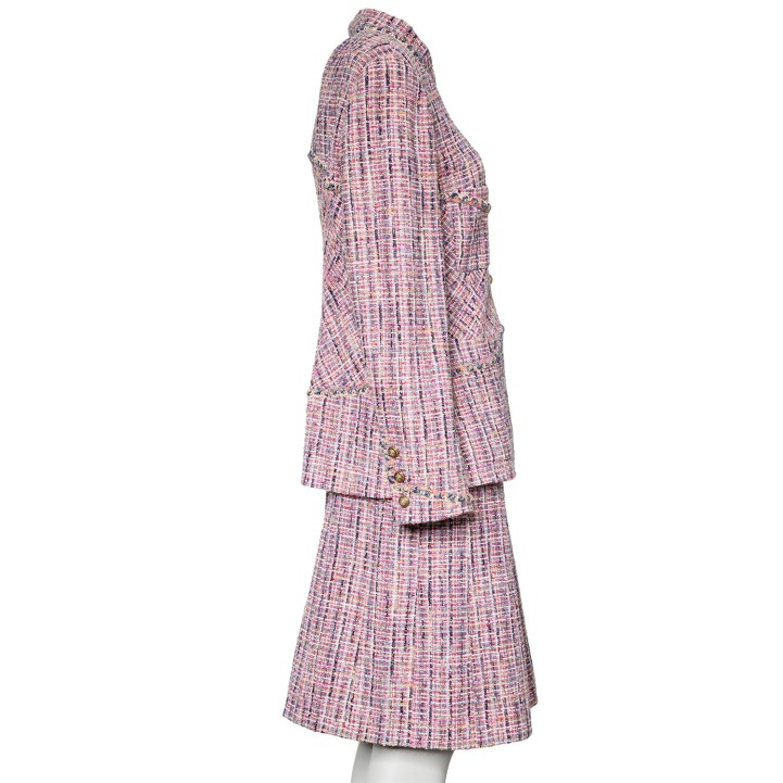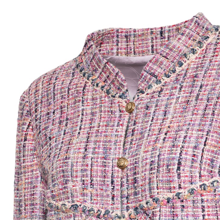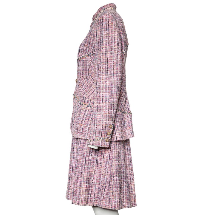 Bouclé-Ensemble in Multicolor mit Knopfverschluss, Stehkragen und vier aufgesetzten Taschen Passender Rock anbei. Tragespuren vorhanden, Etikett teilweise entfernt.