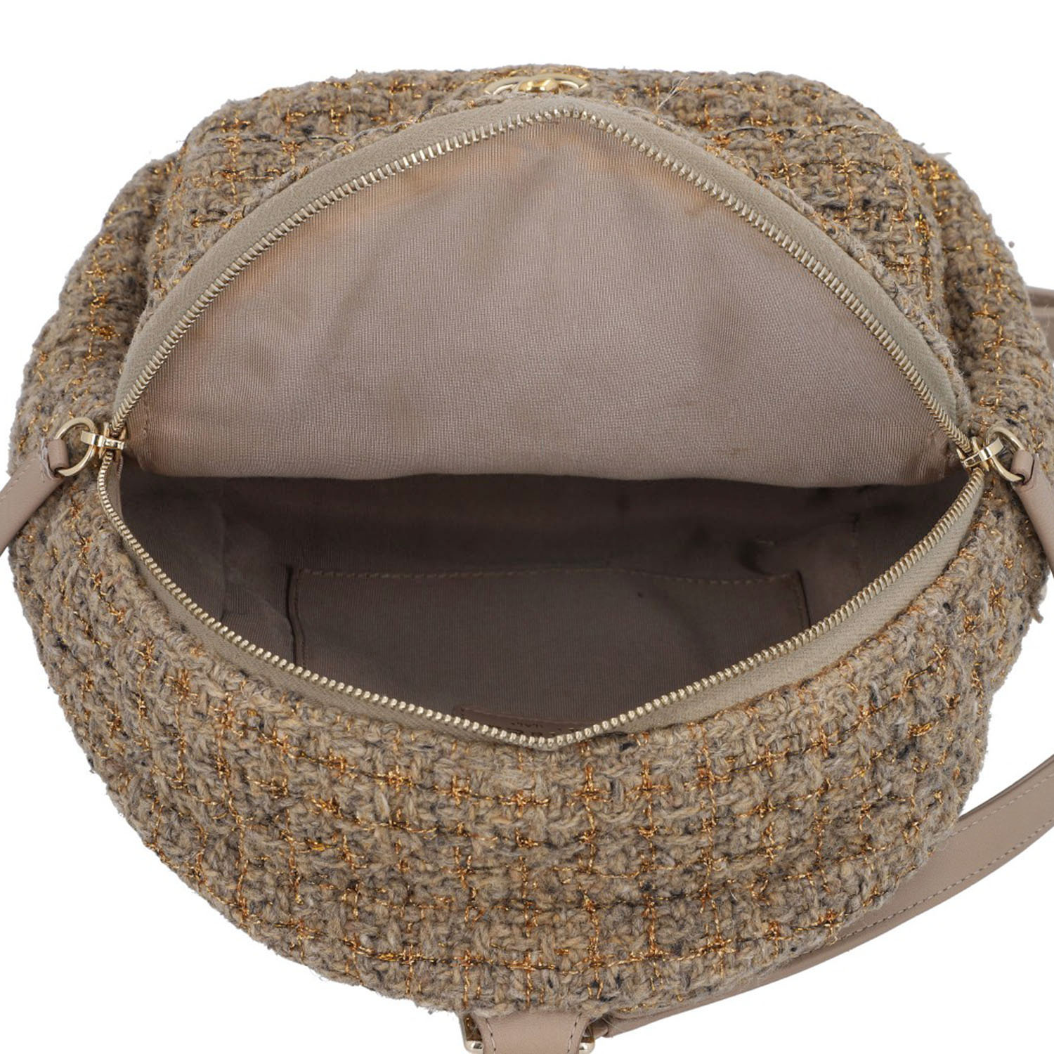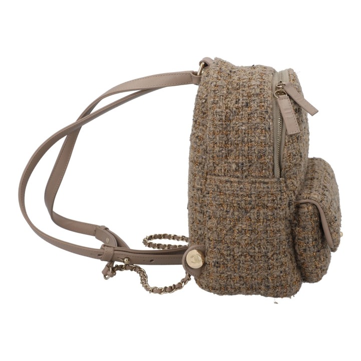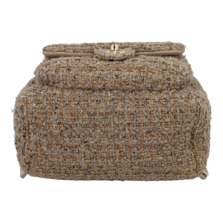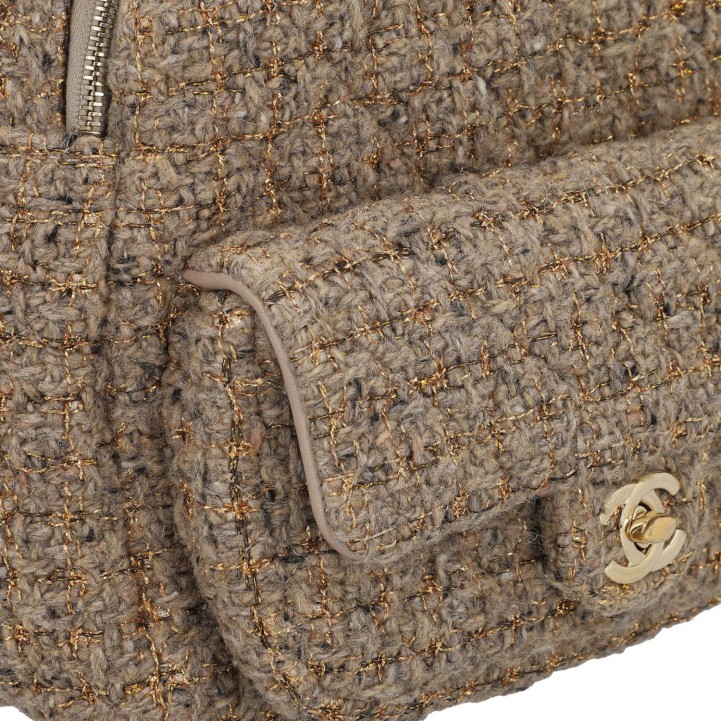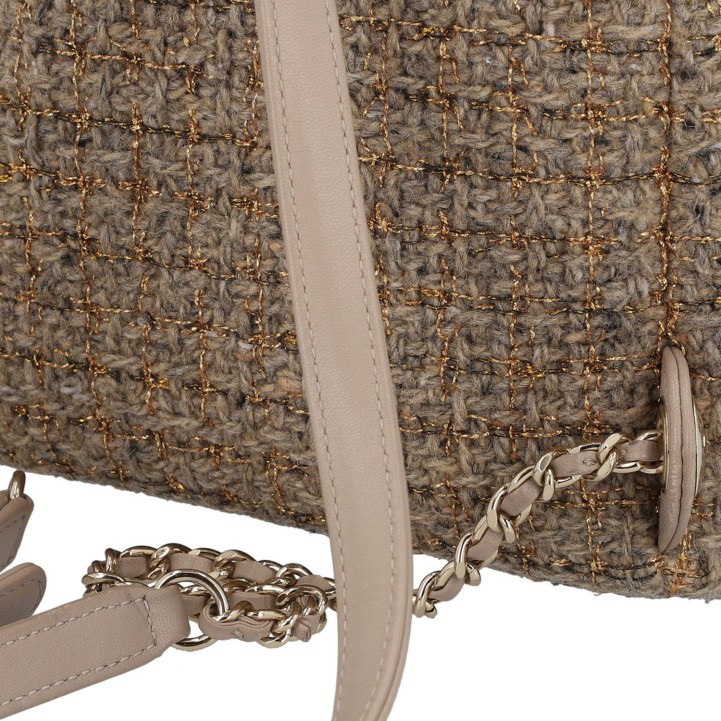 Ventes privées 2020 (Mitarbeiterkauf). Aus Wollbouclé in Hellbraun mit goldfarbenen Details und klassischer Steppung. Ein kleines Außenfach mit Überschlag und CC-Drehverschluss, Hauptfach mit Reißverschluss, längenverstellbare Trageriemen mit Gliederkettendekor. Innenfutter aus Textil. Leichte Gebrauchsspuren vorhanden. 20x11x22cm.