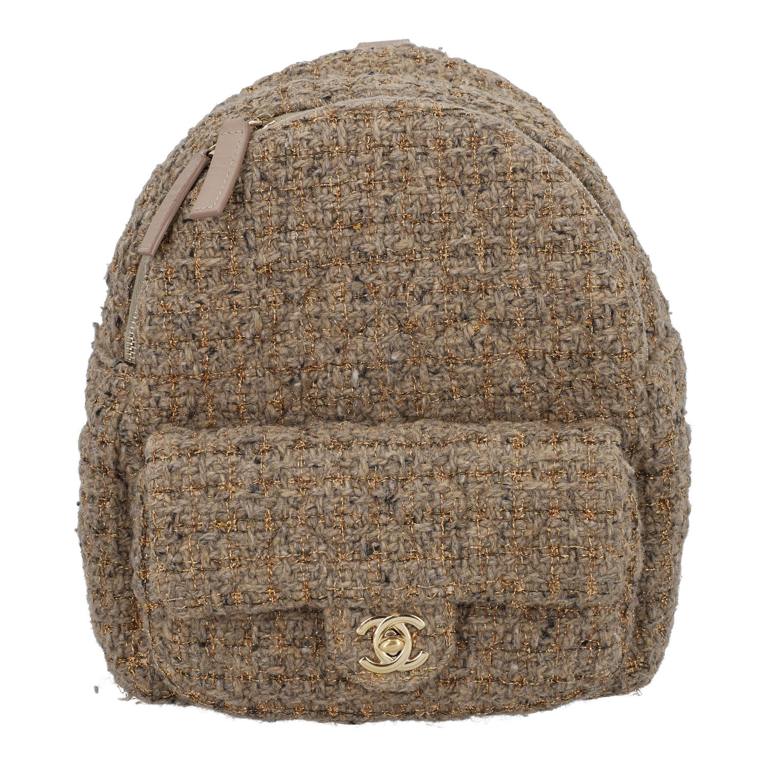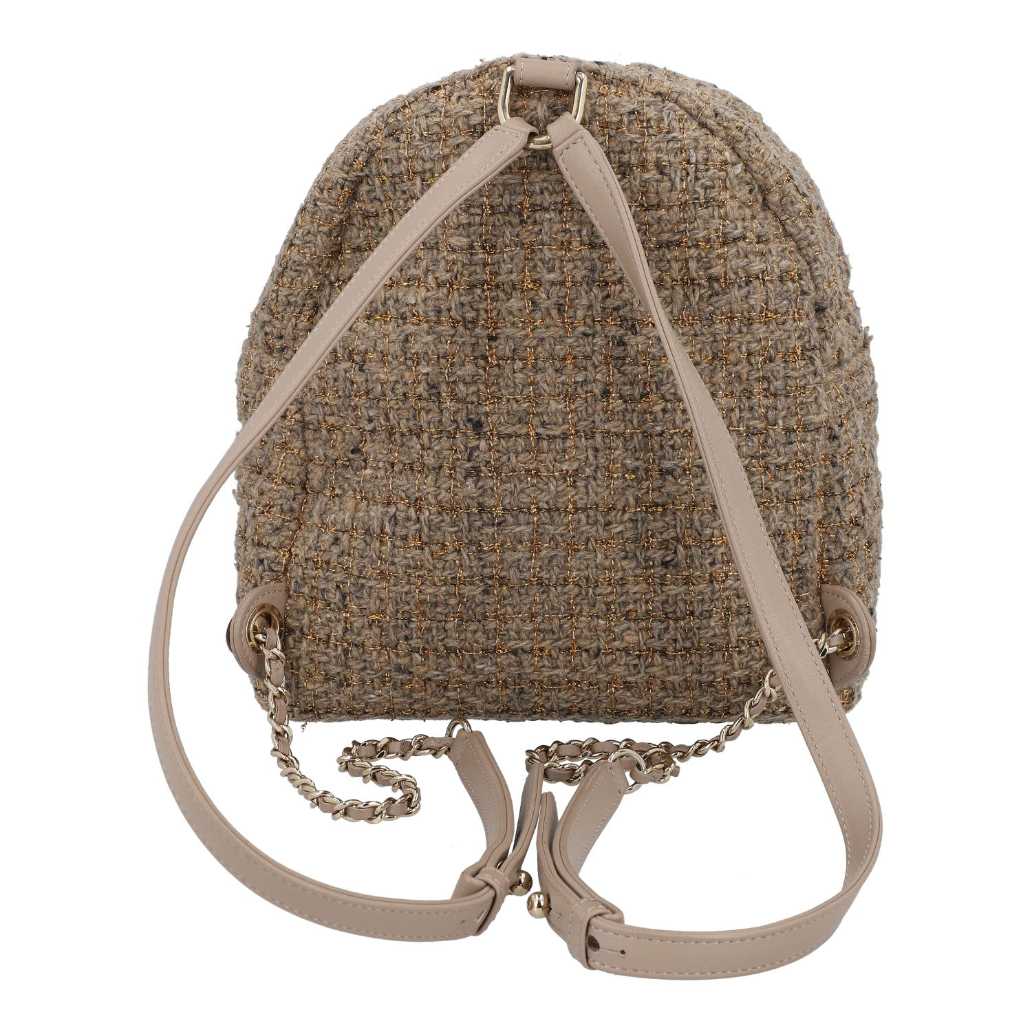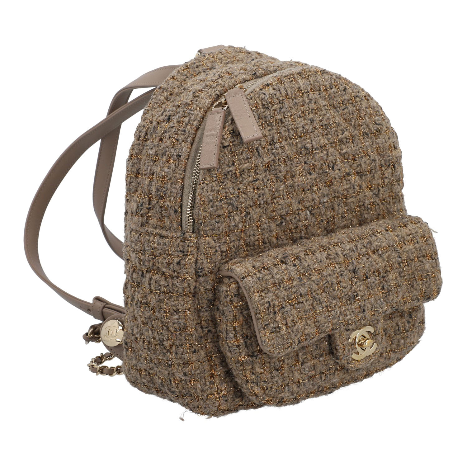 Ventes privées 2020 (Mitarbeiterkauf). Aus Wollbouclé in Hellbraun mit goldfarbenen Details und klassischer Steppung. Ein kleines Außenfach mit Überschlag und CC-Drehverschluss, Hauptfach mit Reißverschluss, längenverstellbare Trageriemen mit Gliederkettendekor. Innenfutter aus Textil. Leichte Gebrauchsspuren vorhanden. 20x11x22cm.