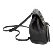 Schwarzes Kaviar Leder mit goldfarbener Hardware, teilweise Rautensteppung, Außenfach mit Reißverschluss, Hauptfach mit Überschlag, CC-Logo-Drehverschluss und Zugband, ein Henkel mit Lede durchflochten und Trageriemen aus Leder. Innenraum mit einem Reißverschlussfach. Gebrauchsspuren vorhanden, Flecken am Boden. 23 x 15 x 21 cm.