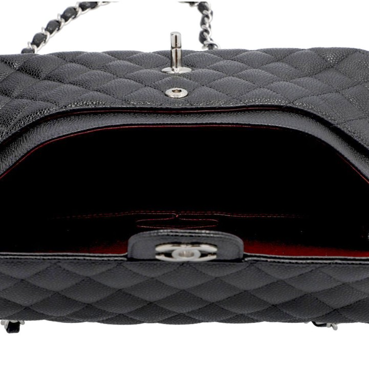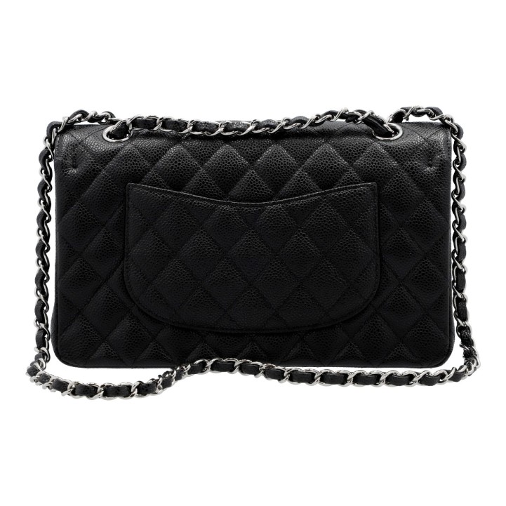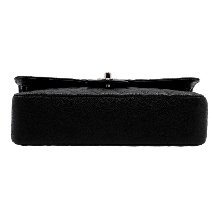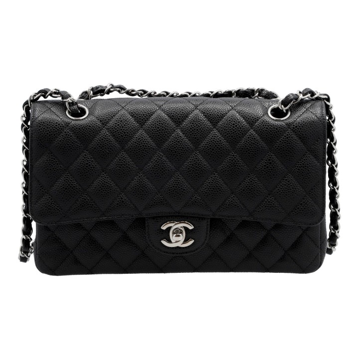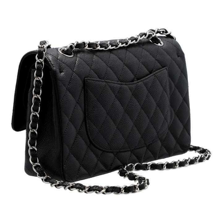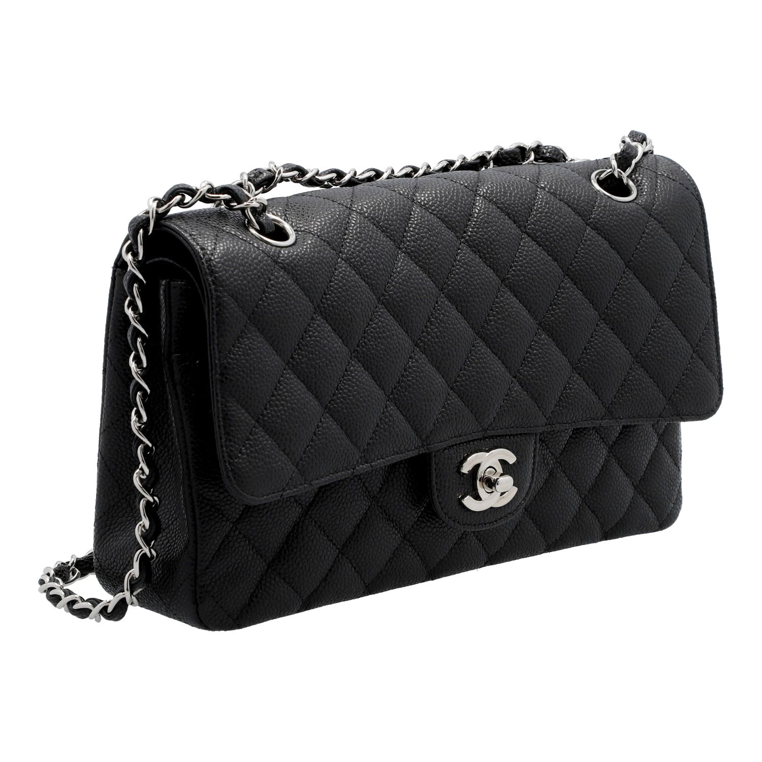 Akt. NP: 10.300,- €. Kaviarleder in Schwarz mit Rautensteppung, silberfarbener Hardware, doppeltem Überschlag mit CC-Logo-Drehverschluss, Außenfach auf der Rückseite und Kettenriemen mit Leder durchflochten. Innenraum in Bordeaux mit diversen Fächern. Staubbeutel anbei. Tragespuren vorhanden. 25.5 x 6.5 x 15.5 cm.