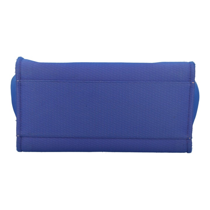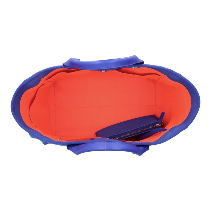 Modell in Blau mit silberfarbener Hardware, Glattlederdetails, Logo-Stickerei auf der Front in Orange, kurze und lange Doppelhenkel. Innenraum in Orange mit drei Fächer, eines davon mit Reißverschluss. ID-Card und Rechnung anbei. Leichter Abrieb und leichte Flecken vorhanden. 38x20x29cm.