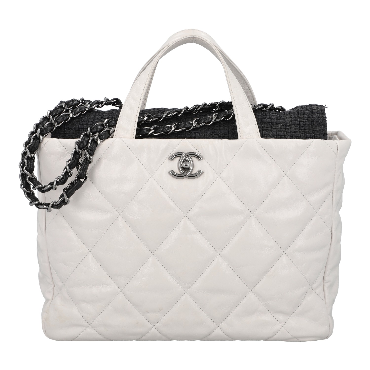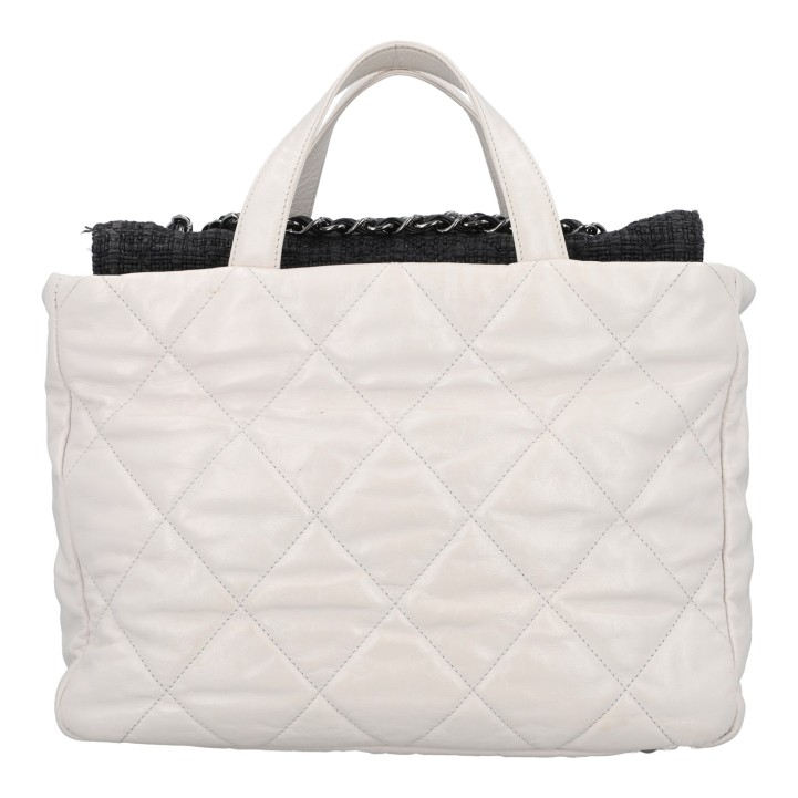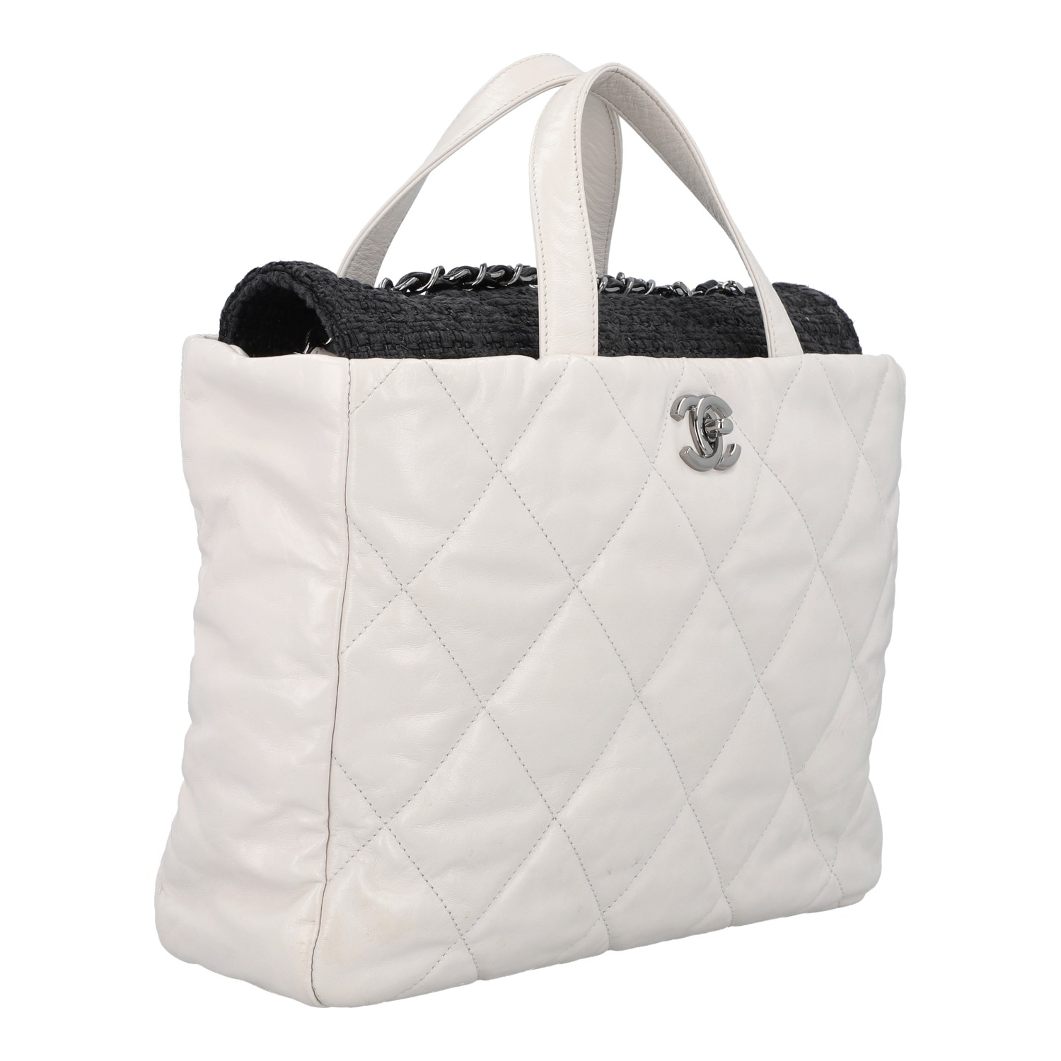 Weißes Leder mit Rautensteppung, silberfarbener Hardware und CC-Logo-Drehverschluss. Überschlag aus grauem Tweed, Doppelhenkel sowie Doppelriemen aus Kette mit durchflochtenem Leder. Innenraum aus Satin mit drei Fächern. Diverse Gebrauchsspuren und Flecken vorhanden. 34 x 8 x 24 cm.