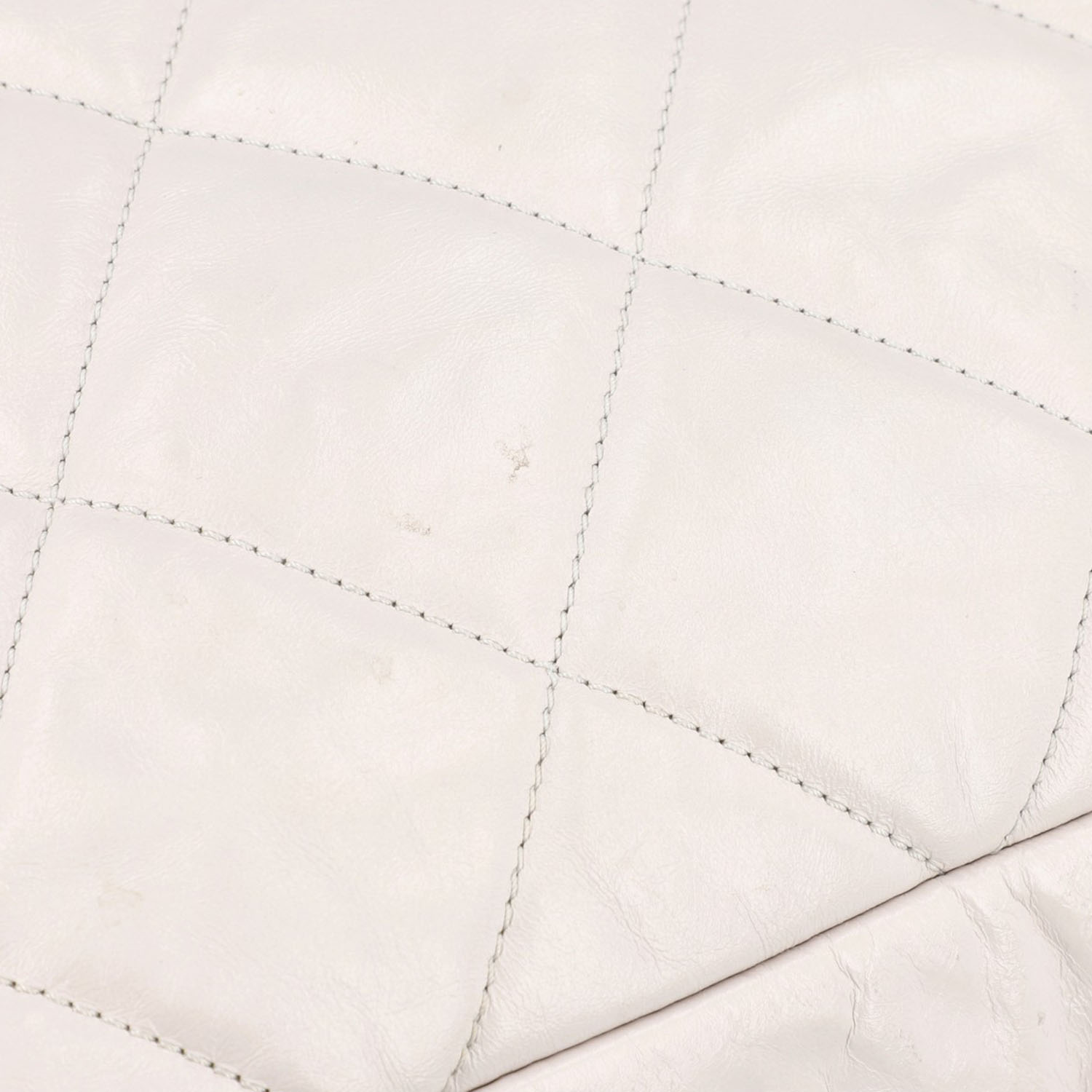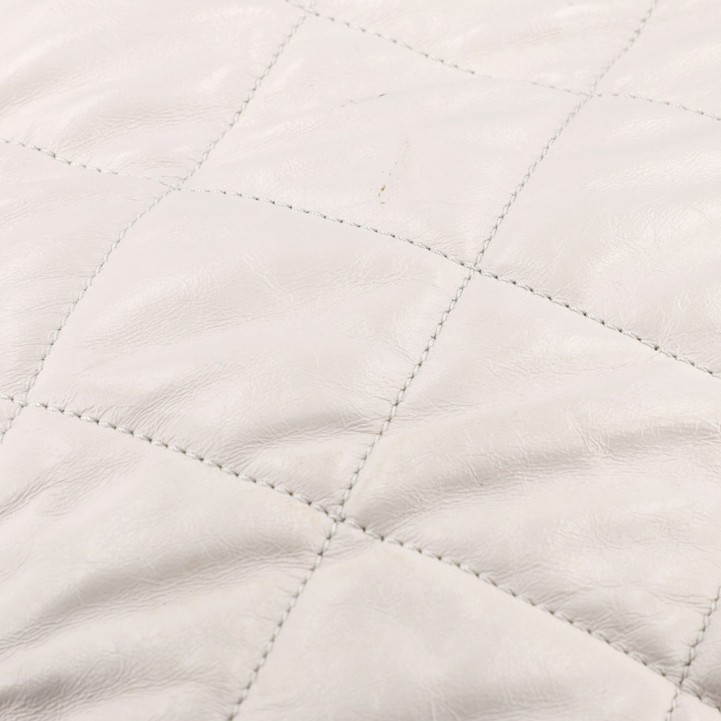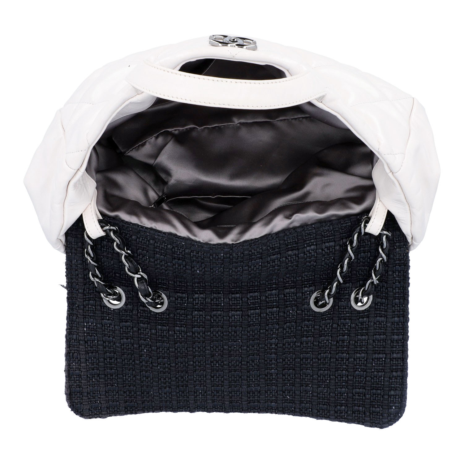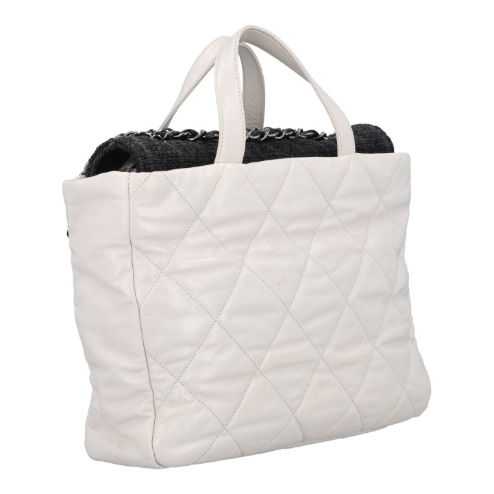 Weißes Leder mit Rautensteppung, silberfarbener Hardware und CC-Logo-Drehverschluss. Überschlag aus grauem Tweed, Doppelhenkel sowie Doppelriemen aus Kette mit durchflochtenem Leder. Innenraum aus Satin mit drei Fächern. Diverse Gebrauchsspuren und Flecken vorhanden. 34 x 8 x 24 cm.