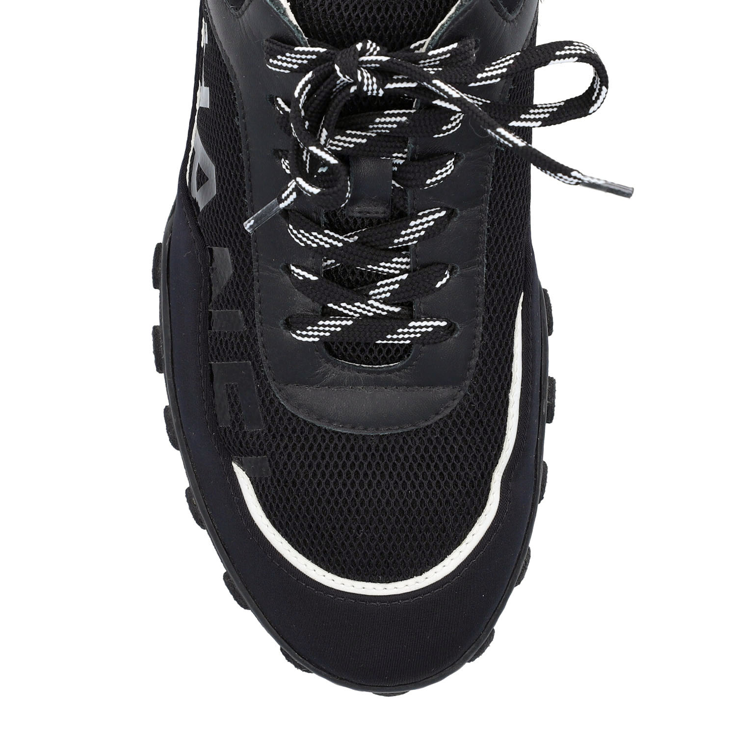 Schwarzes Modell aus einem Materialmix aus Neopren, Mesh und Leder. Staubbeutel anbei. Tragespuren vorhanden.