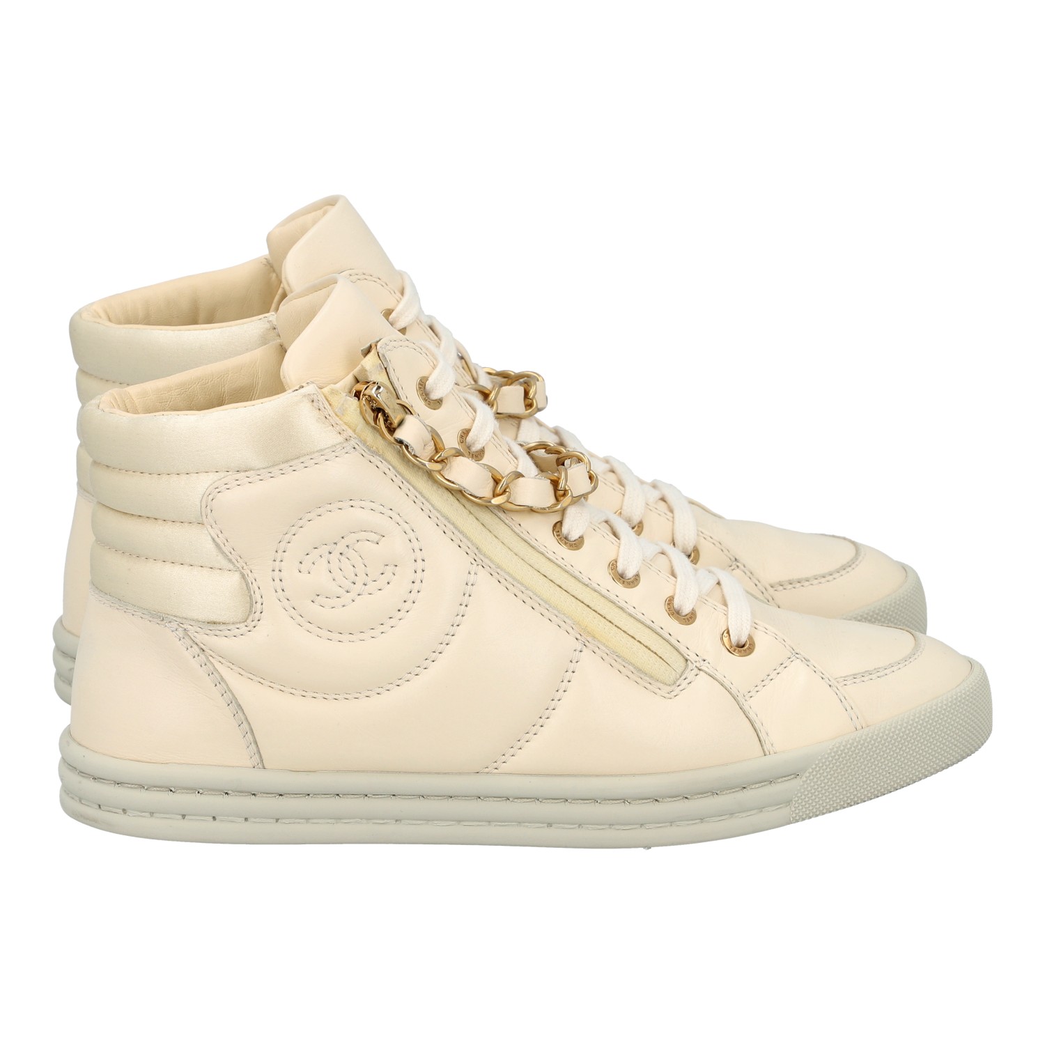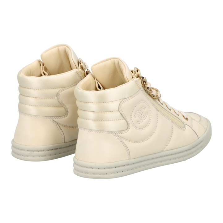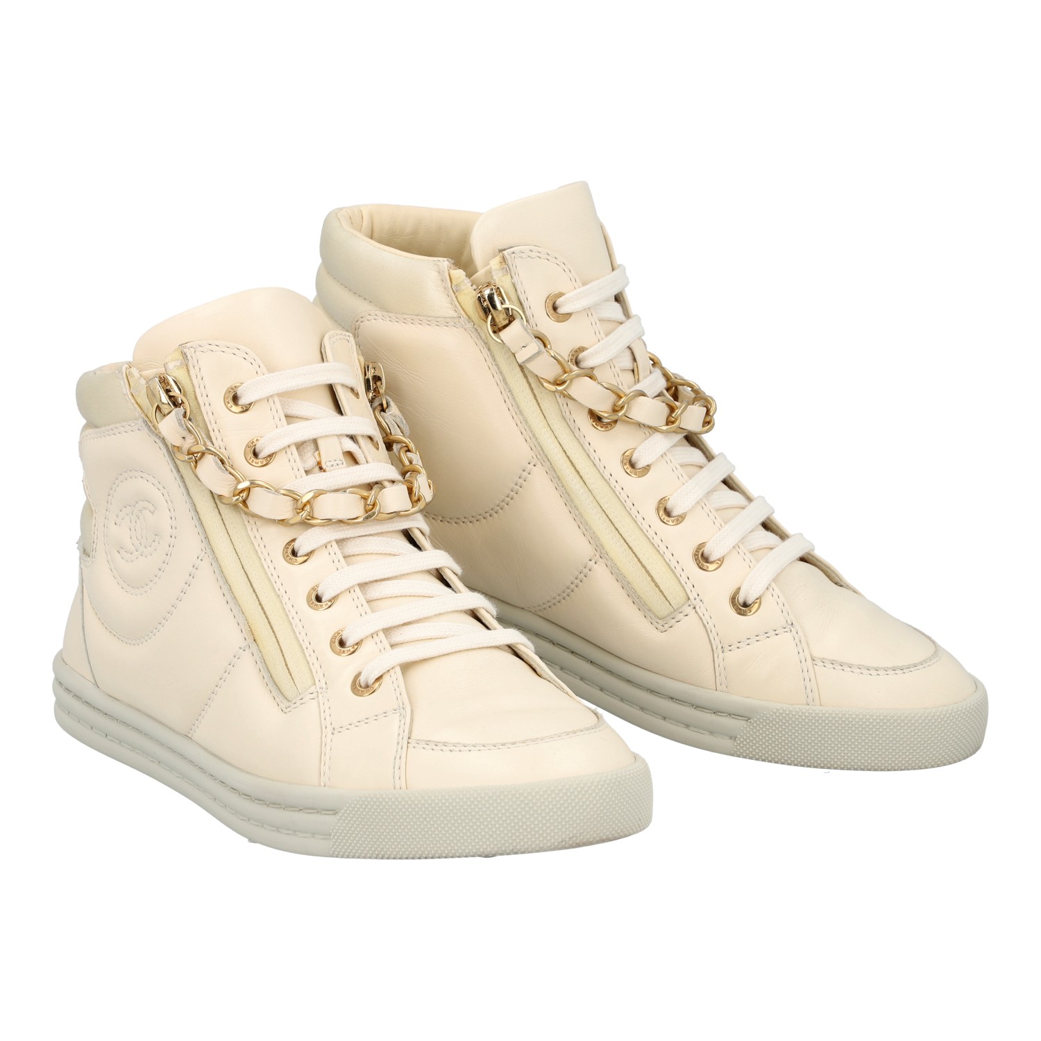 Beigefarbenes High-Top-Modell mit goldfarbener Hardware, CC-Logo und Reißverschlüssen mit Zippern aus Kette, durchflochten mit Leder. Tragespuren vorhanden.