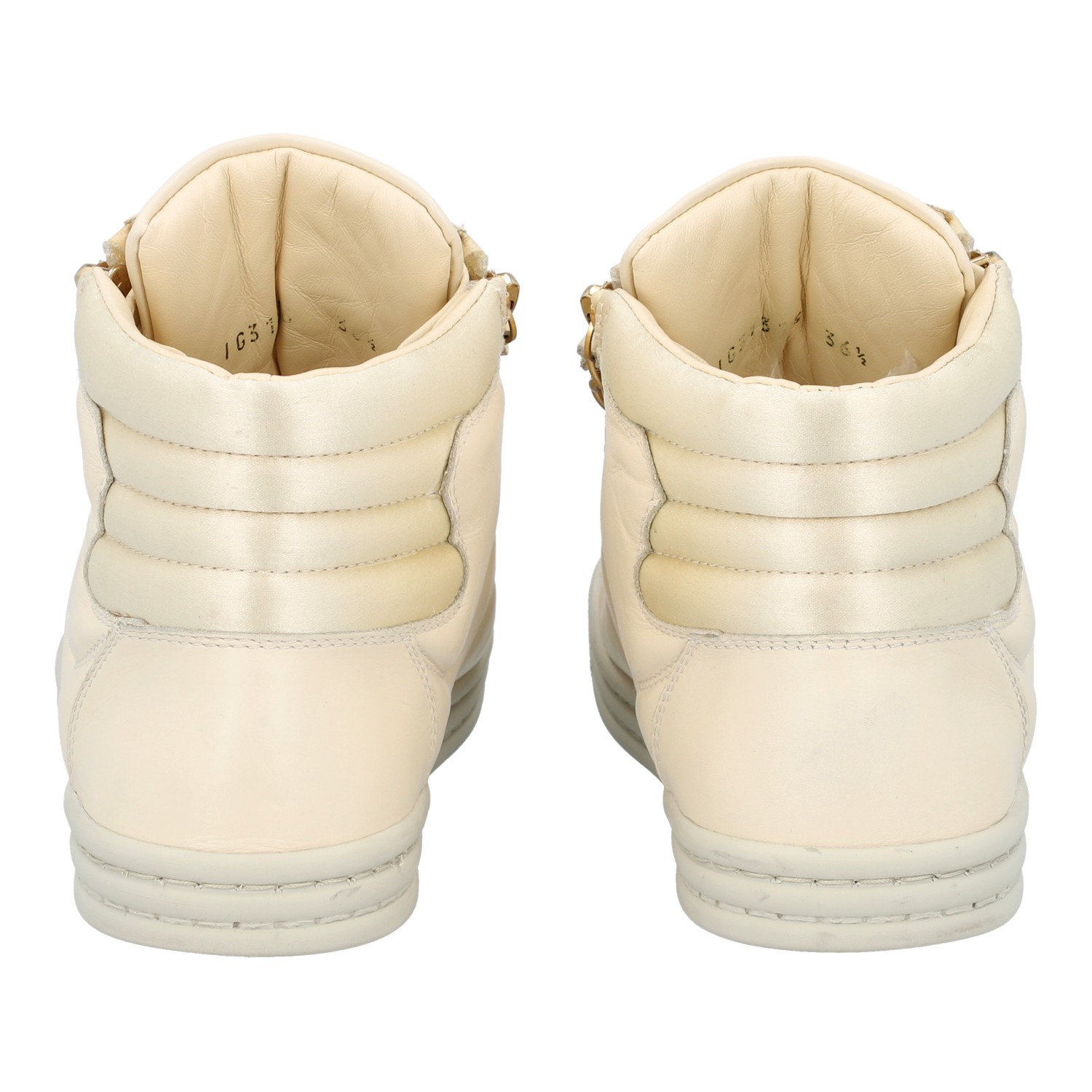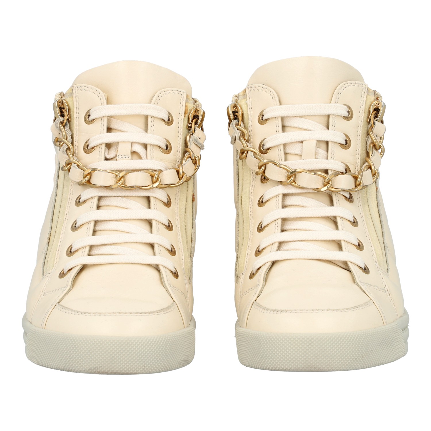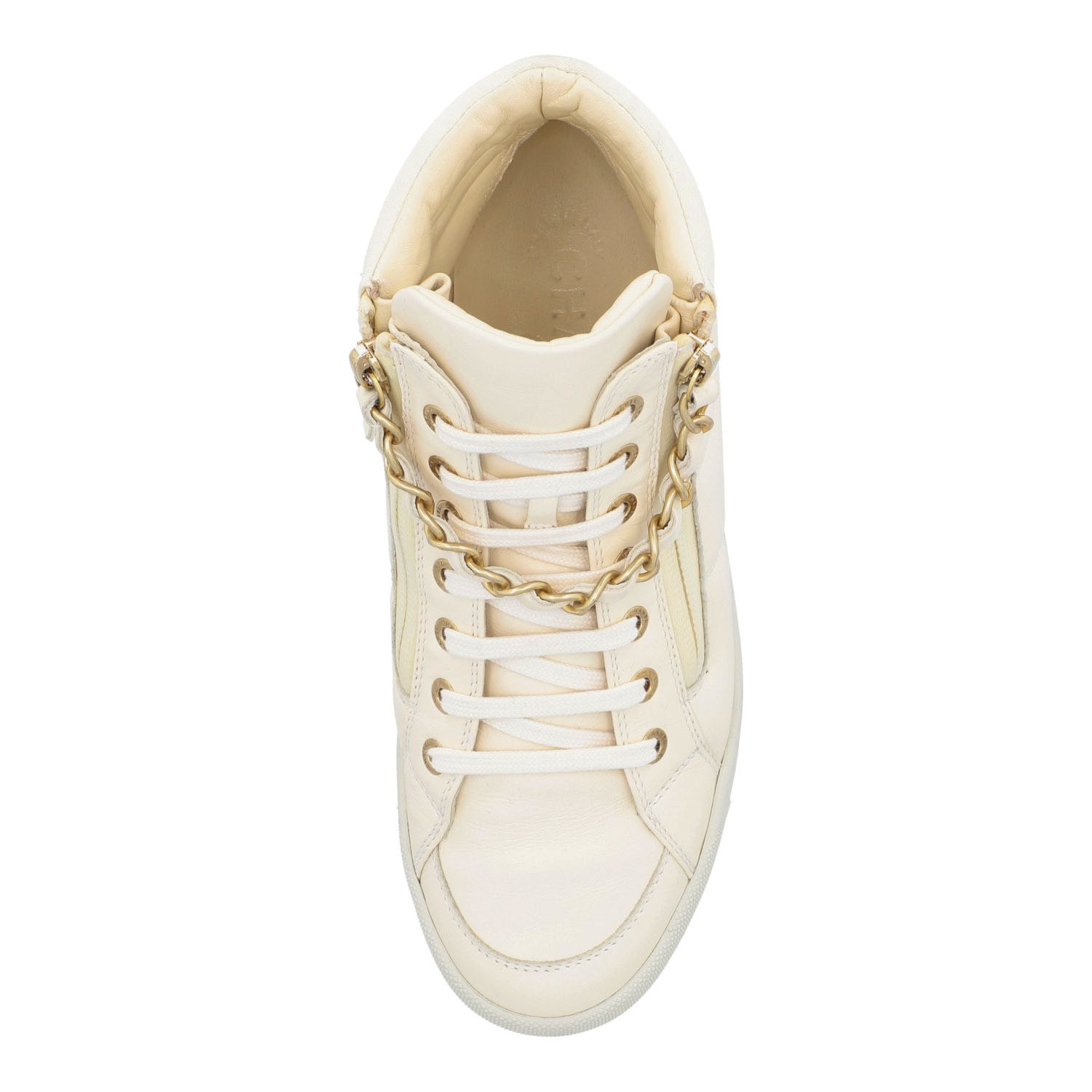 Beigefarbenes High-Top-Modell mit goldfarbener Hardware, CC-Logo und Reißverschlüssen mit Zippern aus Kette, durchflochten mit Leder. Tragespuren vorhanden.