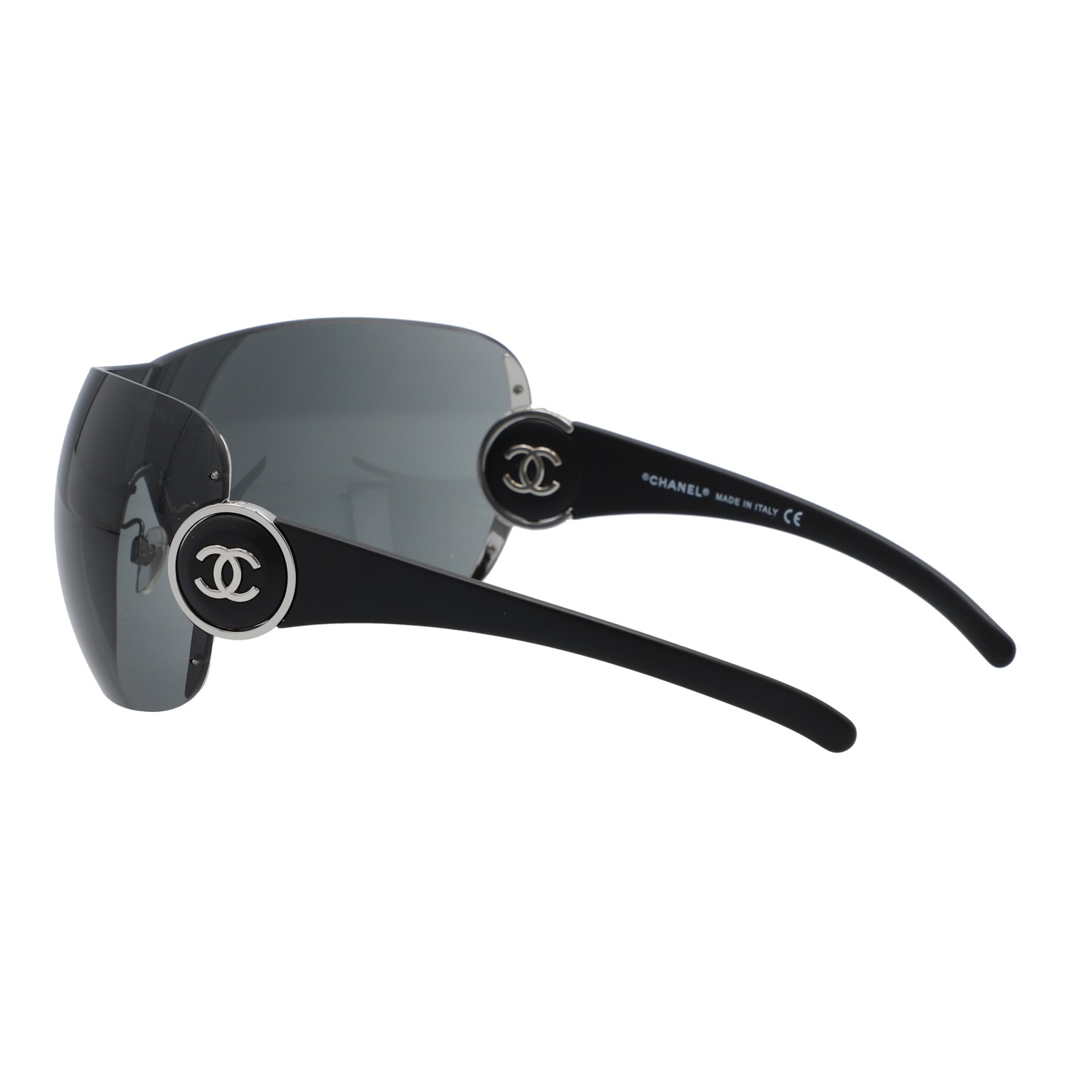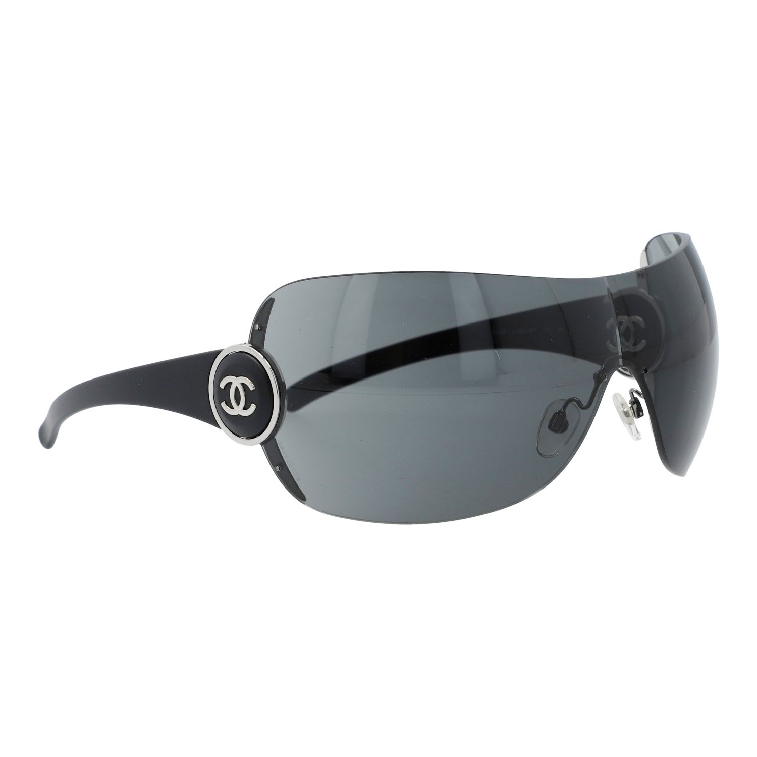 Getönte Scheibenbrille in Schwarz mit silberfarbenem CC-Logo Dekor am Bügel. Etui anbei. Guter Erhalt.