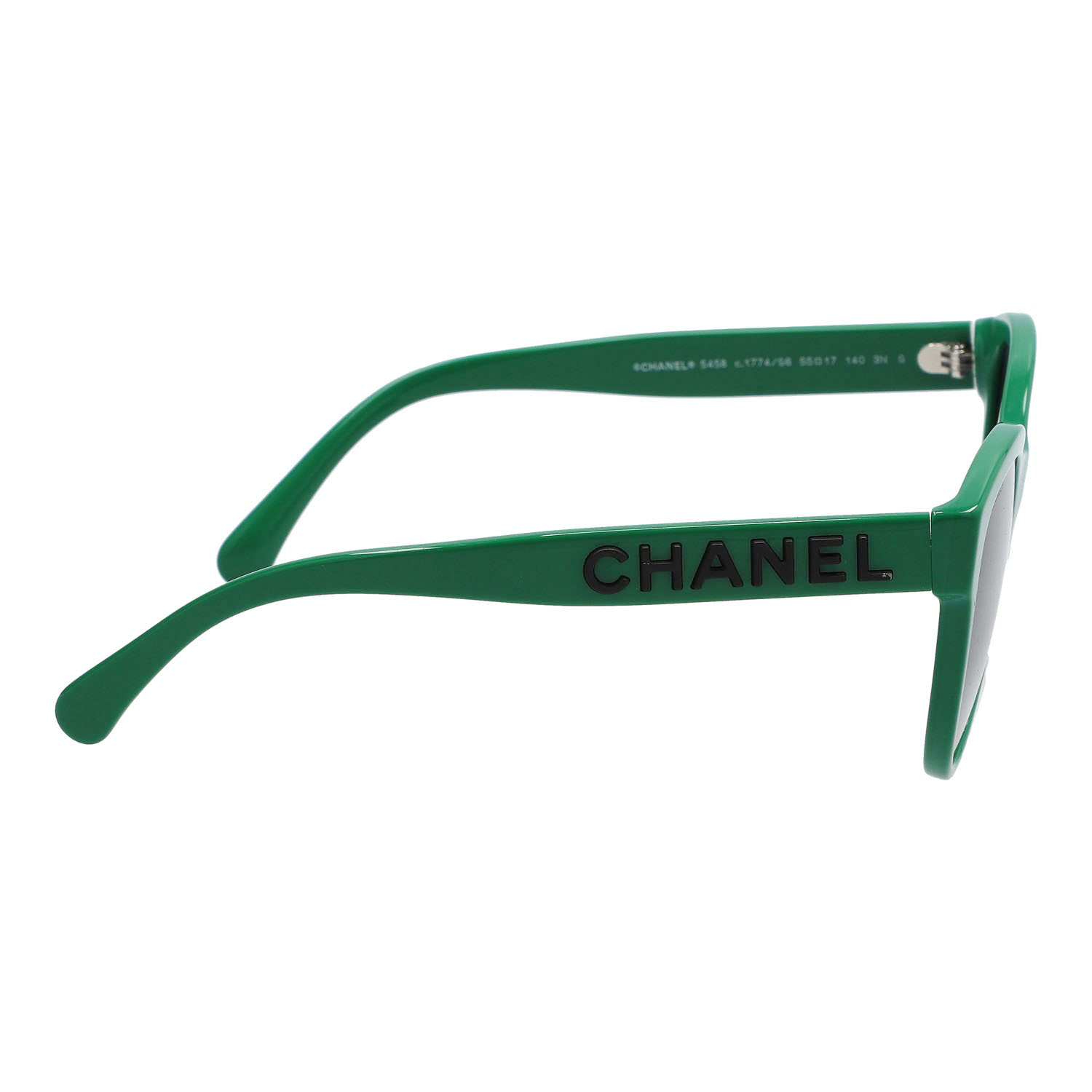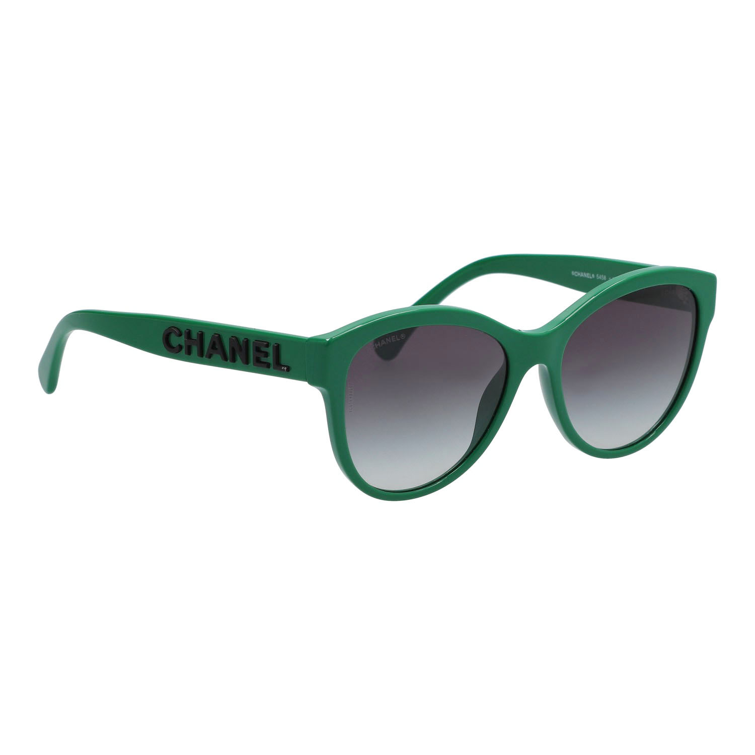 Gestell in Grün mit getönten Gläsern und schwarzem Chanel Schriftzug auf den Bügeln. Etui anbei. Guter Erhalt.