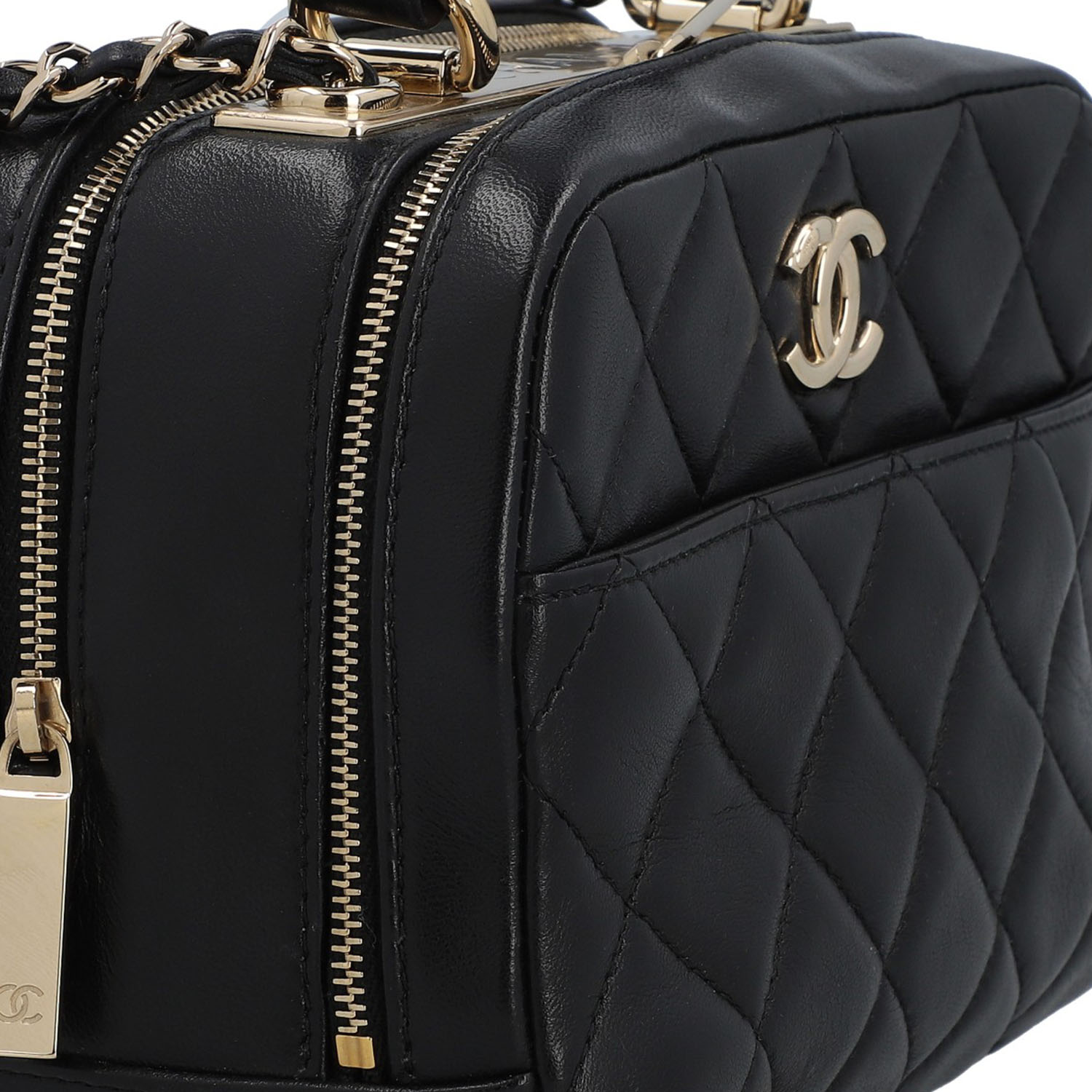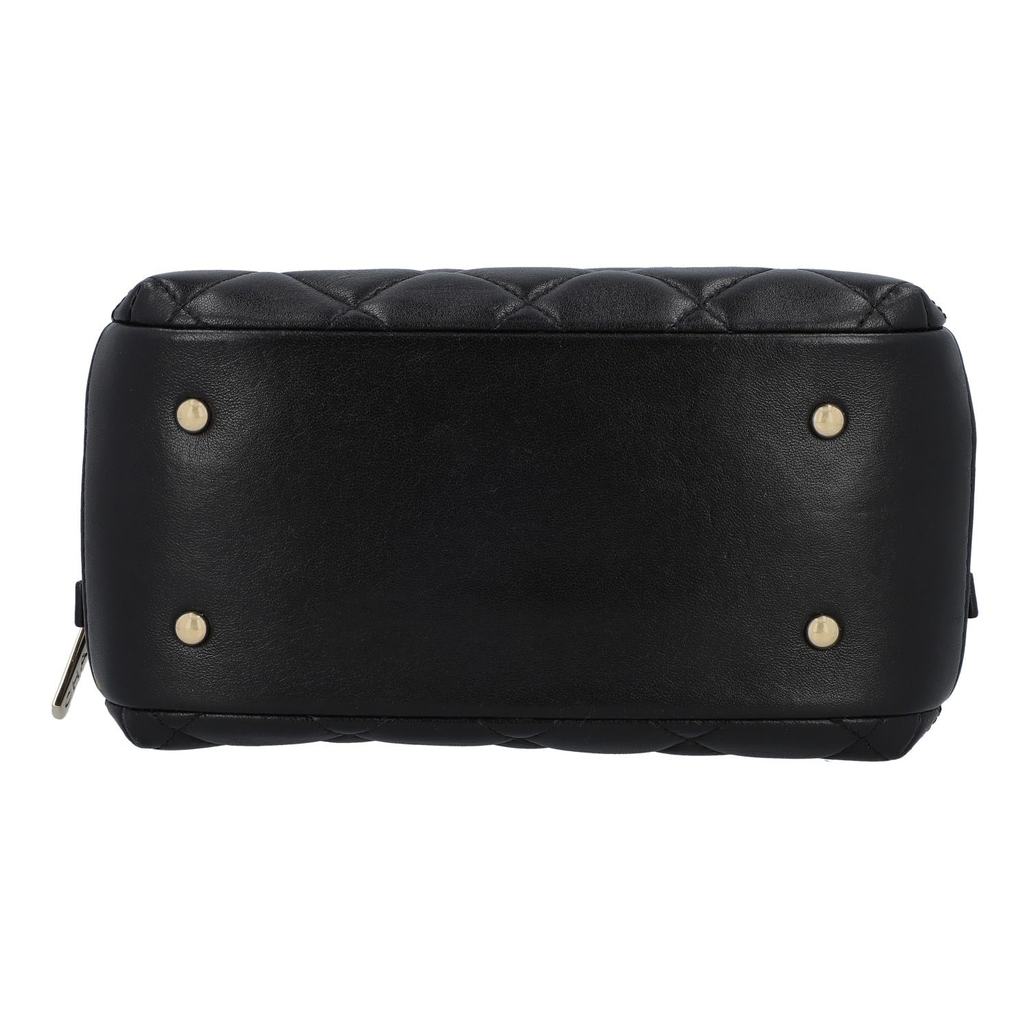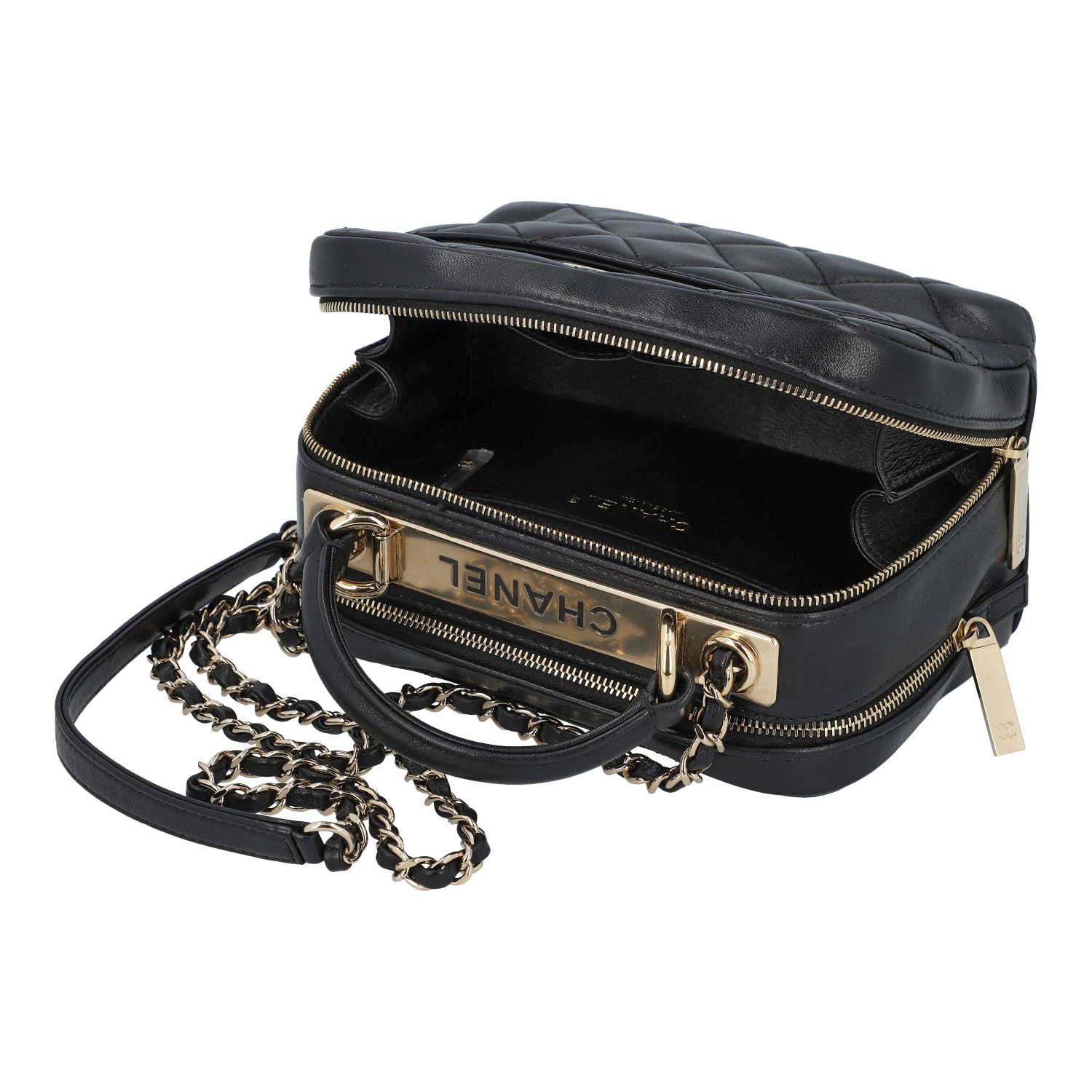 Lammleder in Schwarz mit Rautensteppung, goldfarbener Hardware, Außenfach auf der Front, CC-Logo, Henkel und Schulterriemen aus Kette mit Leder durch flochten. Innenraum mit vier Fächern, eines mit Reißverschluss. Box, Staubbeutel, Rechnung und ID-Card anbei. Gebrauchsspuren vorhanden, Anrieb an den Kanten. 20 x 9 x 14 cm.