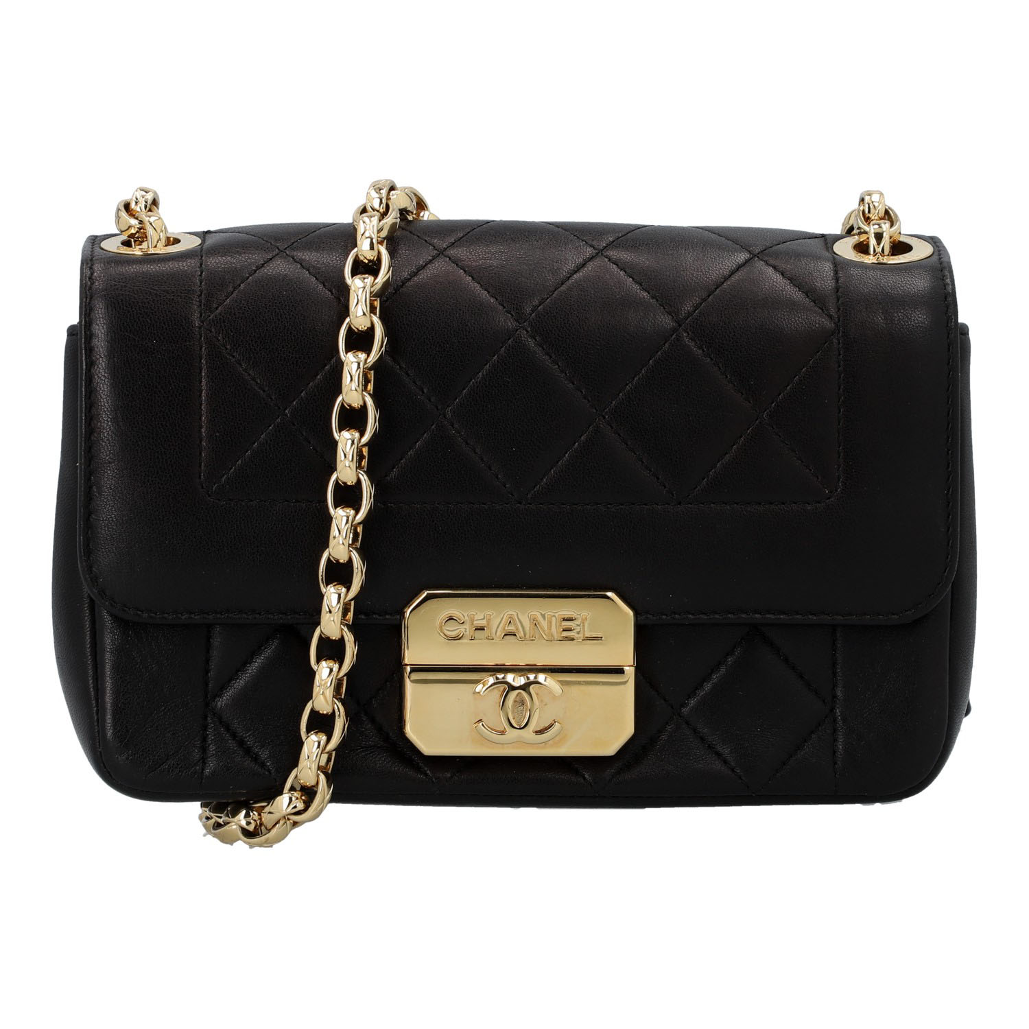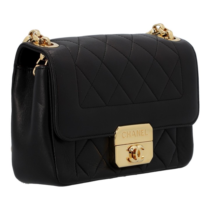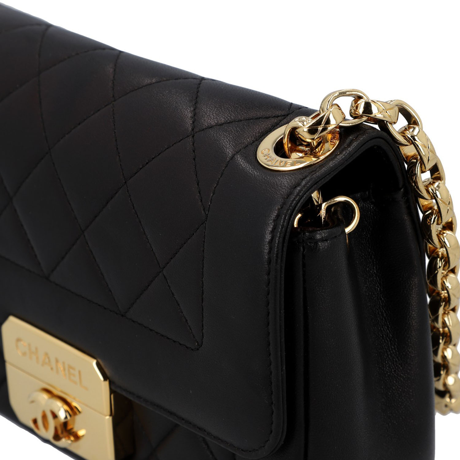 Schwarzes Lammleder in Rautensteppung, goldfarbene Hardware, Überschlag mit CC-Logo Steckverschluss, Gliederkettenriemen. Staubbeutel anbei. Leichte Gebrauchsspuren vorhanden. Box und Staubbeutel anbei. 18x5x12cm.