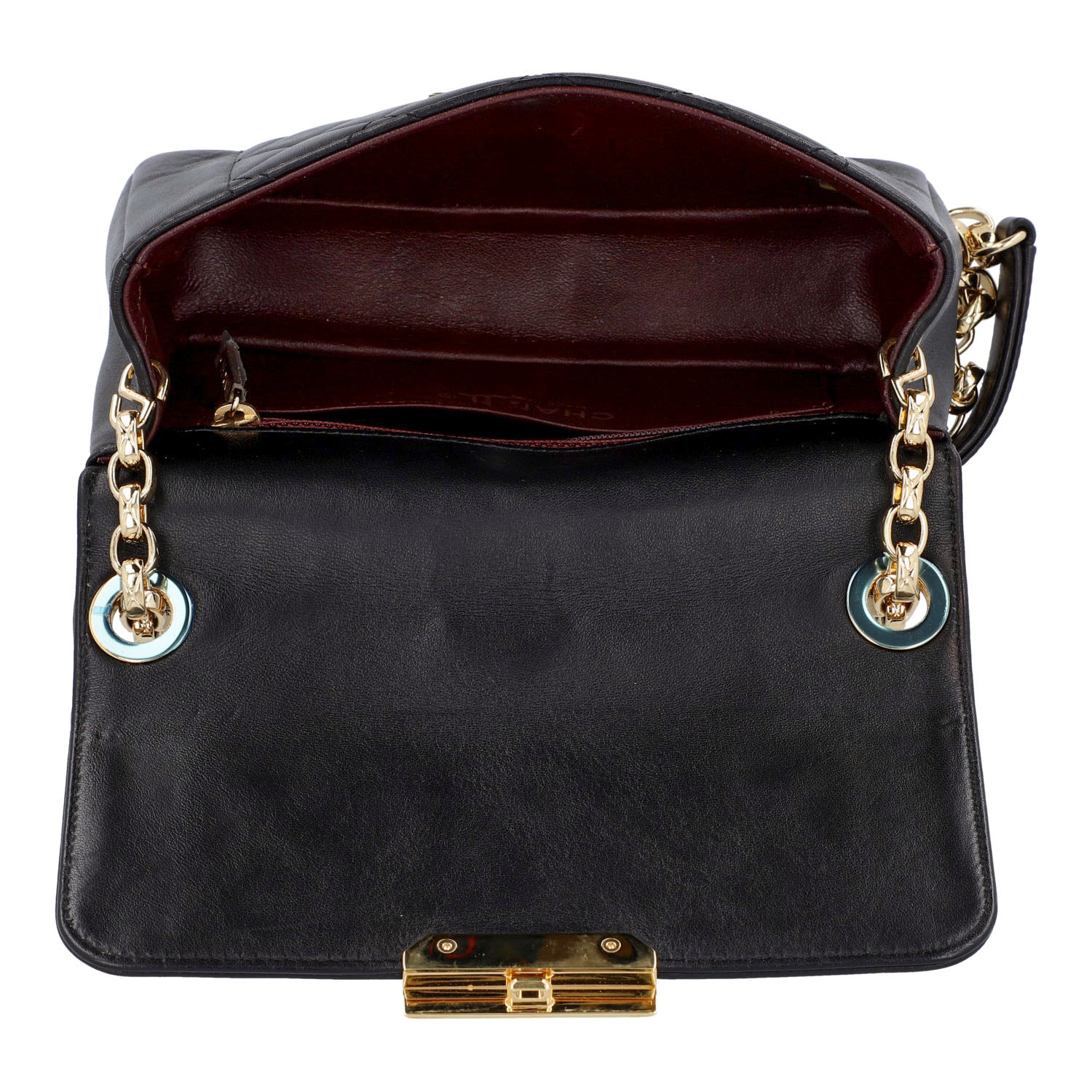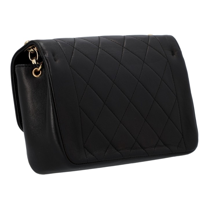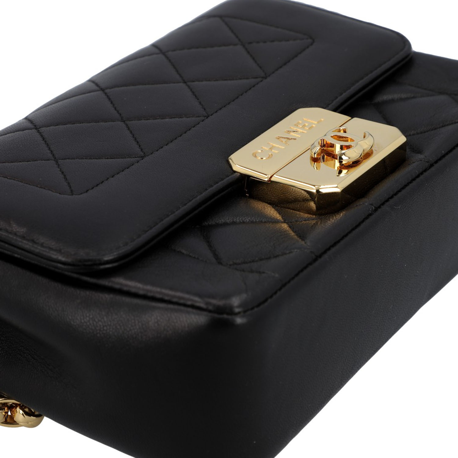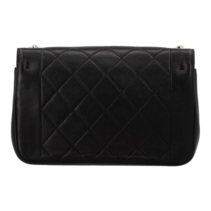 Schwarzes Lammleder in Rautensteppung, goldfarbene Hardware, Überschlag mit CC-Logo Steckverschluss, Gliederkettenriemen. Staubbeutel anbei. Leichte Gebrauchsspuren vorhanden. Box und Staubbeutel anbei. 18x5x12cm.