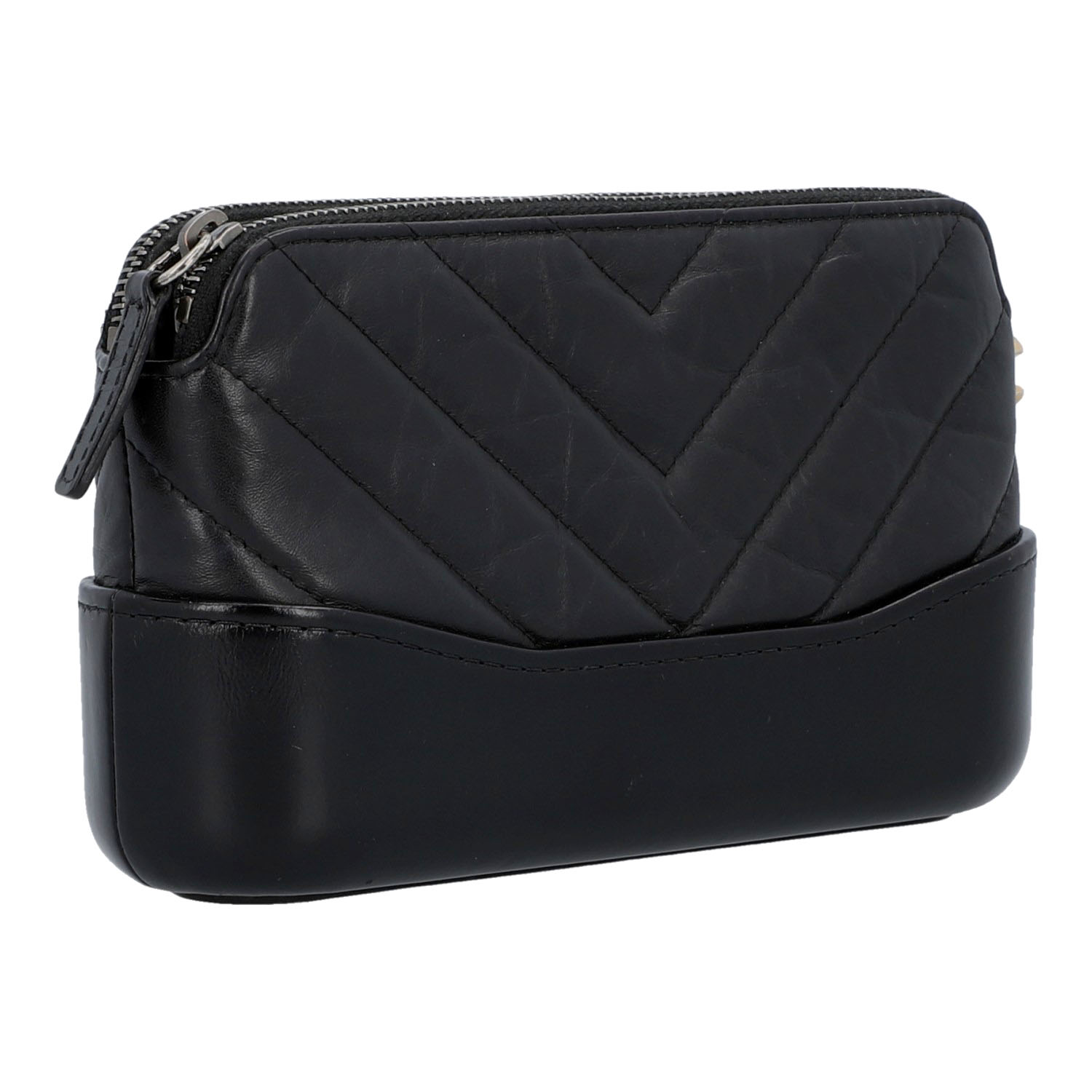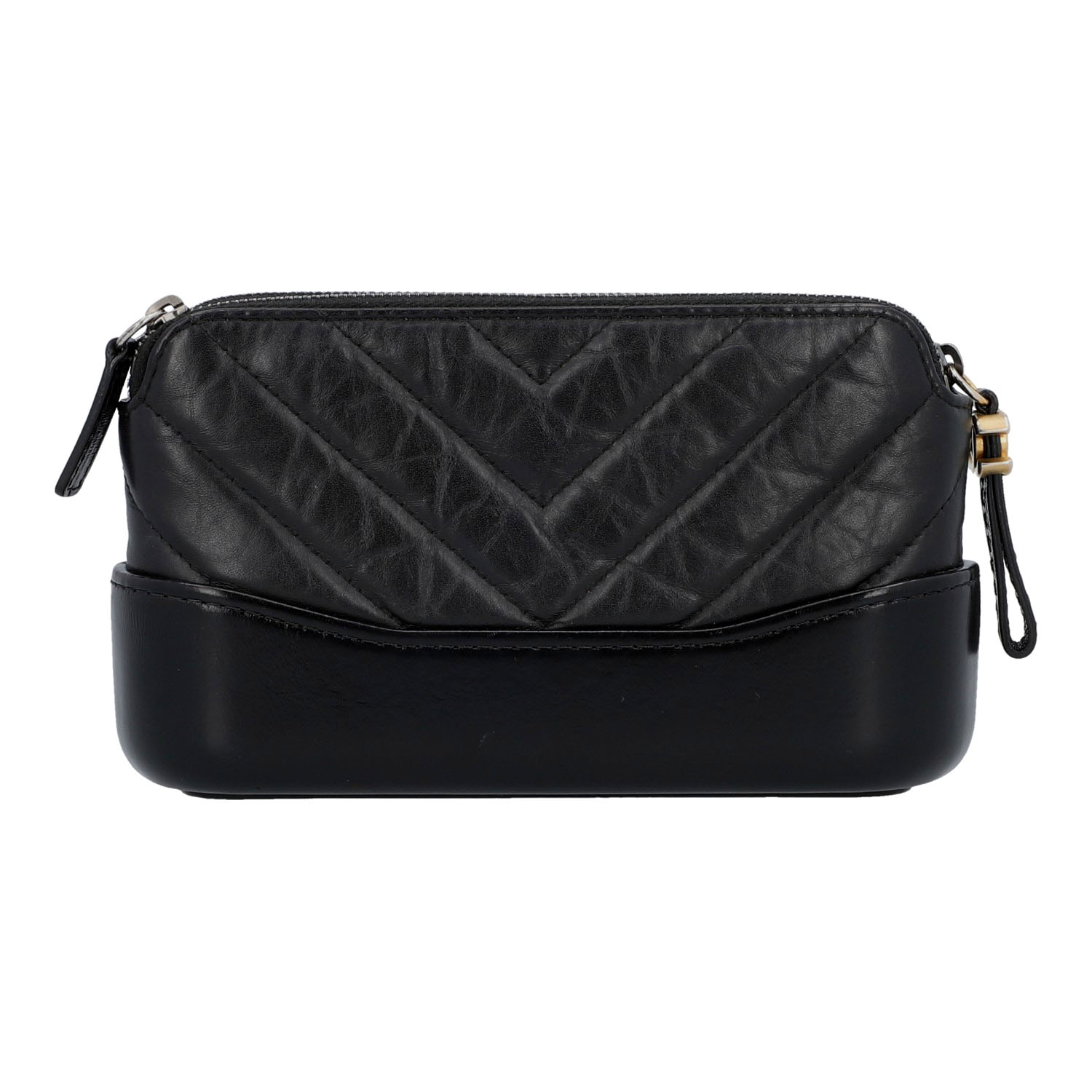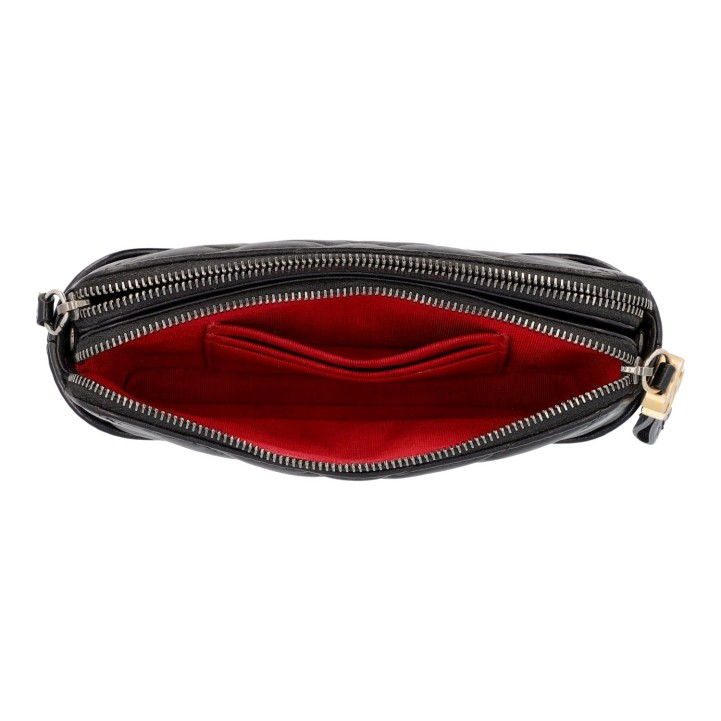 Koll. 2019. Lammleider in Schwarz mit Crashed-Design und feiner Steppung. Drei Hauptfächer, davon zwei mit Reißverschluss. Hardware in Tricolor. ID-Card anbei. Guter Erhalt. 18,5x6x11cm.