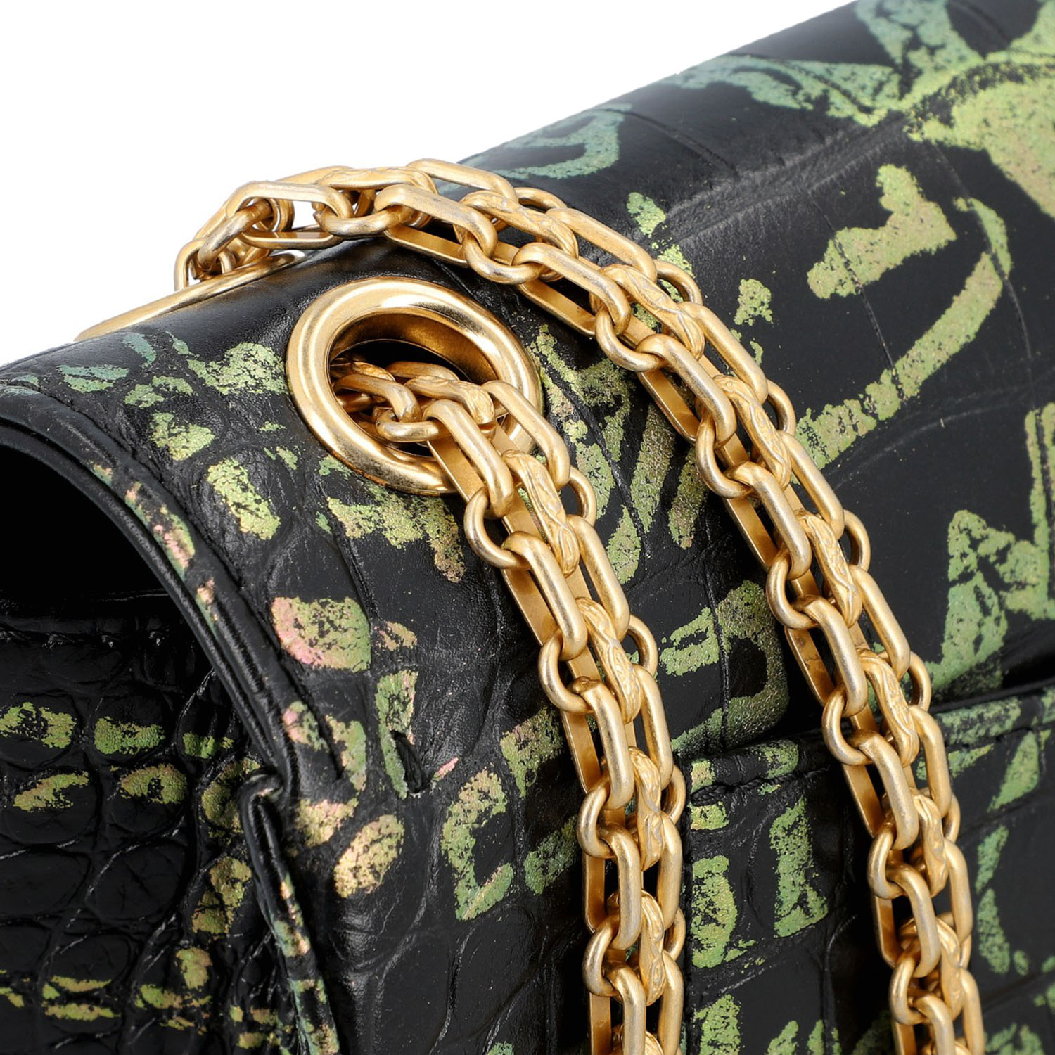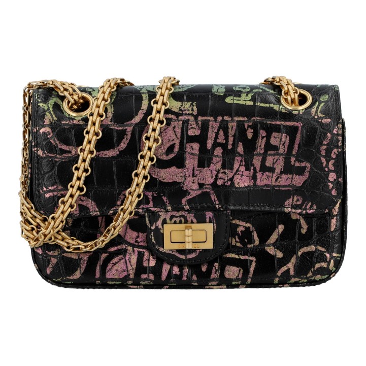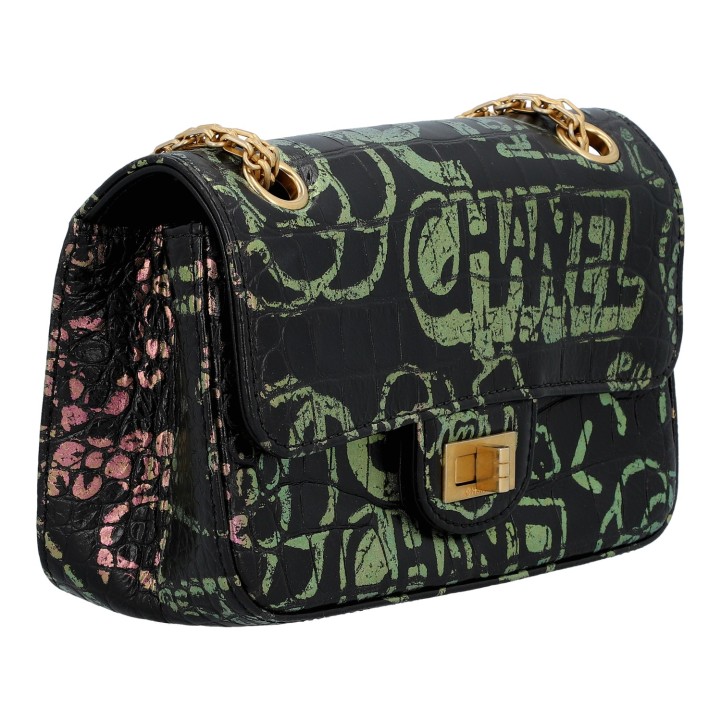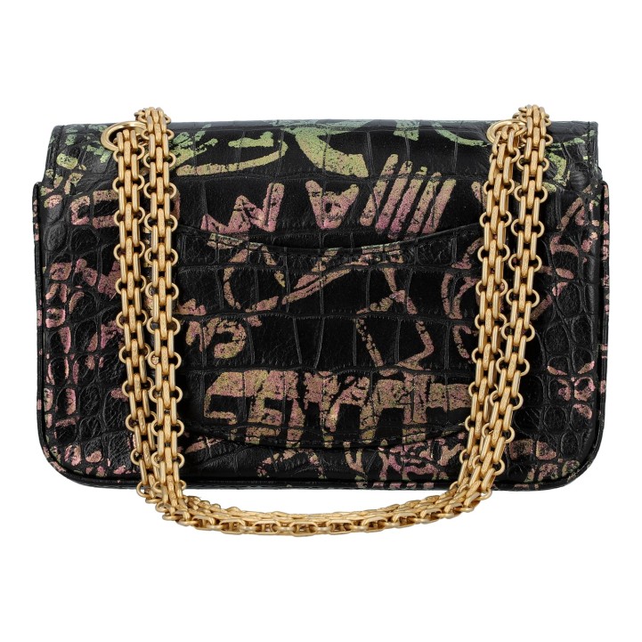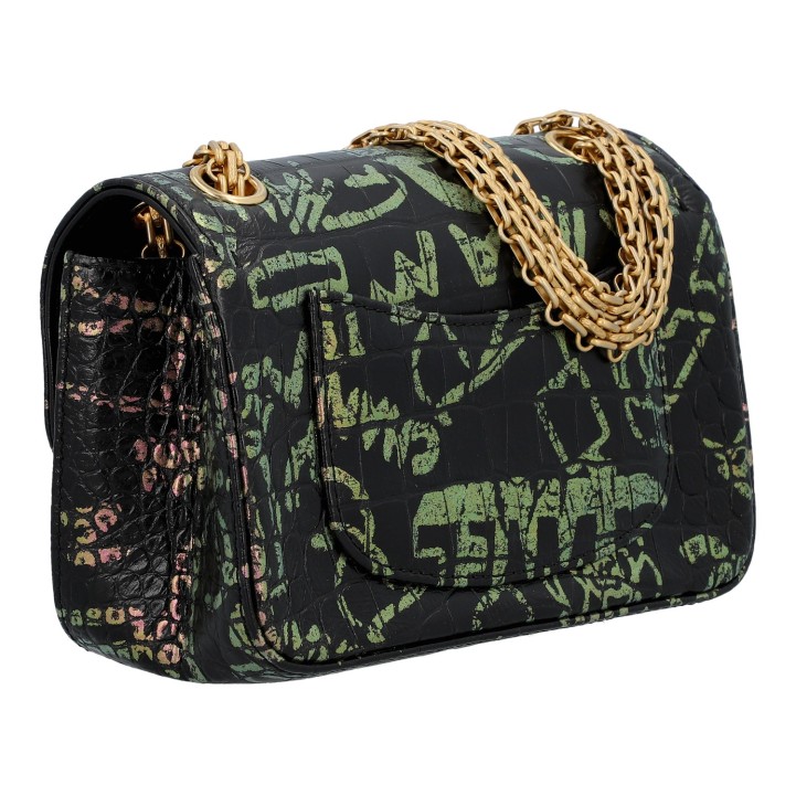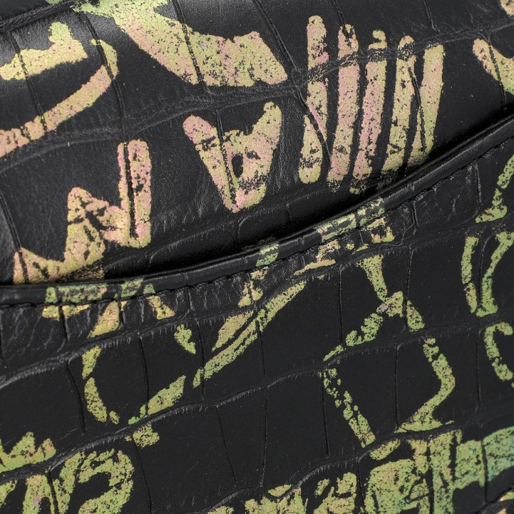 LIMITED EDITION. Schwarzes Leder mit Kroko-Prägung und Graffiti-Design, goldfarbene Hardware. Außenfach auf der Rückseite, Überschlag mit Drehverschluss und Kettenriemen. Innenraum mit zwei Fächern, eines davon mit Reißverschluss. Staubbeutel und ID-Card anbei. Diverse Gebrauchsspuren, Kratzer im Innenraum. 20 x 8 x 13 cm.