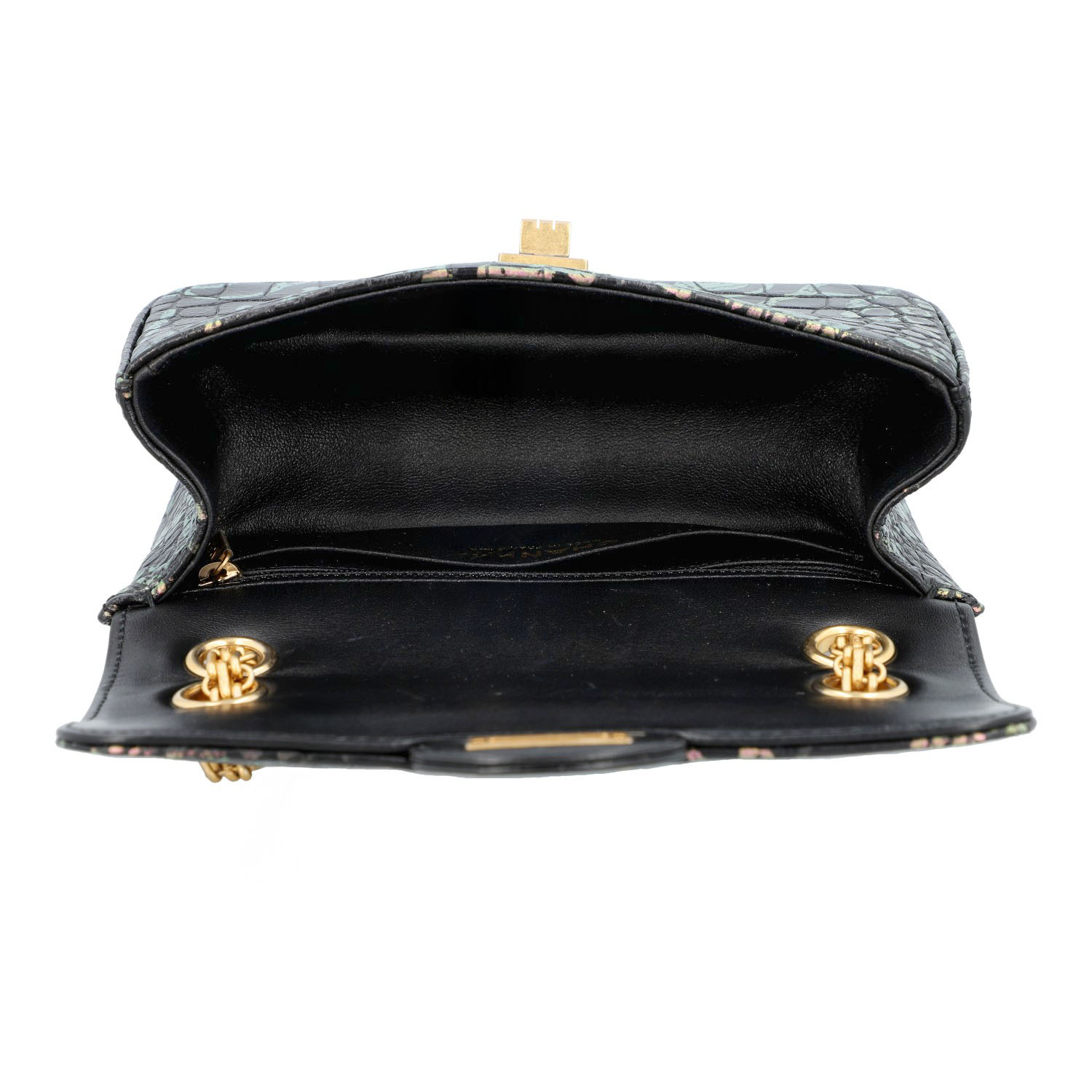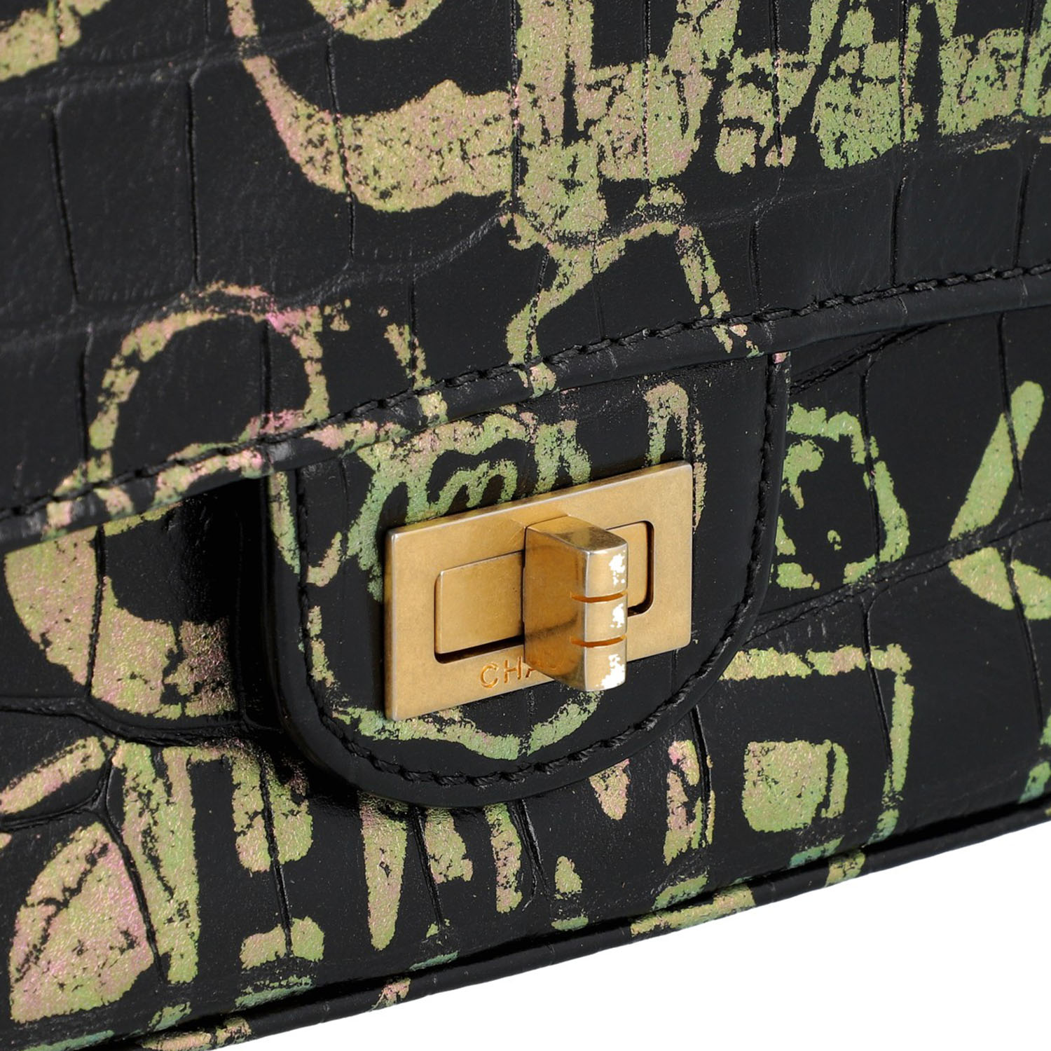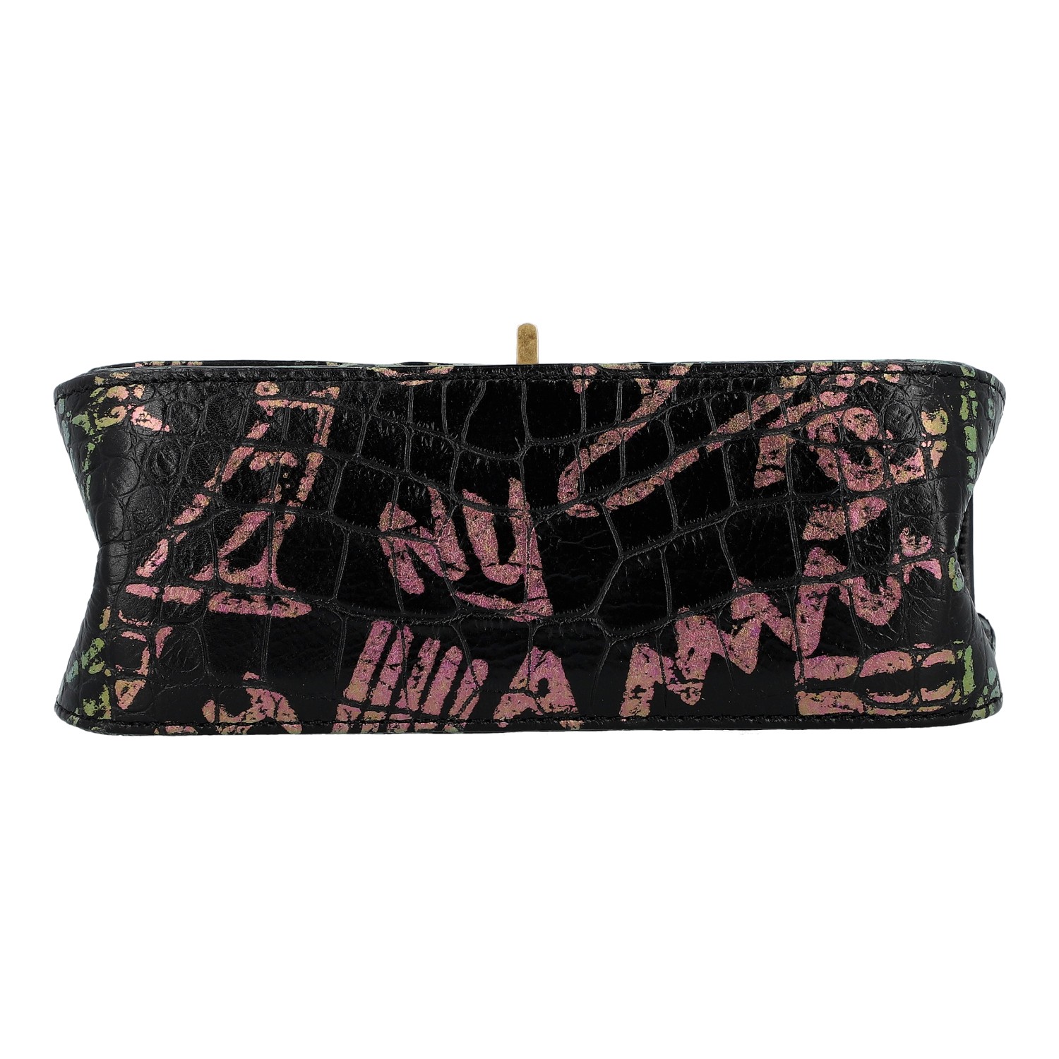 LIMITED EDITION. Schwarzes Leder mit Kroko-Prägung und Graffiti-Design, goldfarbene Hardware. Außenfach auf der Rückseite, Überschlag mit Drehverschluss und Kettenriemen. Innenraum mit zwei Fächern, eines davon mit Reißverschluss. Staubbeutel und ID-Card anbei. Diverse Gebrauchsspuren, Kratzer im Innenraum. 20 x 8 x 13 cm.
