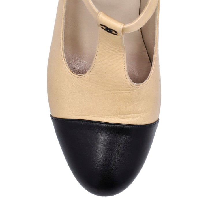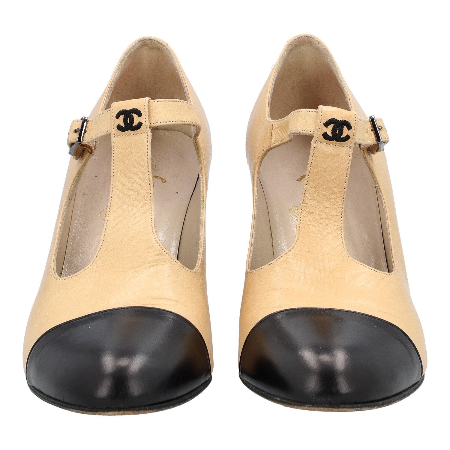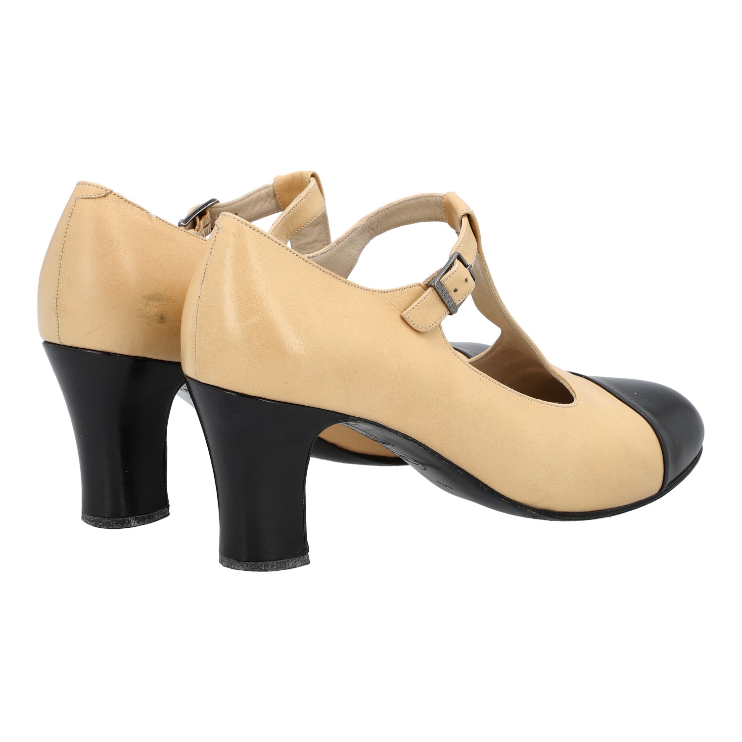 Beigefarbenes Glattleder mit schwarzer Kappe, Riemendekor, Schließe und 7 cm hohem Blockabsatz. Staubbeutel anbei. Tragespuren vorhanden.