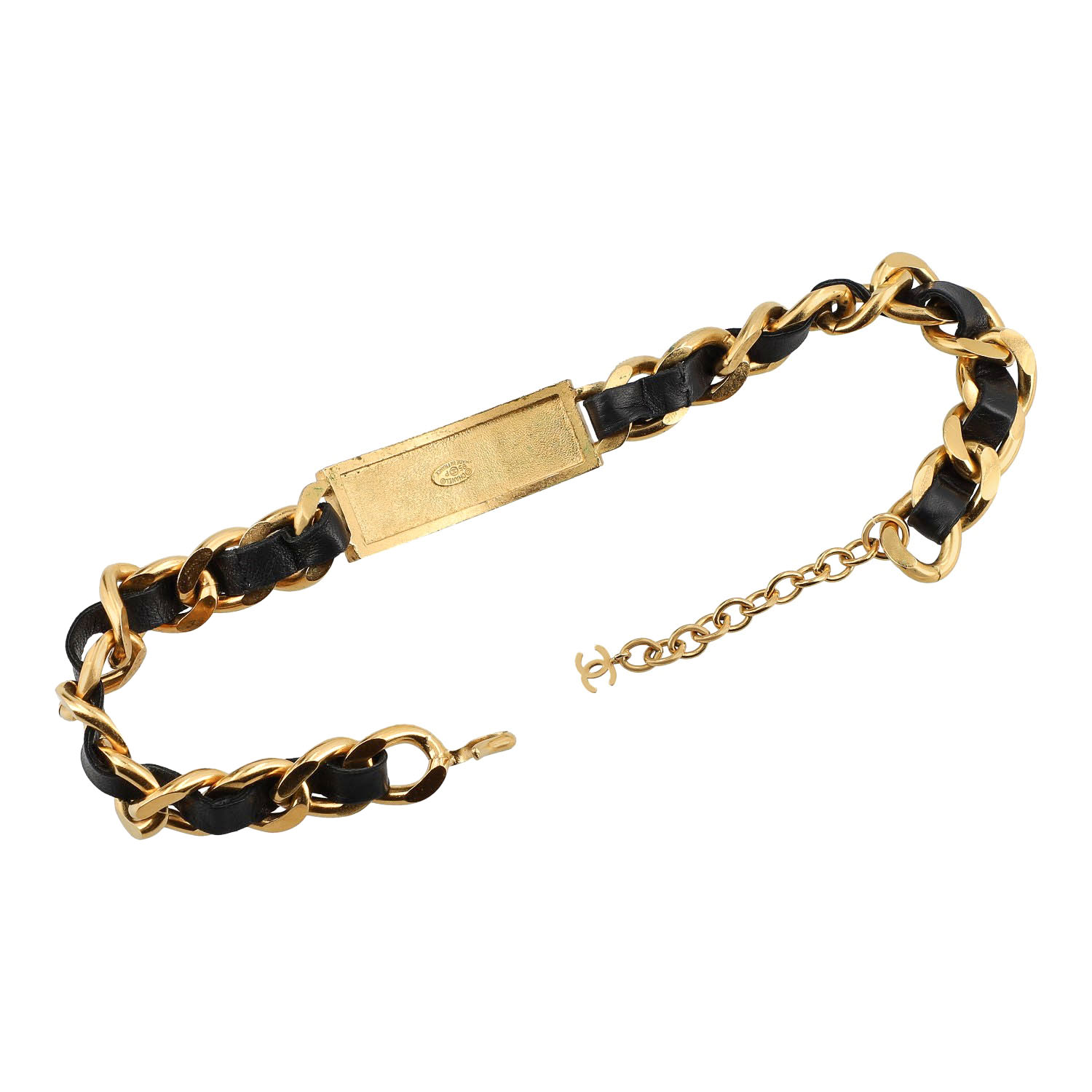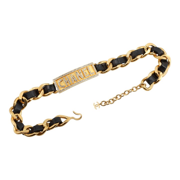 BARBIE KOLLEKTION. SAMMLERSTÜCK. RARITÄT.Vergoldete Gliederkette mit schwarzem Leder durchflochten, Logo-Plakette mit Glassteinbesatz. Box anbei. Leichte Oxidation auf der Rückseite.