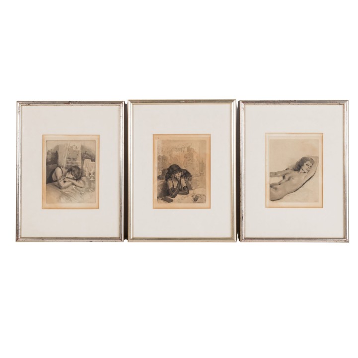 1.) Dame mit Hut am Tisch sitzend; 2.) Dame am Tisch auf Armen schlafend; 3.) Damenakt