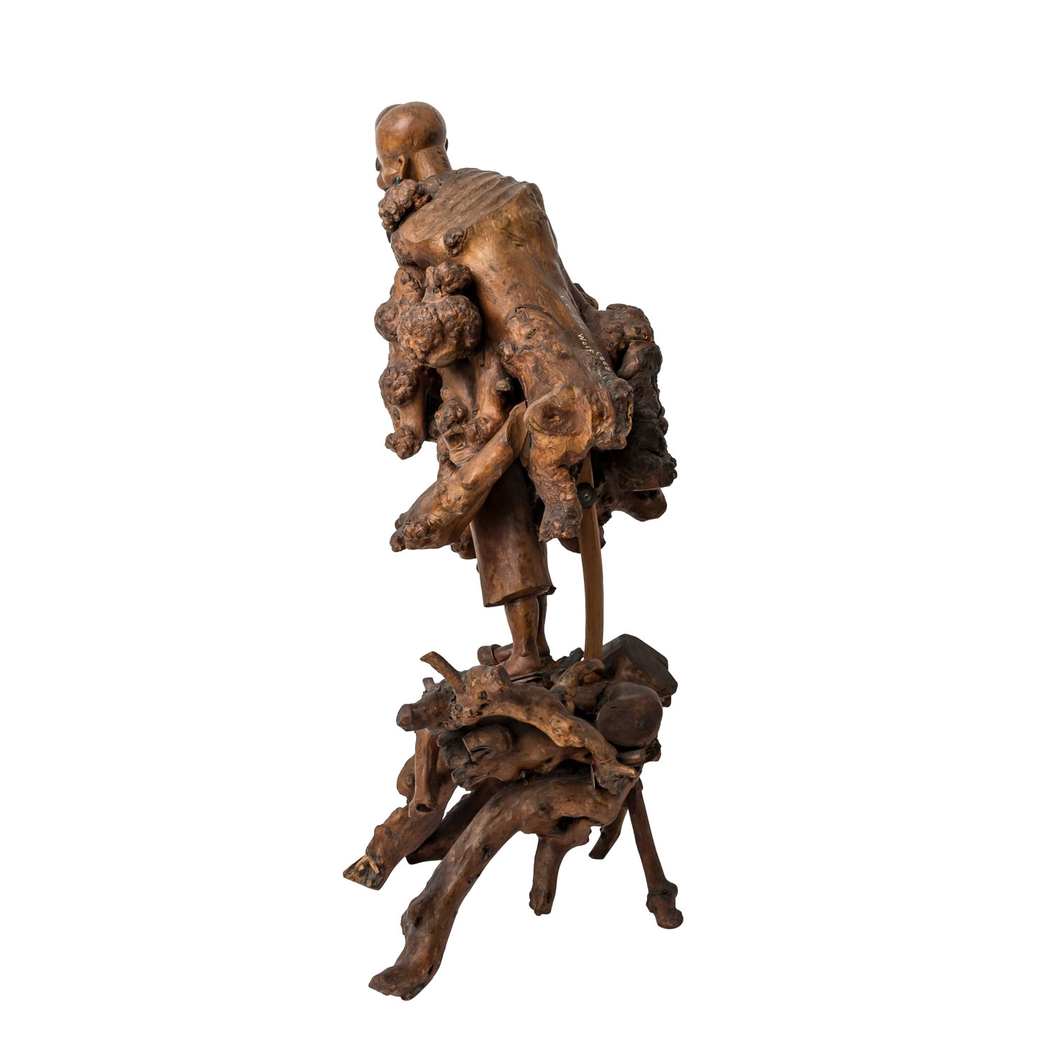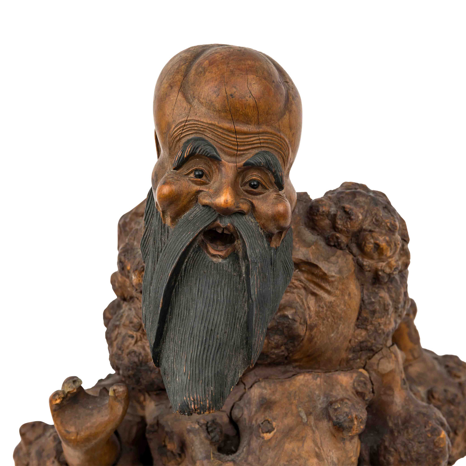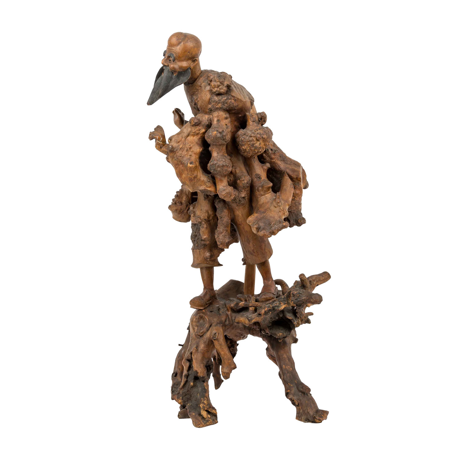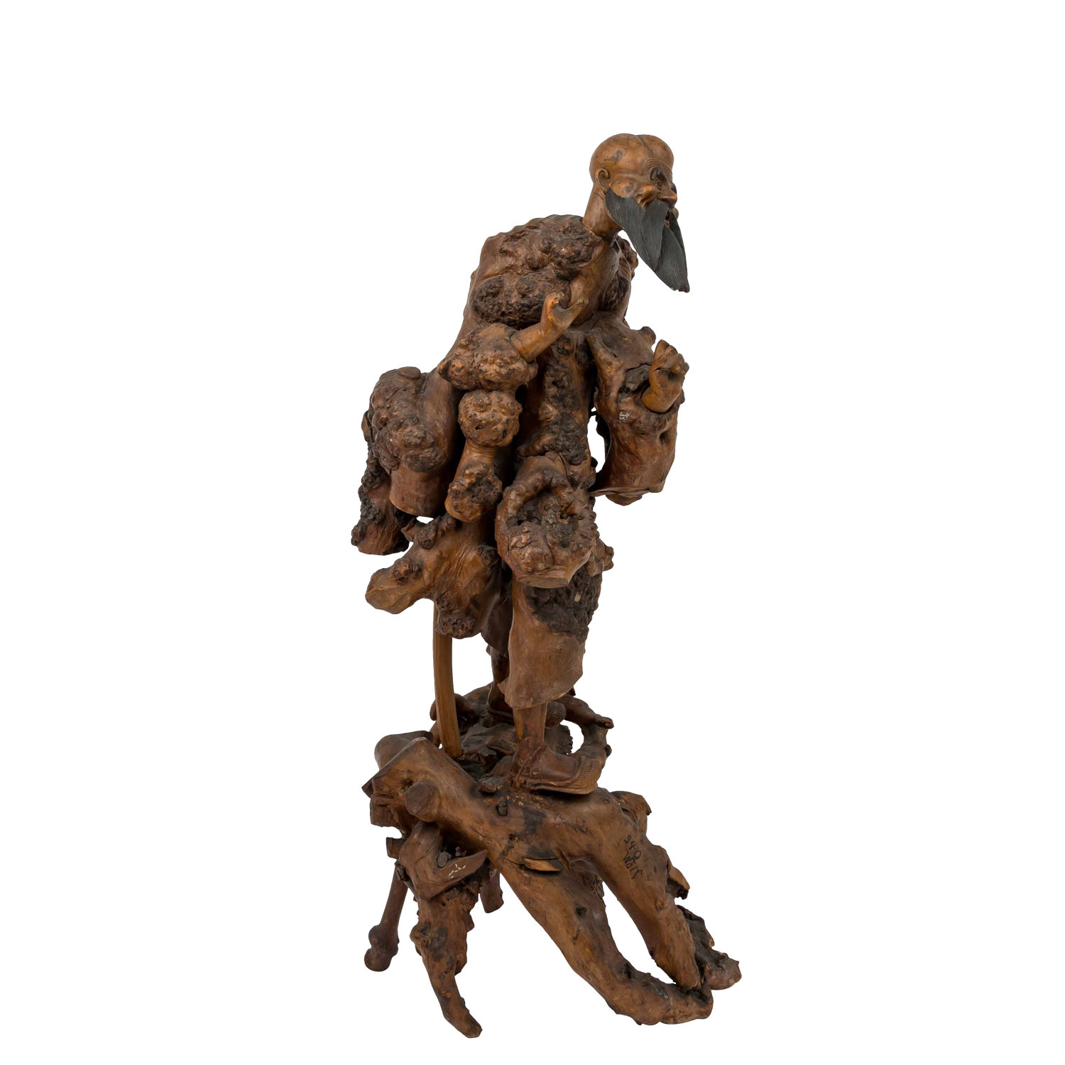 Wurzelholz, partiell geschnitzt und gesteckt), Darstellung des chinesischen Gotten des langen Lebens, auf verschiedenen Teilen der Figur handschriftliche Nummern sowie ein rundes Etikett, möglicherweise als Inventarnummer eines Museums oder einer Sammlung.H: 72 cm. Fehlstellen und teilw. besch.