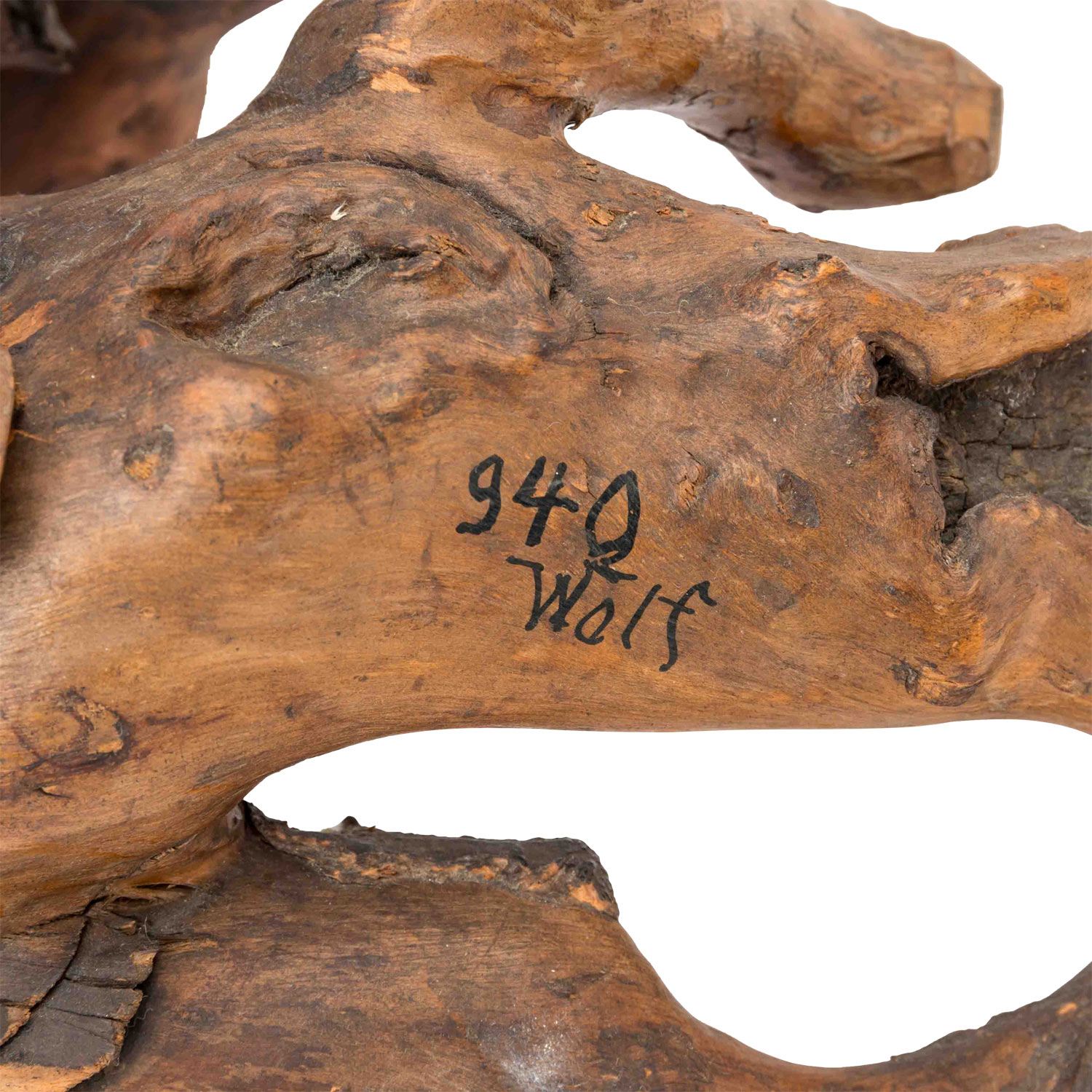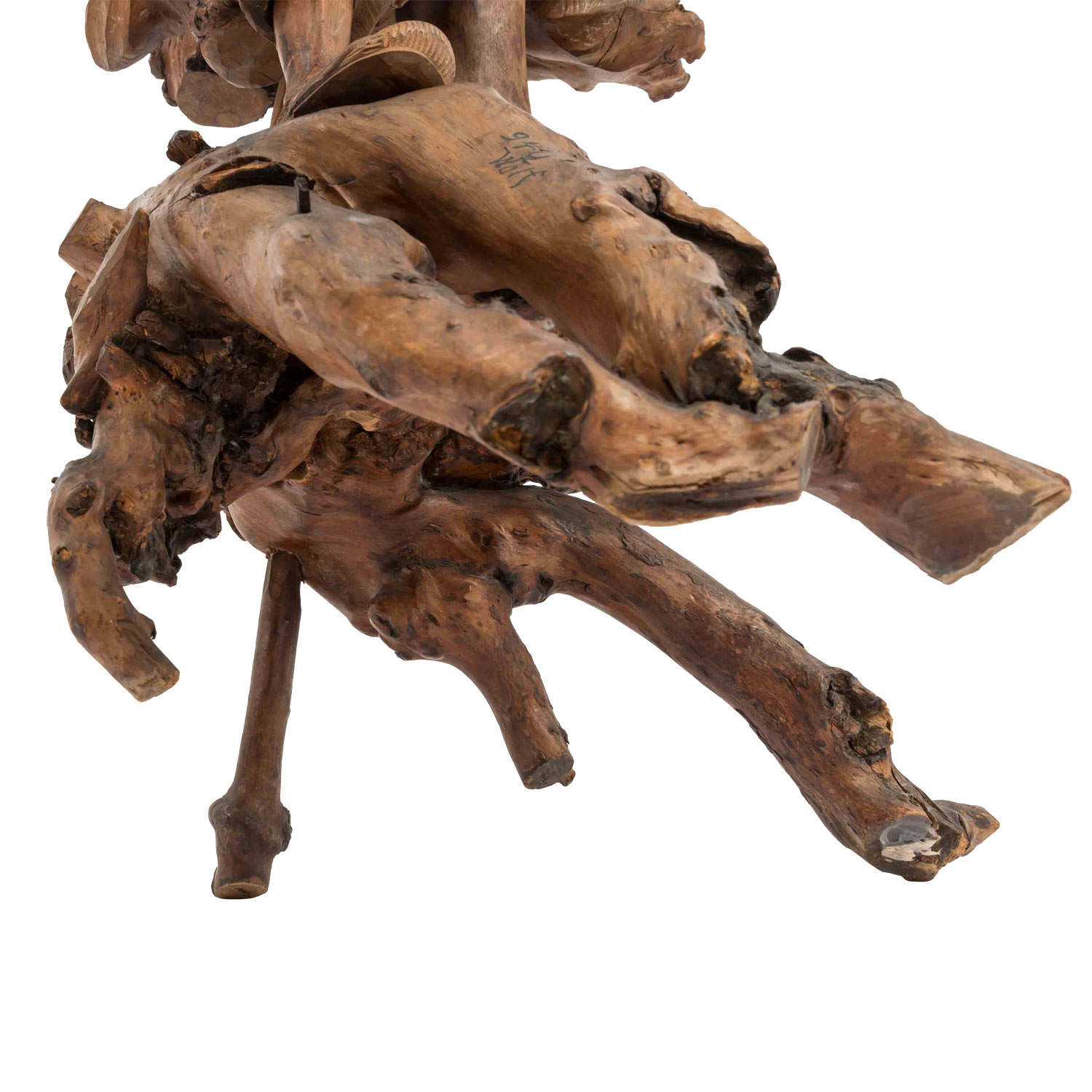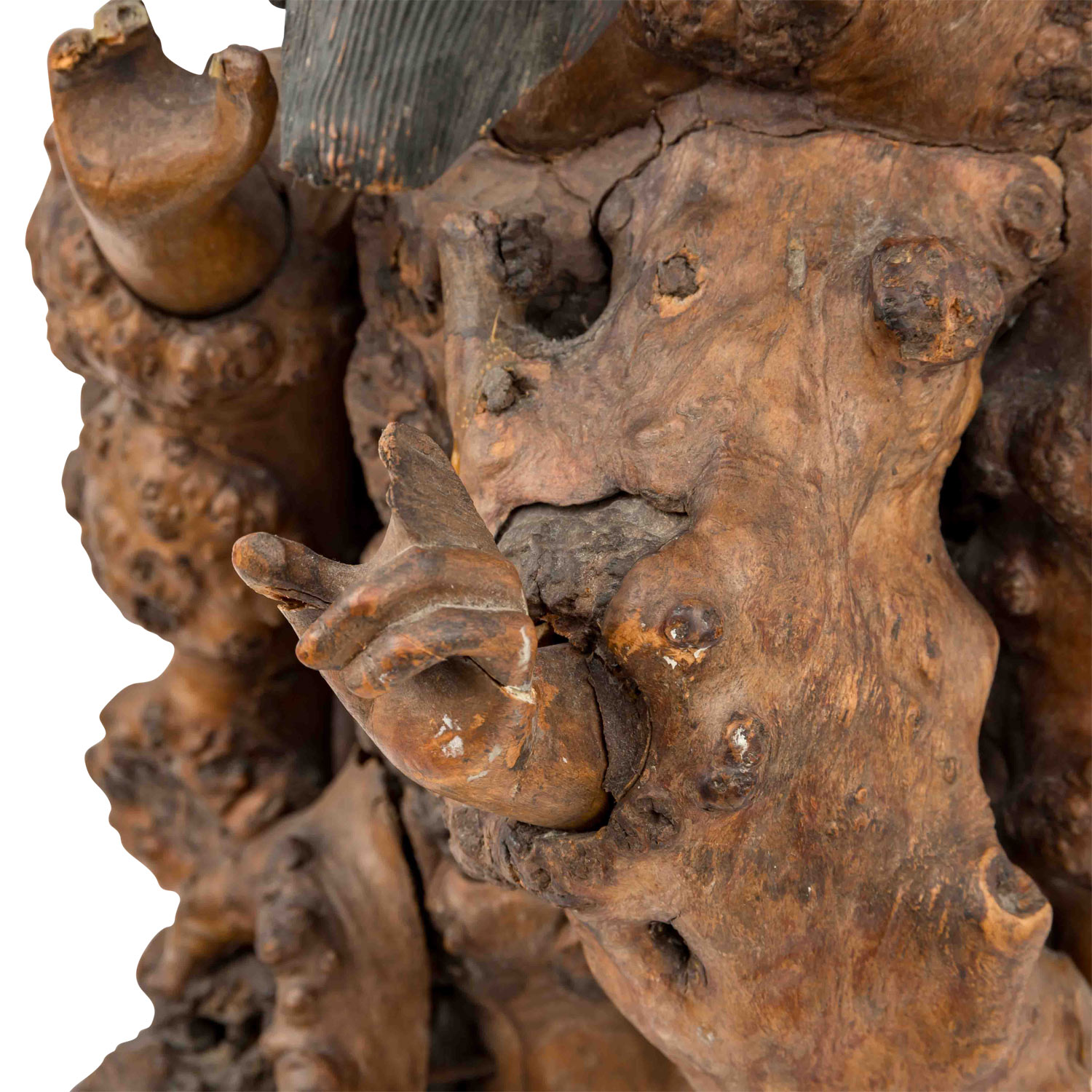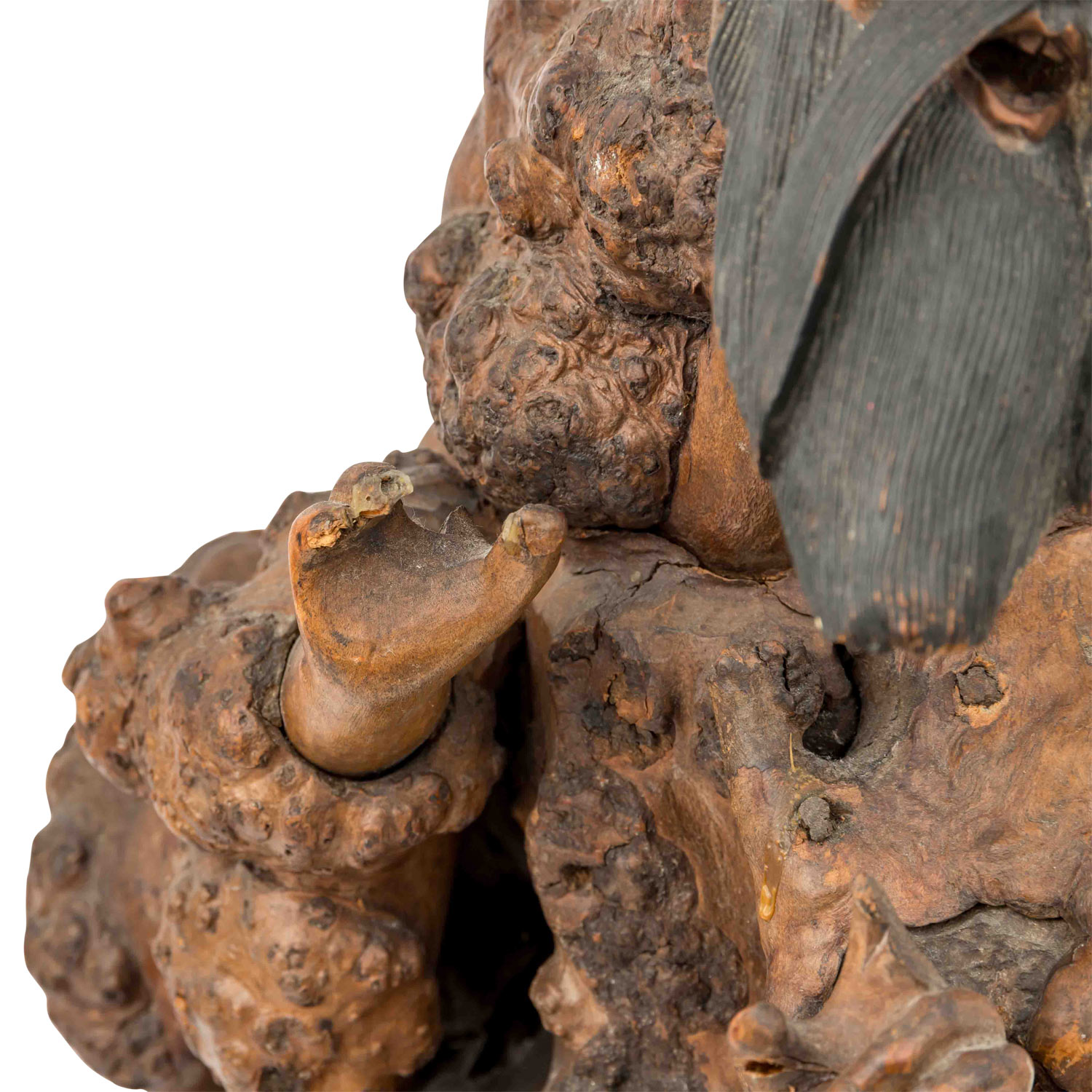 Wurzelholz, partiell geschnitzt und gesteckt), Darstellung des chinesischen Gotten des langen Lebens, auf verschiedenen Teilen der Figur handschriftliche Nummern sowie ein rundes Etikett, möglicherweise als Inventarnummer eines Museums oder einer Sammlung.H: 72 cm. Fehlstellen und teilw. besch.