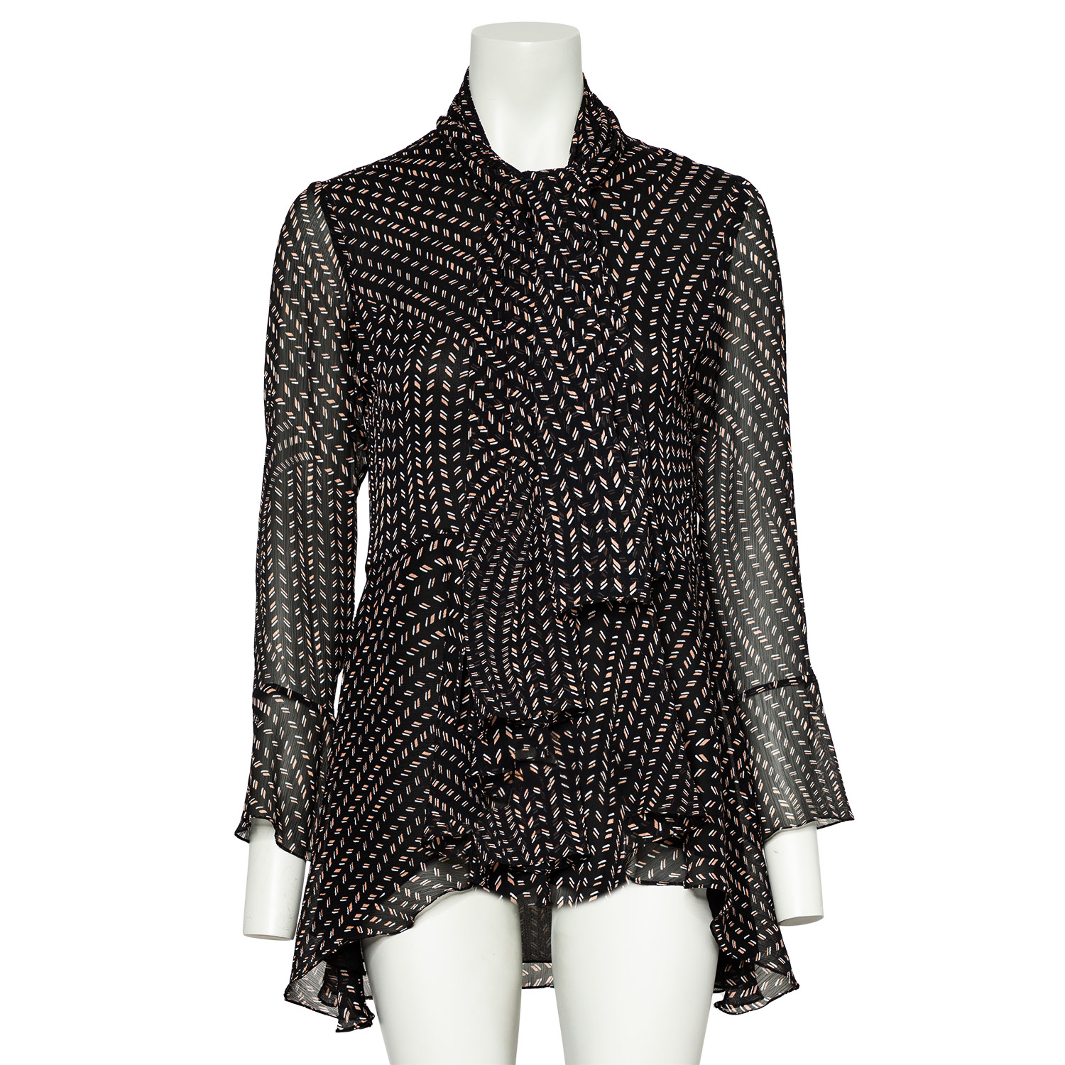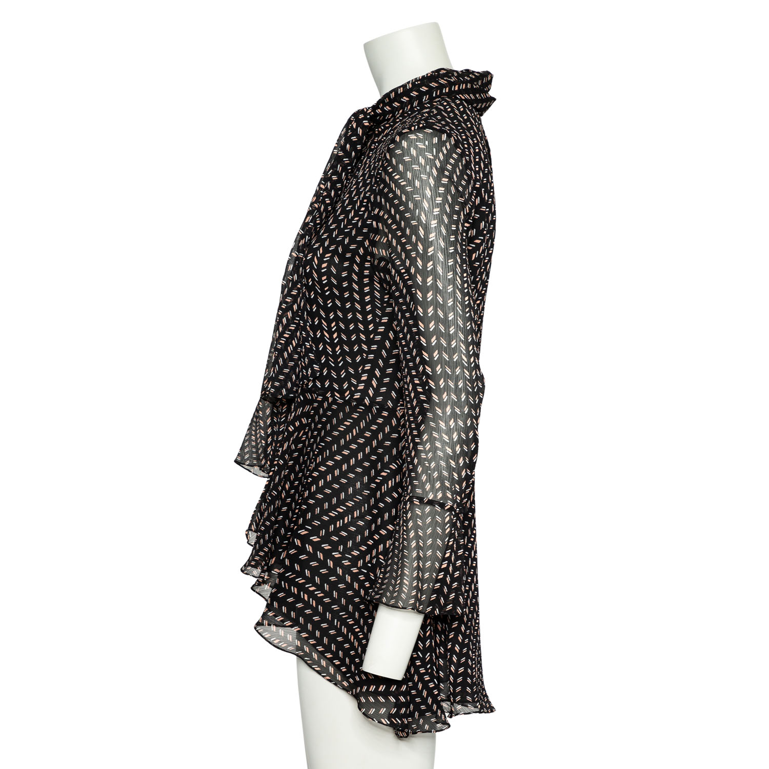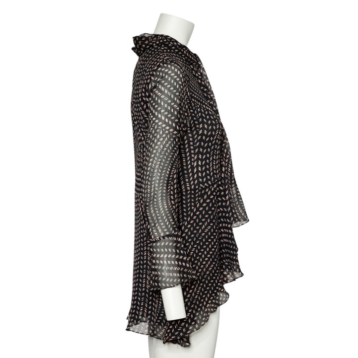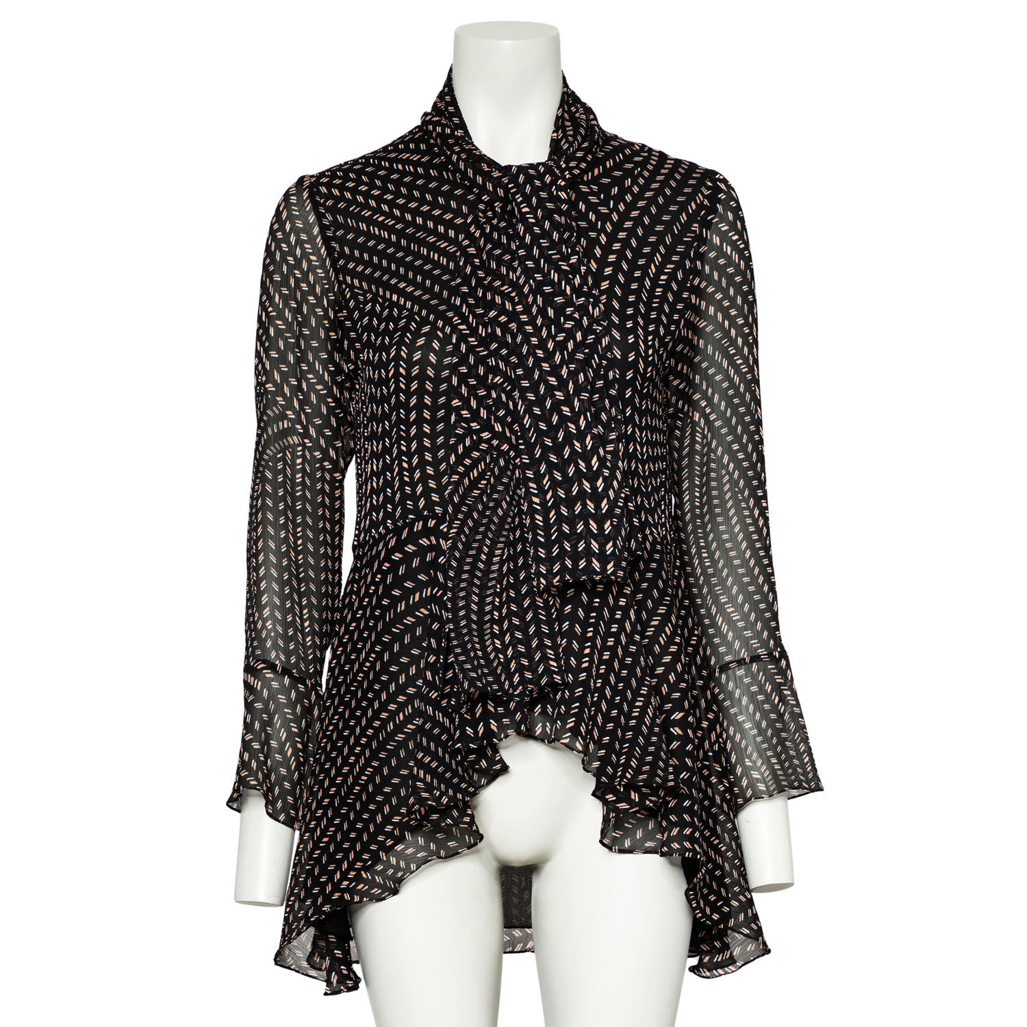 Schwarzer Chiffon mit Musterung, Ärmeln mit Schlitzen sowie Schößchen – vorne kurz, hinten lang. Schal anbei. Tragespuren vorhanden, Etikett entfernt.