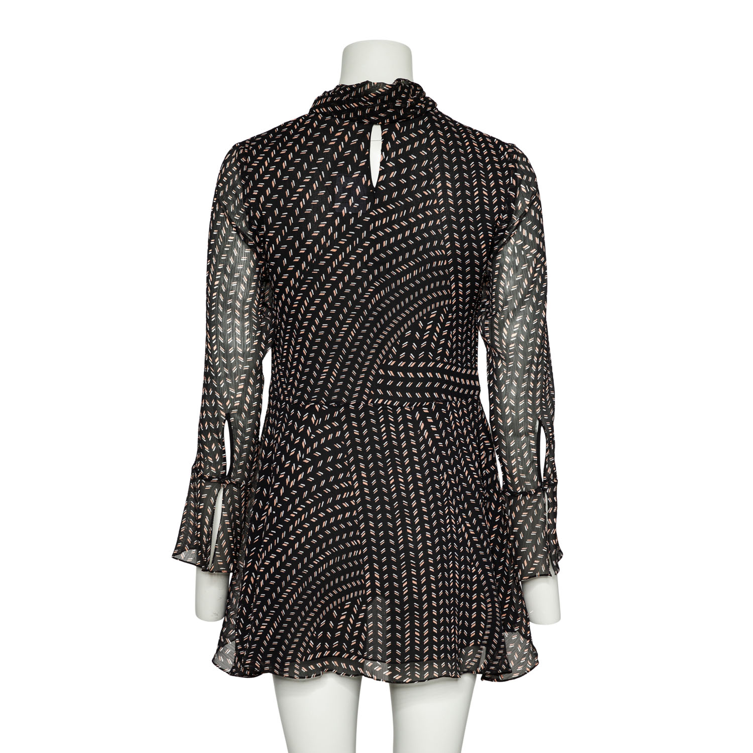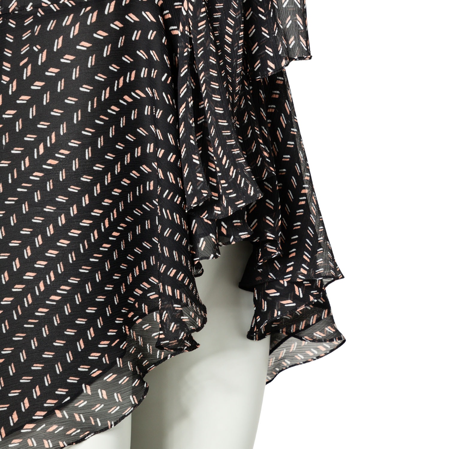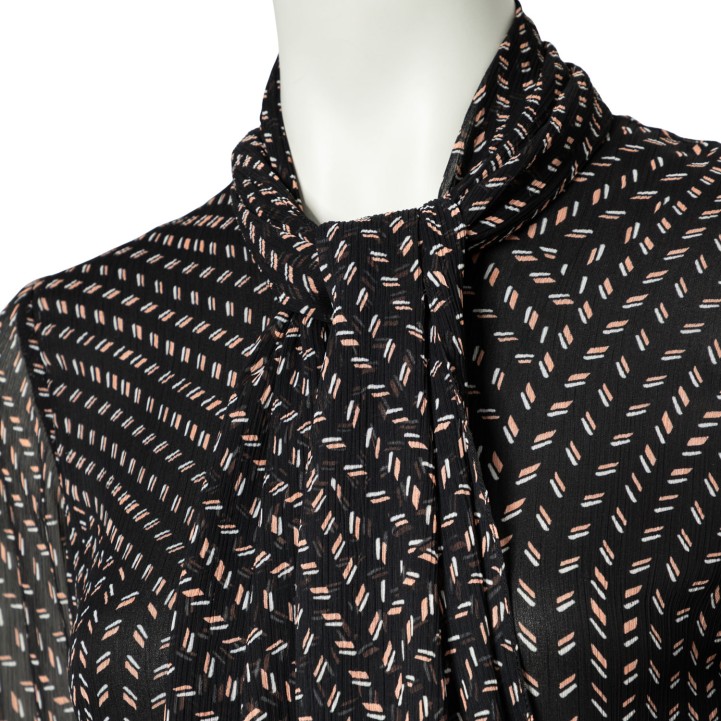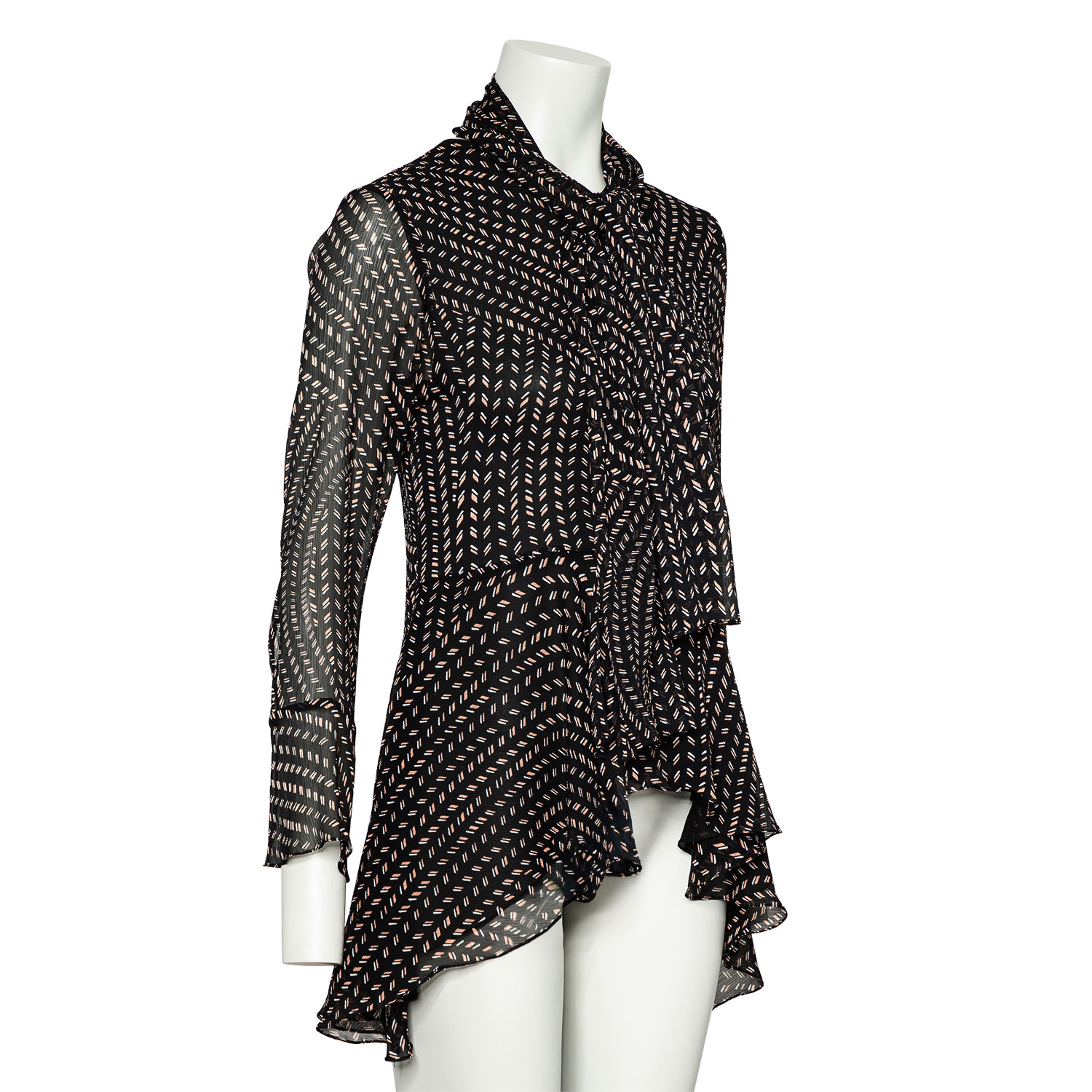 Schwarzer Chiffon mit Musterung, Ärmeln mit Schlitzen sowie Schößchen – vorne kurz, hinten lang. Schal anbei. Tragespuren vorhanden, Etikett entfernt.