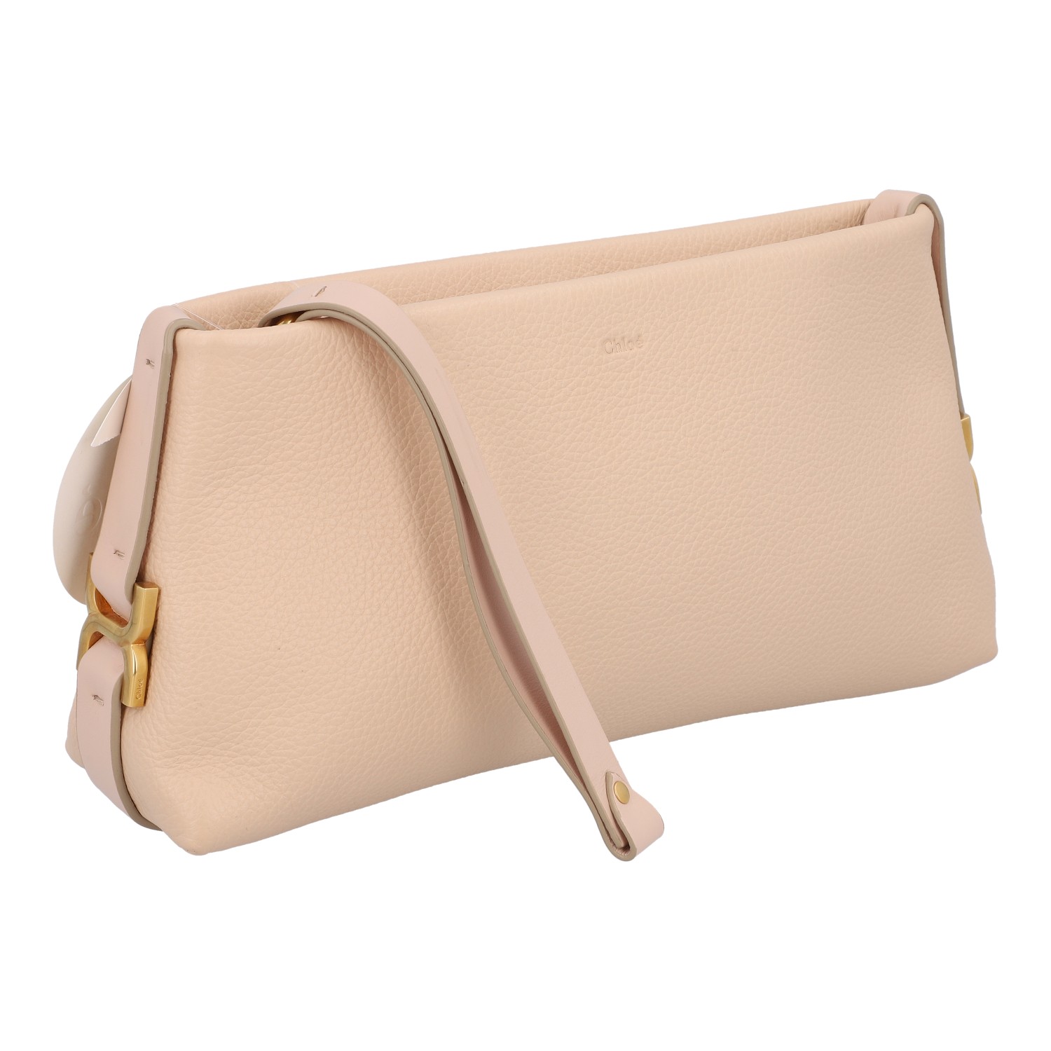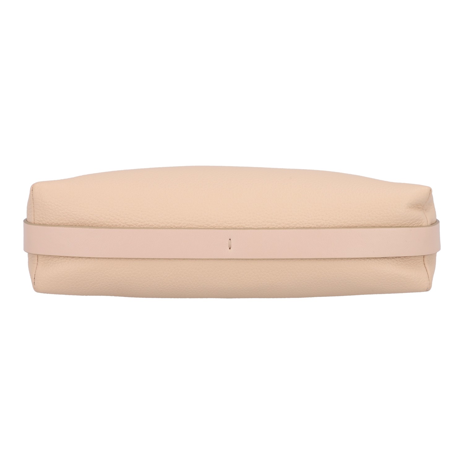 Kalbsleder in Puderbeige mit goldfarbener Hardware, Reißverschluss und seitlichem Dekor. Innenraum aus Leinen. Staubbeutel anbei. Sehr guter Zustand.