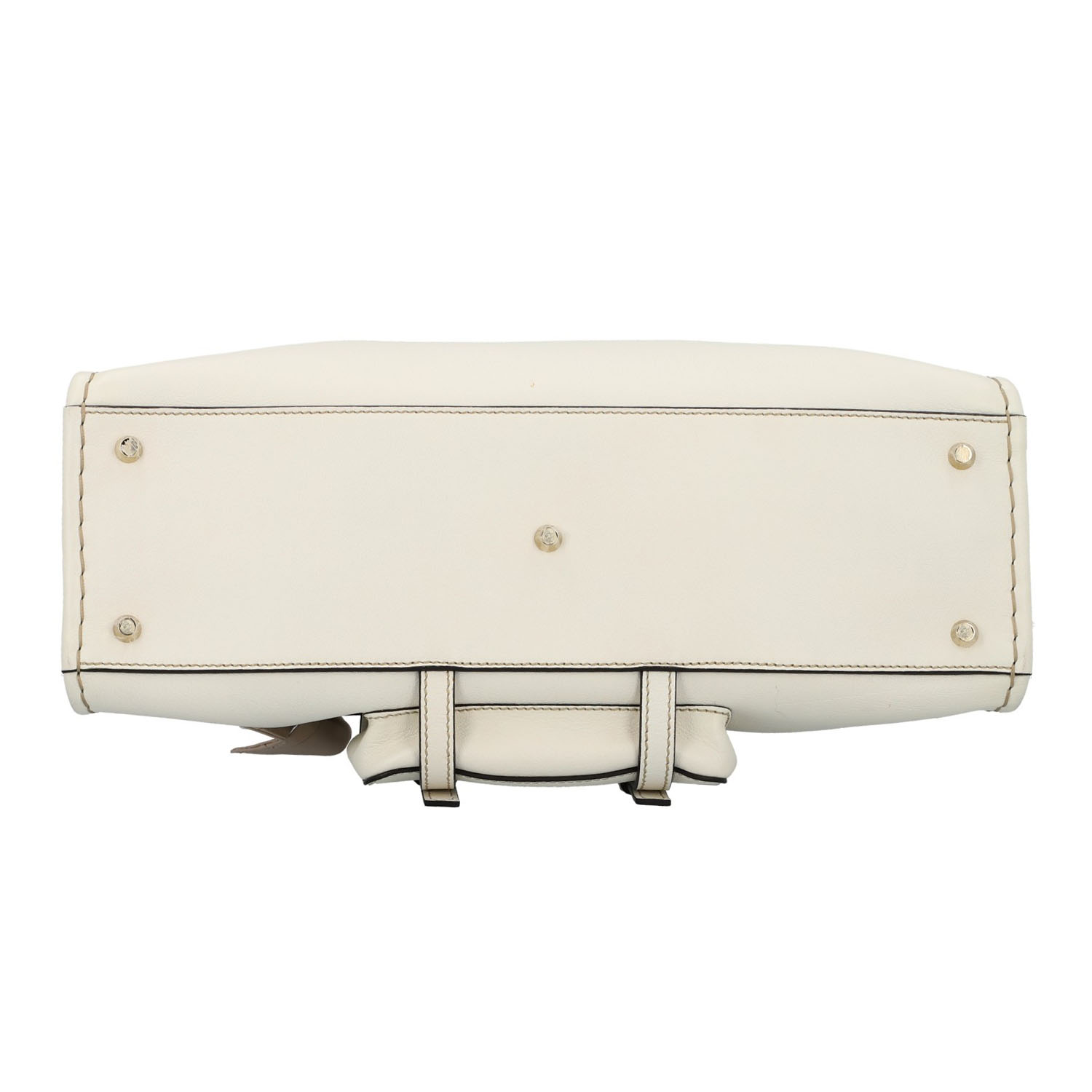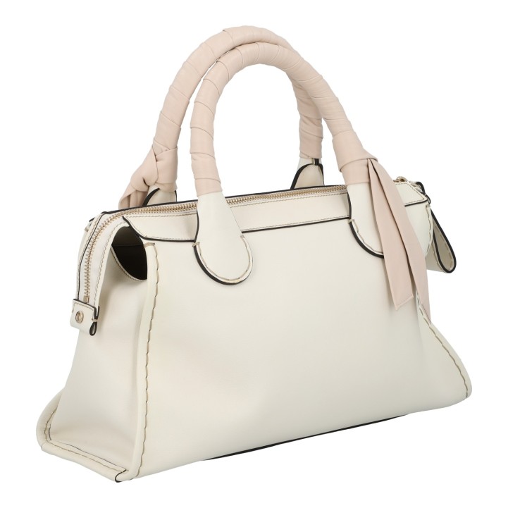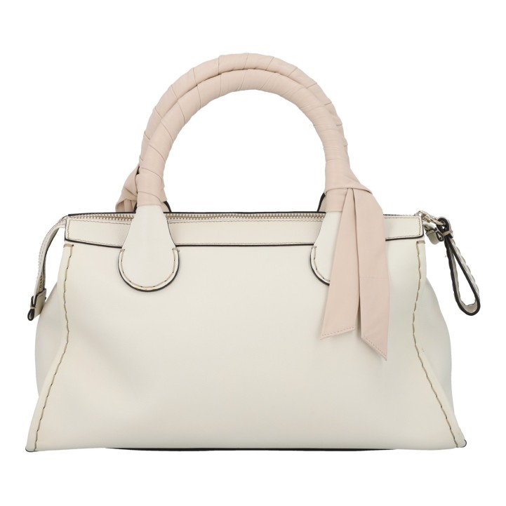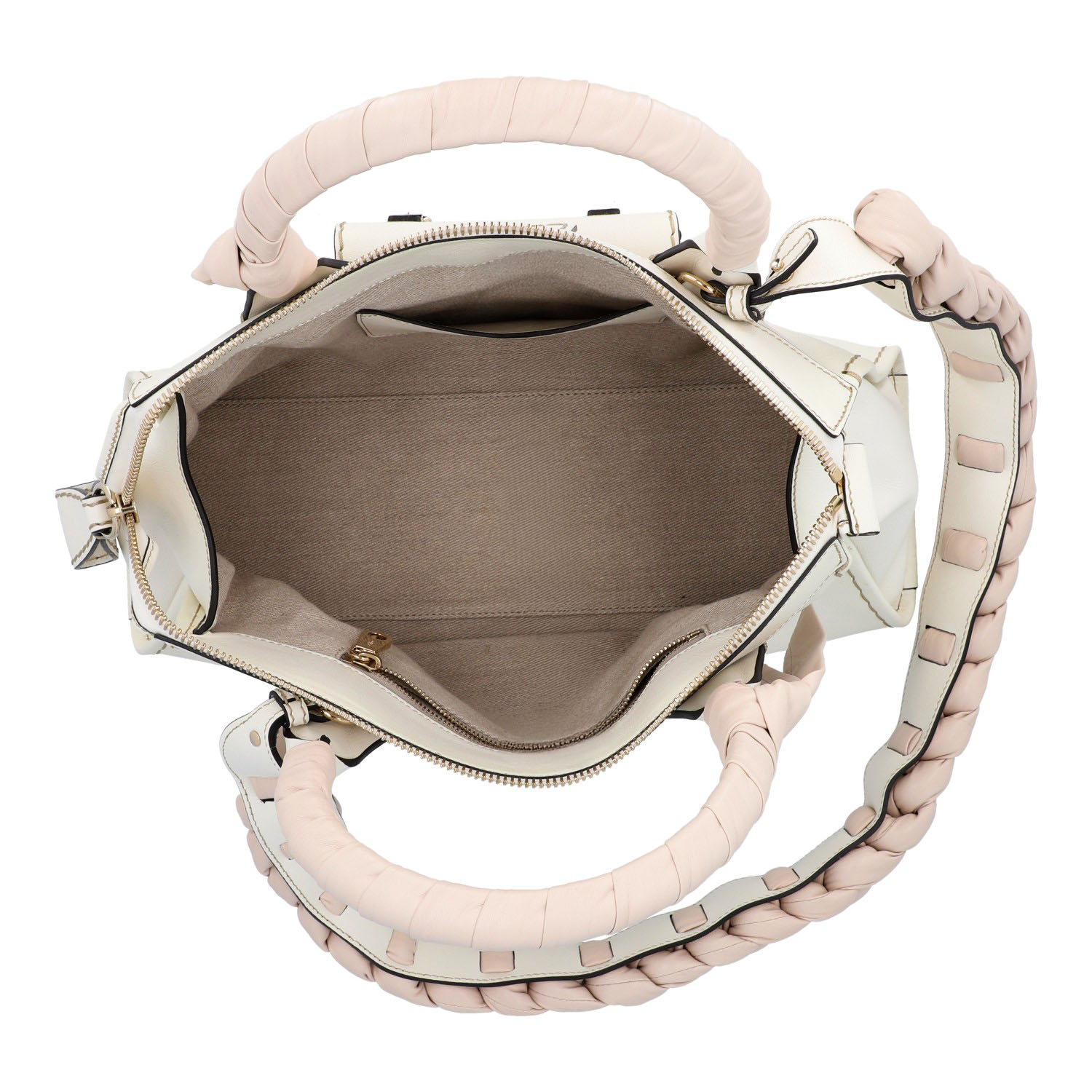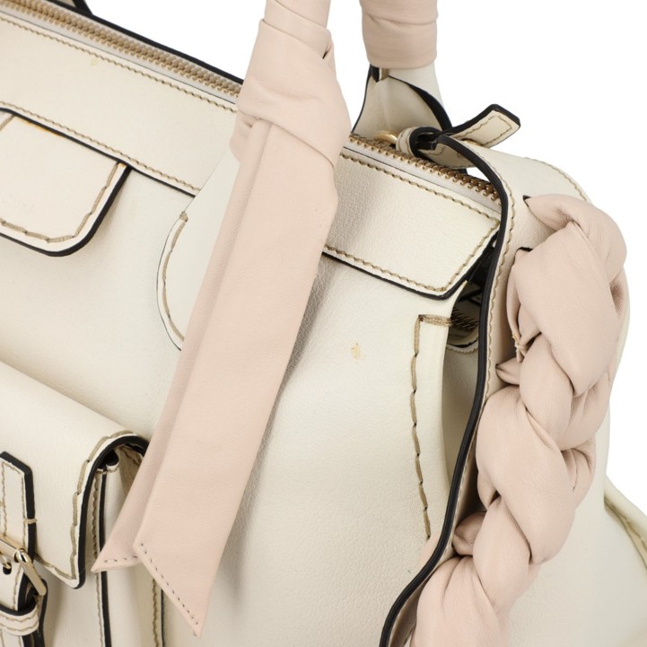 Special Edition for Mytheresa 'BRAIDED'. Cremefarbenes Leder mit dekorativer Steppung an den Kanten, goldfarbener Hardware und Außenfach auf der Front. Reißverschluss, Doppelhenkel sowie abnehmbarer Schulterriemen, Griffe und Schulterriemen mit dekorativem Lederband in Rosa. Innenraum aus Canvas mit zwei Fächern. Flecken vorhanden. 42 x 14 x 24 cm.