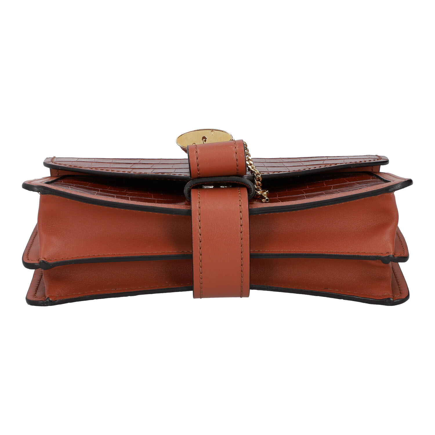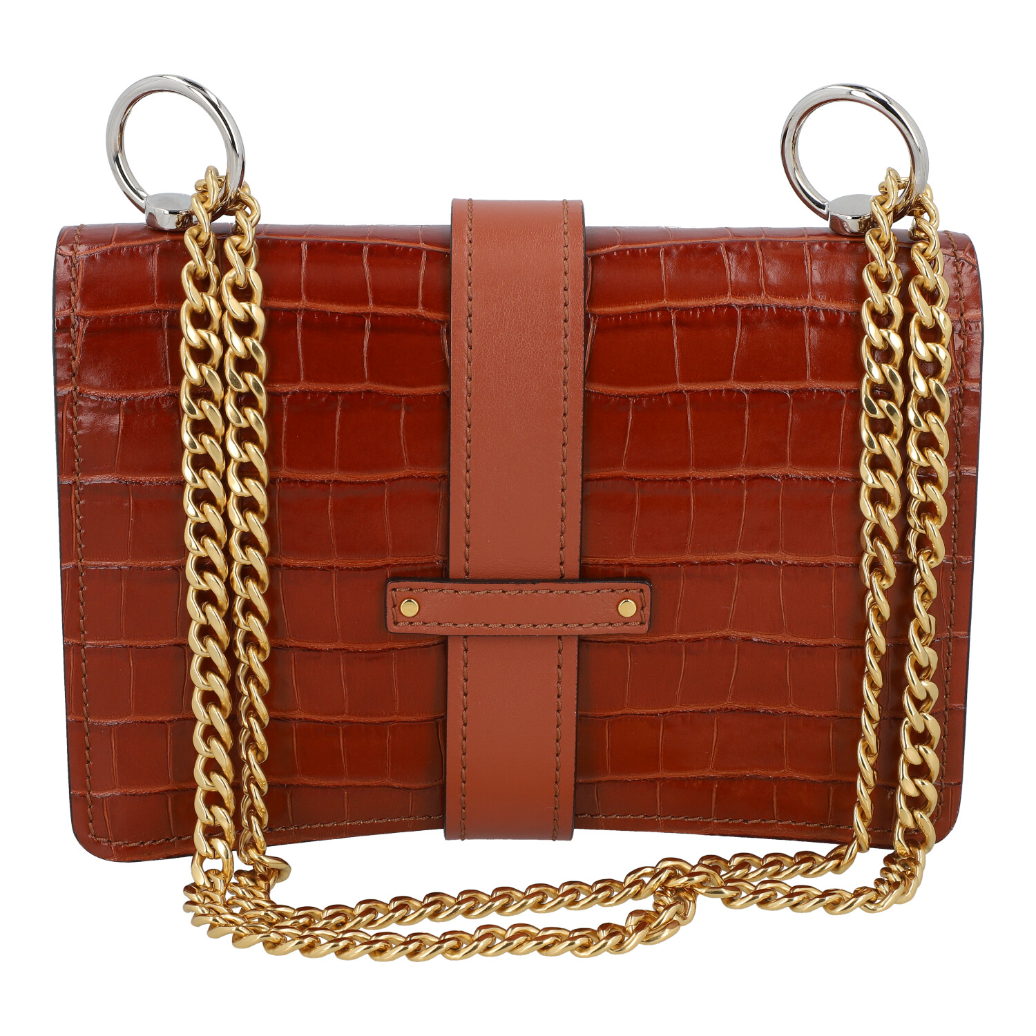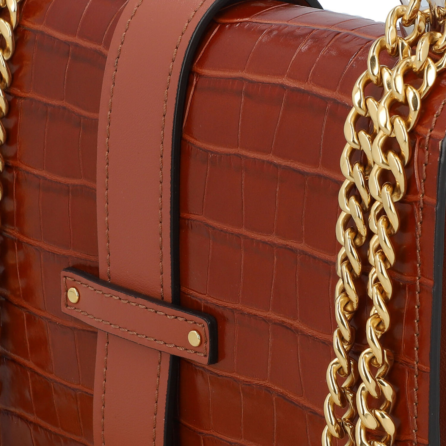 Modell aus braunem Leder mit Krokoprägung, Bicolor-Beschläge, Überschlag mit Schlossdekor, Zierriemen aus Glattleder und Kettenriemen. Innen zwei Abteile und zwei Fächer, eines davon mit Reißverschluss. Flecken auf dem Leder. 24 x 8,5 x 17 cm.