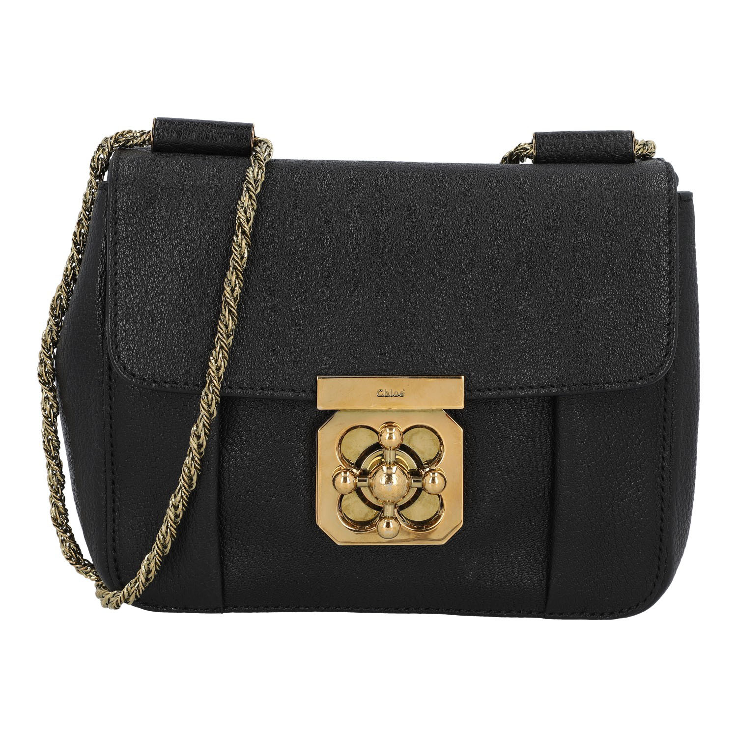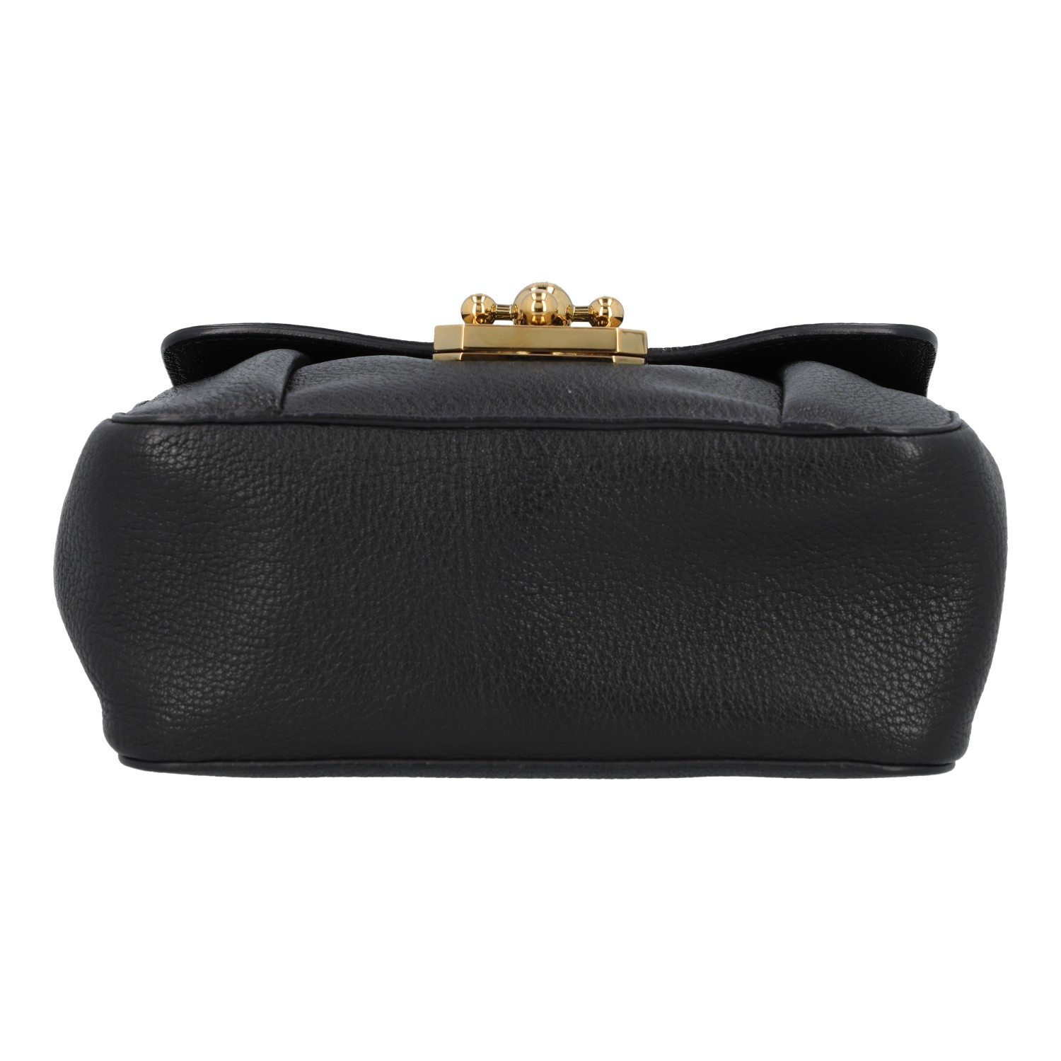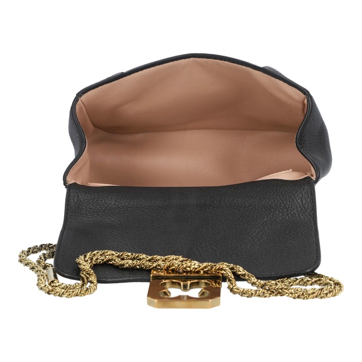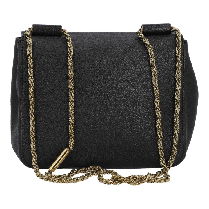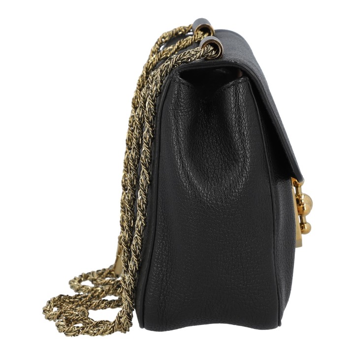 Fein genarbtes Leder in Schwarz mit goldfarbener Hardware. Überschlag mit dekorativem Verschluss, Innenfutter aus Leder, Gliederkettenriemen. Staubbeutel anbei. Guter Erhalt. 19x8x16cm.