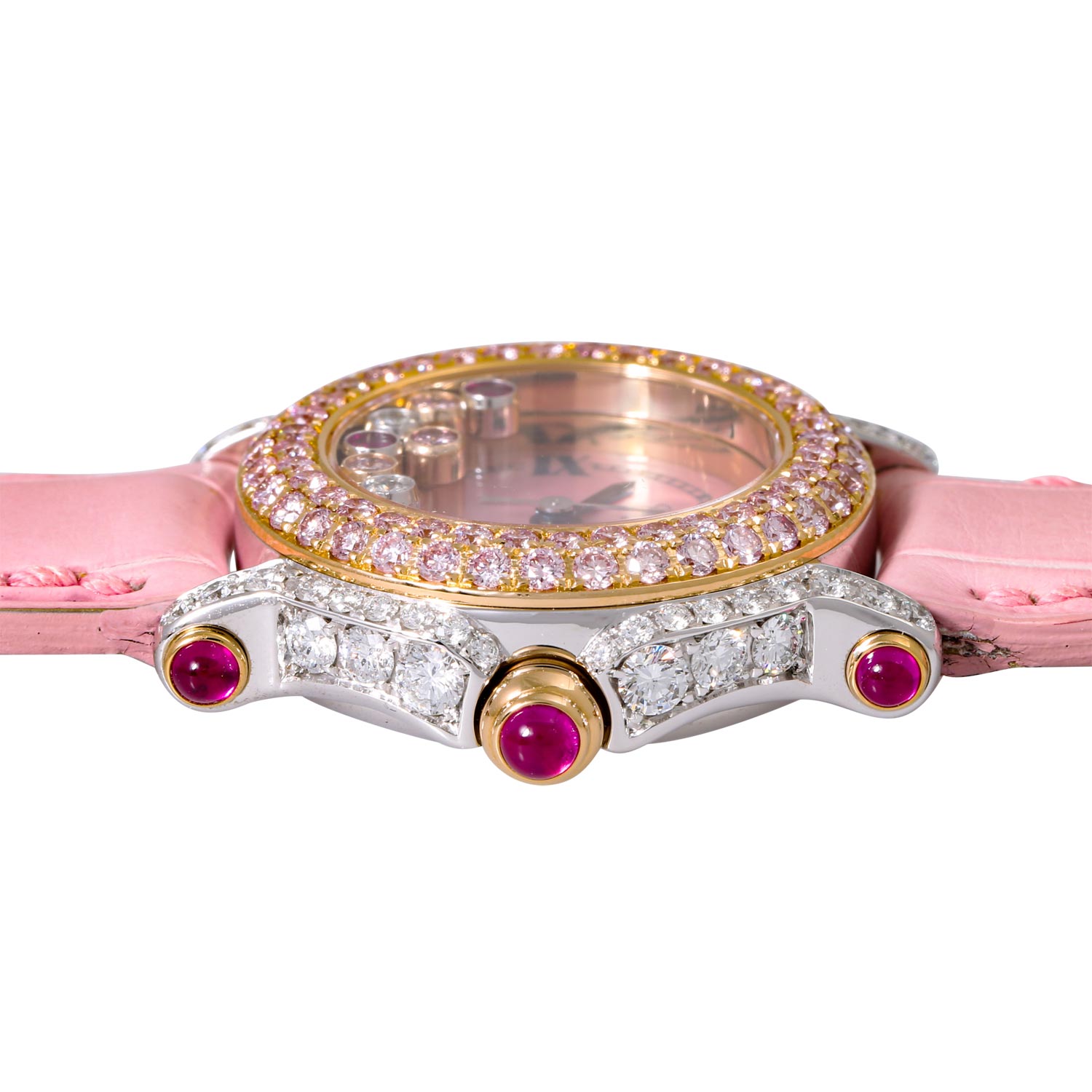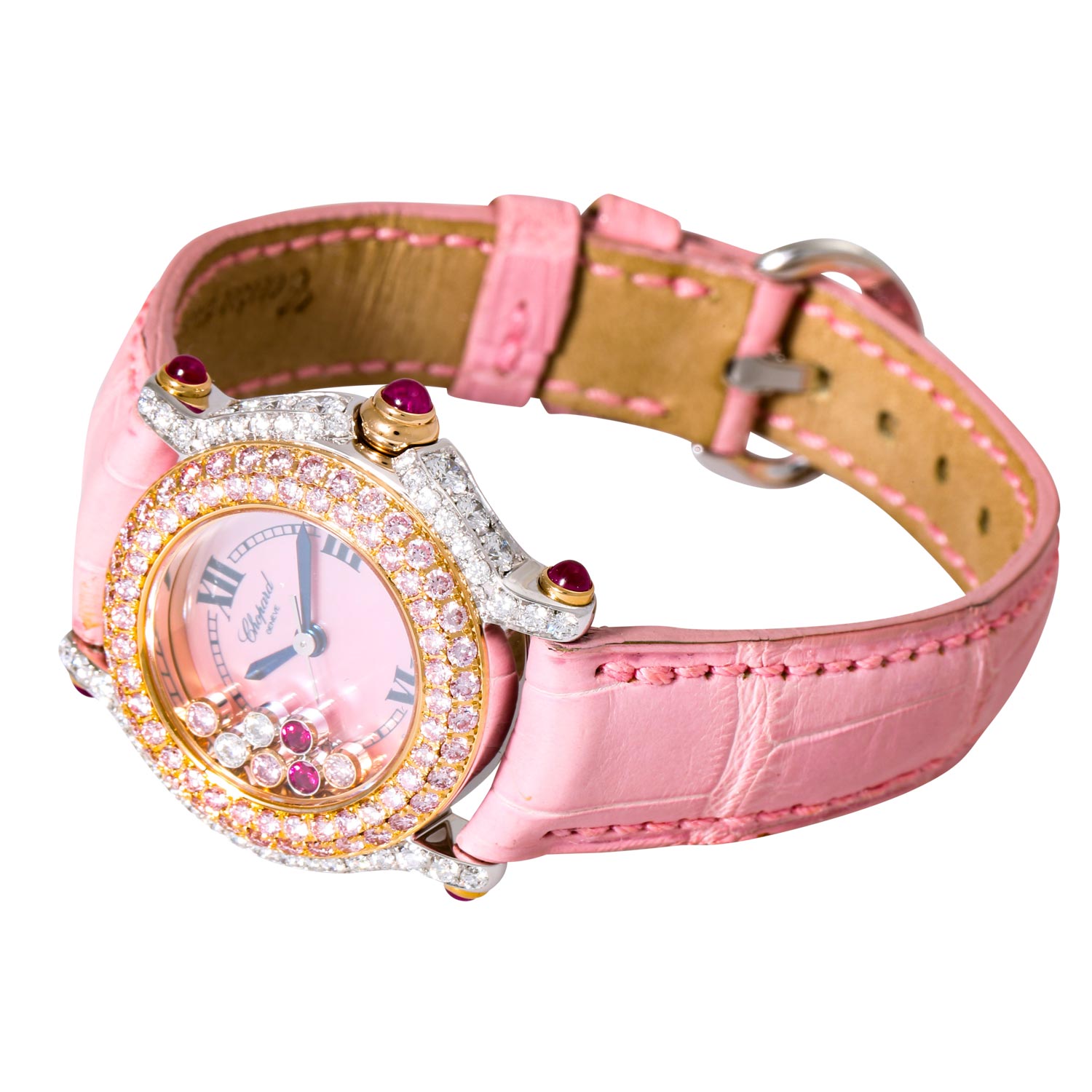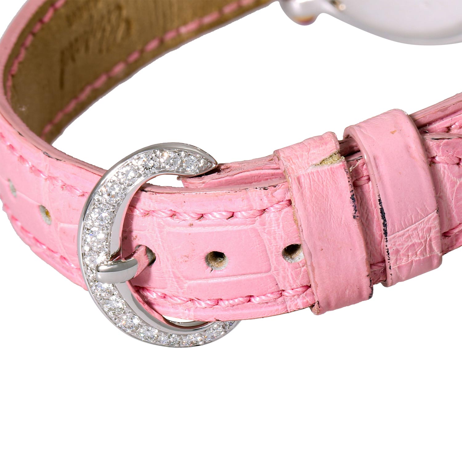 'La vie en rose', farblose Brillanten zus. ca. 1,52 ct, pinkfarbene Brillanten zus. ca. 1,16 ct, Rubine zus. ca. 0,69 ct, WG 18K, 40,8 gr inkl Verpackung, Lederband, Quarzwerk, Zifferblatt Perlmutt rosa, Gehäusedurchmesser ca. 27 mm, Ref. 276244-9004, aufgearbeitet u. eingeschweißt (für Fotografie geöffnet), 1990er Jahre, heutiger UVP ca. 80.000 €, incl. Garantiekarte u. original Etui. (3)