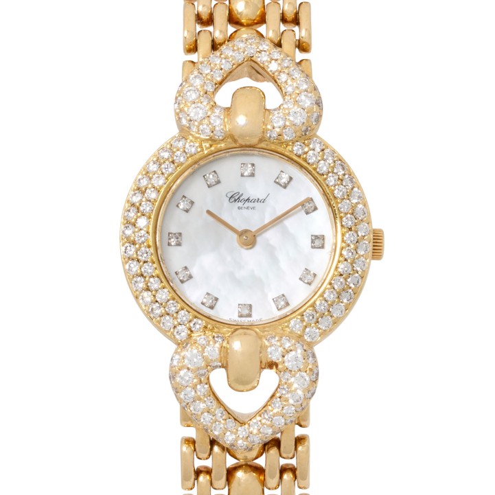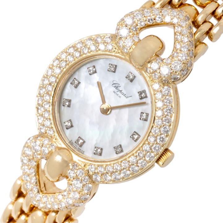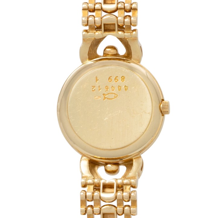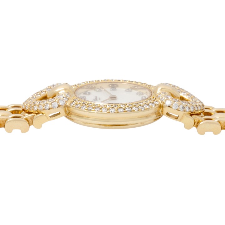 Gelbgold 18K, Lünette und Bandanstöße ab Werk besetzt mit 161 Brillanten (1 Stein fehlt). Quartz-Werk mit neuer Batterie. Originales Perlmutt-Zifferblatt mit 12 Diamantindizes, goldene Stabzeiger. Originales Gliederarmband mit Faltschließe in Gelbgold 18K. Guter Zustand, sichtbare Gebrauchsspuren an Gehäuse und Armband. Durchmesser ca. 23mm gemessen ohne Krone, passend für bis ca. 17 cm Handgelenksumfang.