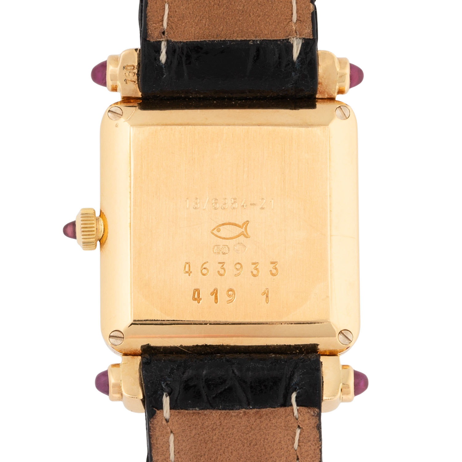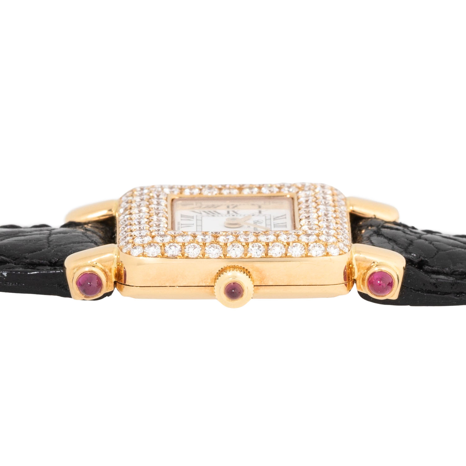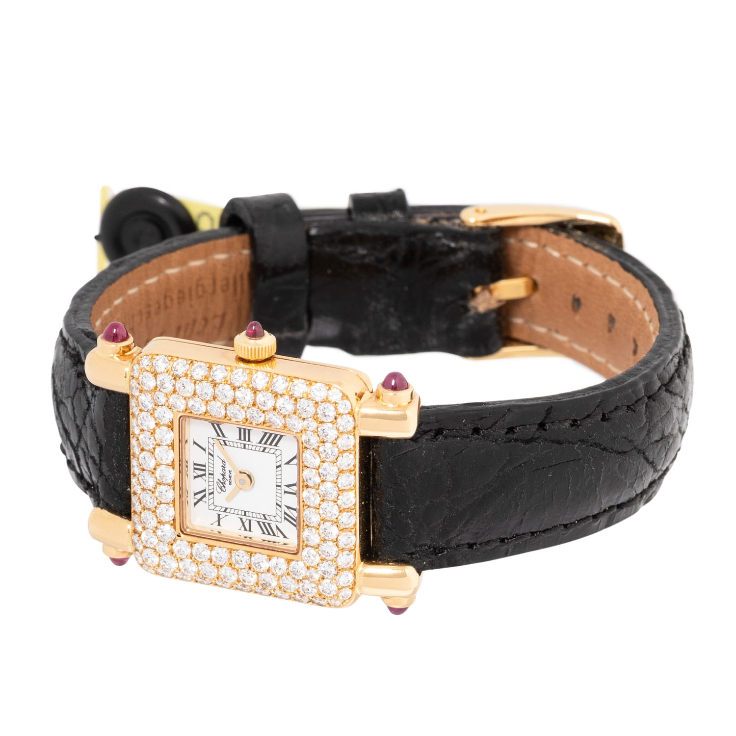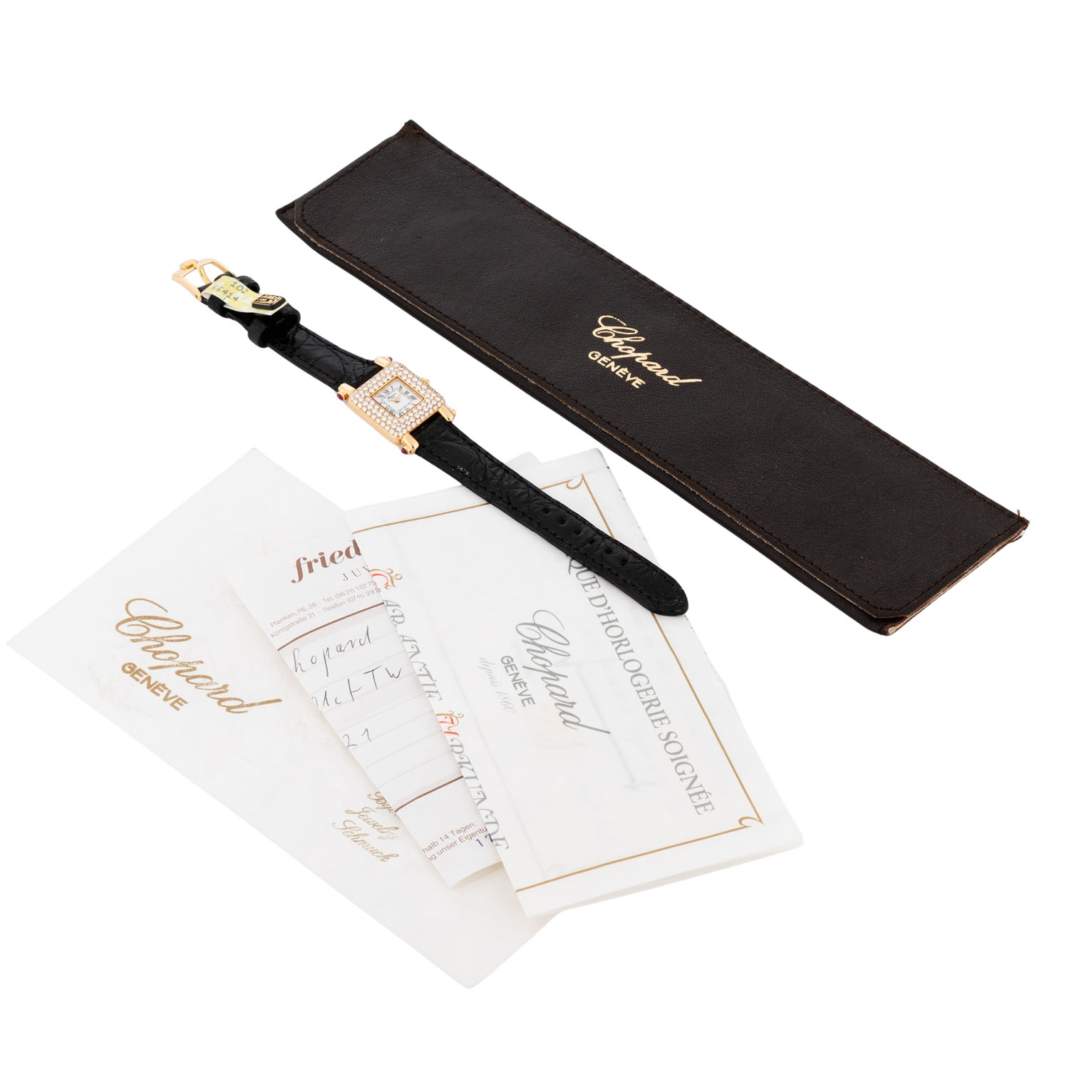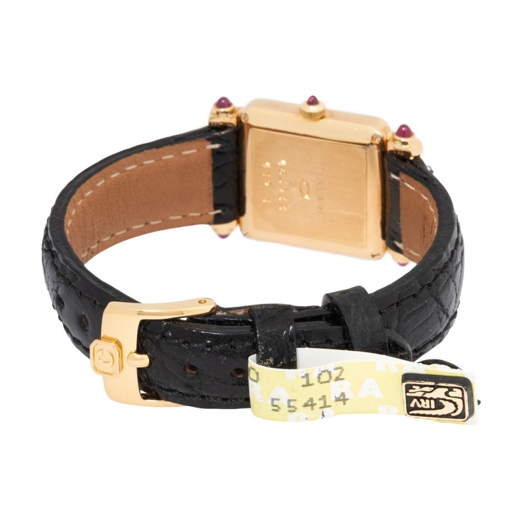 Gelbgold mit Diamanten, ca. 1.81Ct. Quartz-Werk mit neuer Batterie in funktionsfähigem Zustand. Weißes Zifferblatt mit römischen Ziffern. Neues Lederband mit original Dornschließe, vergoldet. Guter Zustand, leichte Gebrauchsspuren. Rubincabochons an den Bandanstößen. Original Zertifikat vom 24.12.1996, gekauft bei Friedo Frier und Lederetui anbei. Neupreis damals 13520 DM. Durchmesser ca. 21,5 mm, gemessen ohne Krone.