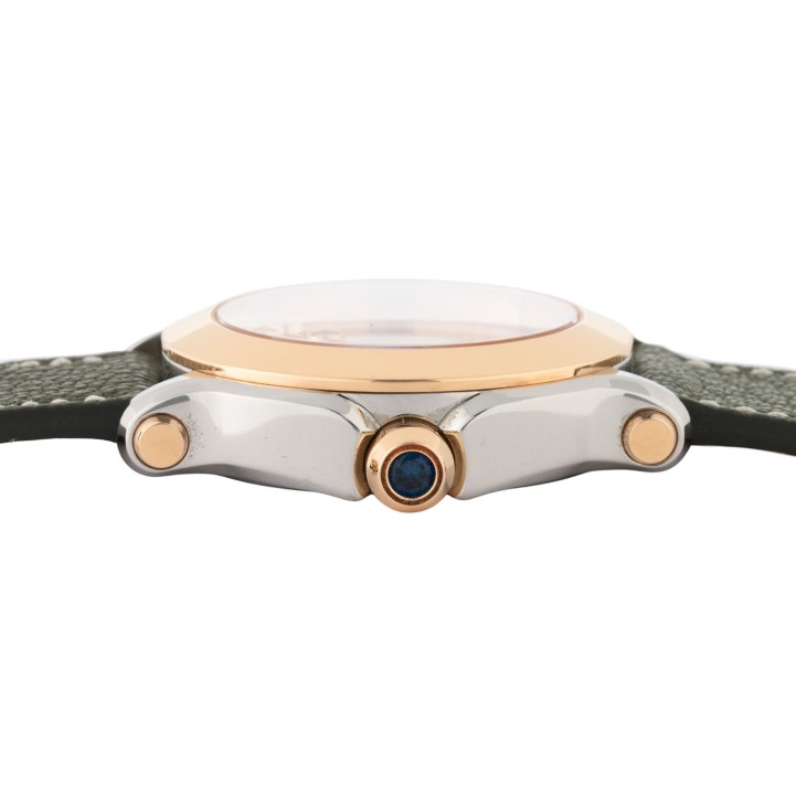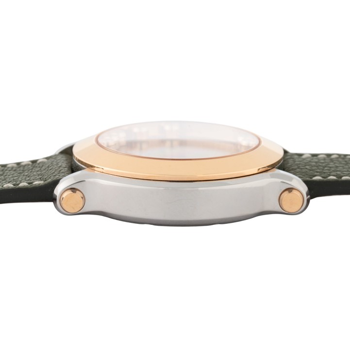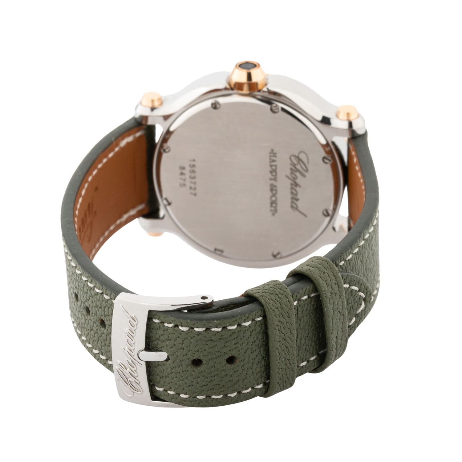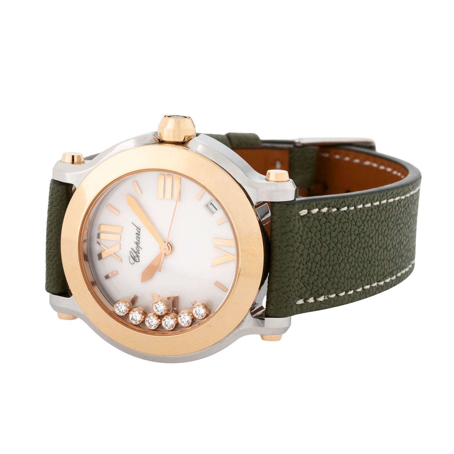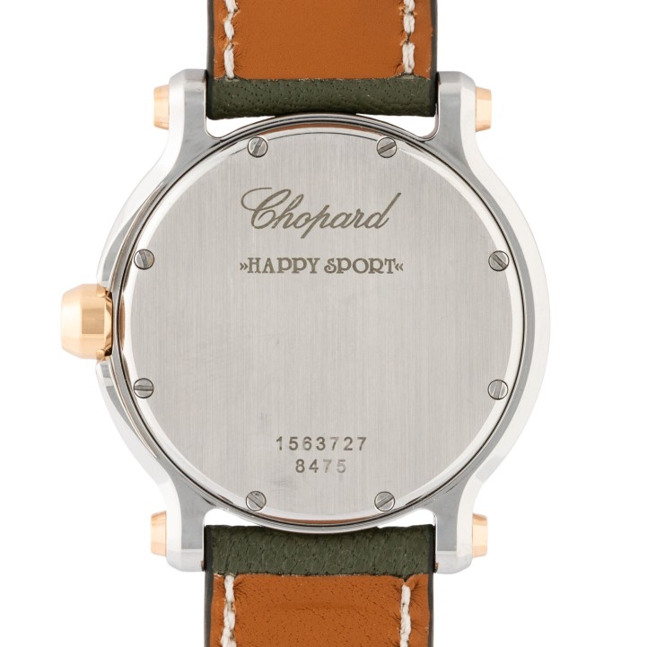 Edelstahl / Rosegold 18K. Seriennummer 1563727. Quarzwerk in funktionsfähigem Zustand. Neue Batterie. Weißes Zifferblatt mit augesetzten römischen Indizes und 7 beweglichen Brillanten (0.39 ct). Krone mit blauem Saphir Cabochon (0.17 ct). Neues Lederband mit der originalen Chopard Edelstahl Dornschließe. Guter Zustand mit Tragespuren. Original Box, Chopard Booklet, Anleitung, Händlerverzeichnis, Kassenbeleg von einem älteren Batteriewechsel und Garantiezertifikat anbei. Gekauft im Juli 2010 bei Juwelier Brogle in Esslingen. Durchmesser ca. 36 mm (gemessen ohne Krone).