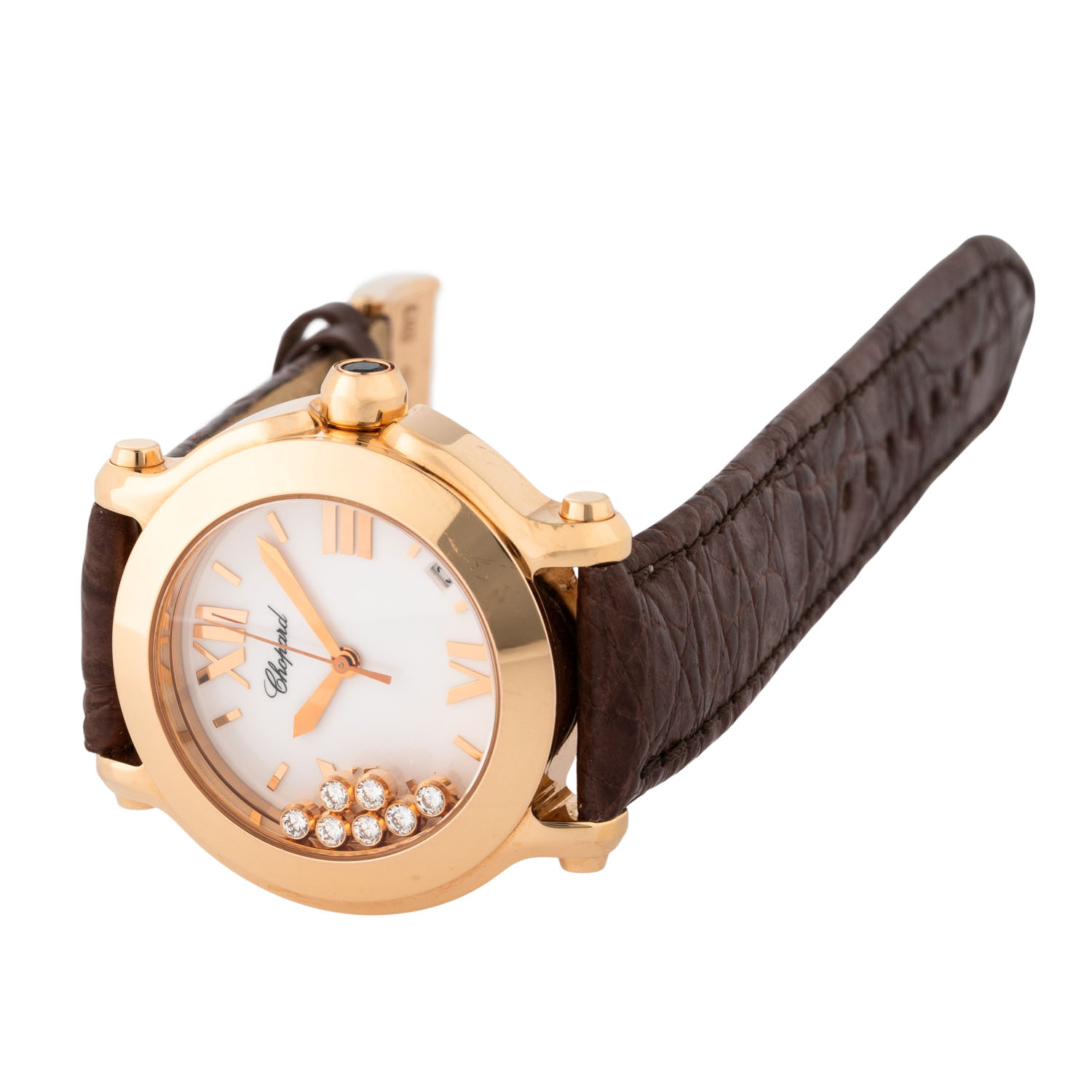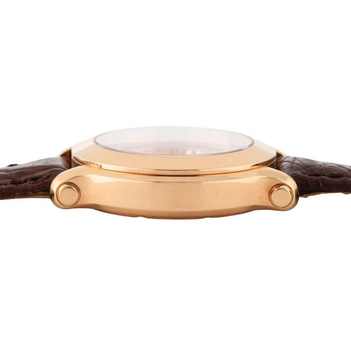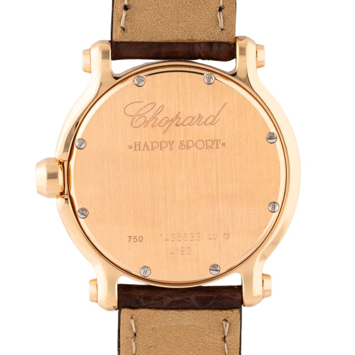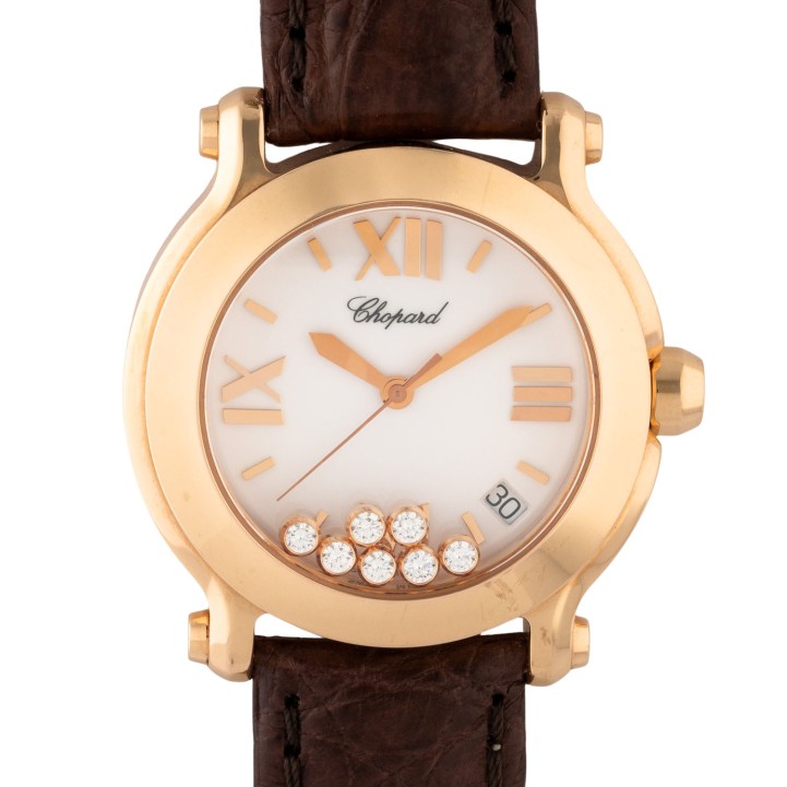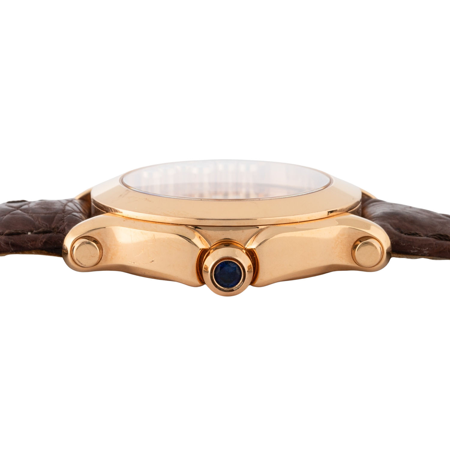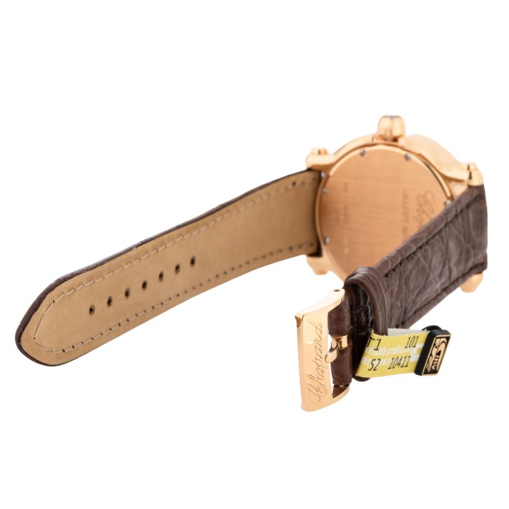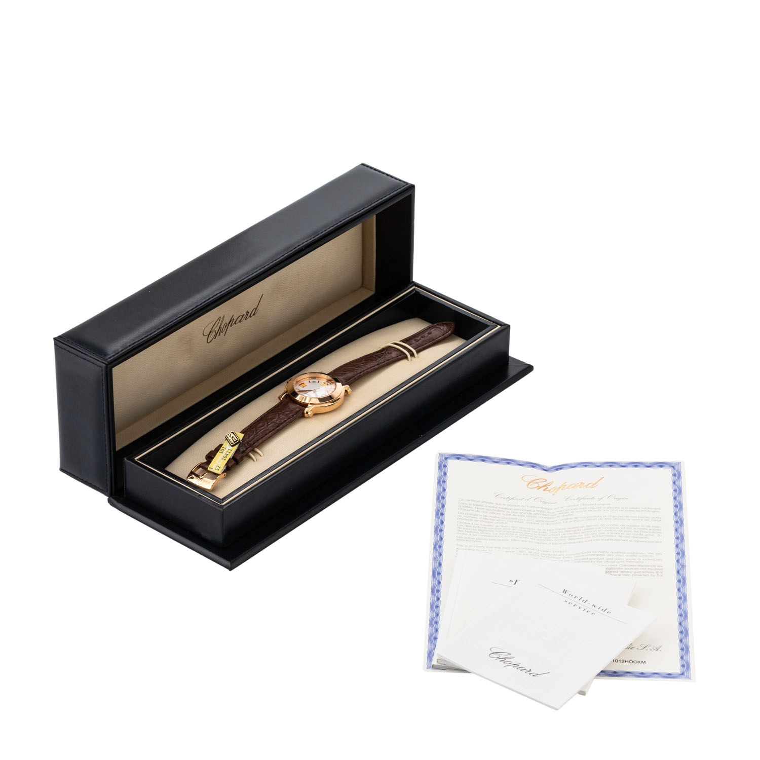 Rotgold 18K. Seriennummer 1436633. Quarzwerk in funktionsfähigem Zustand. Neue Batterie. Weißes Zifferblatt mit augesetzten römischen Indizes und 7 beweglichen Brillanten (0.39 ct). Krone mit blauem Saphir Cabochon (0.17 ct). Neues Lederband mit der originalen Chopard Dornschließe aus 18K Gelbgold. Guter Zustand mit sichtbarenTragespuren am Gehäuse, Lünette und Dornschließe. Original Box, Chopard Booklet, Anleitung, Händlerverzeichnis und Garantiezertifikat anbei. Gekauft im Mai 2009 bei Juwelier Brogle in Esslingen. Durchmesser ca. 36 mm (gemessen ohne Krone).