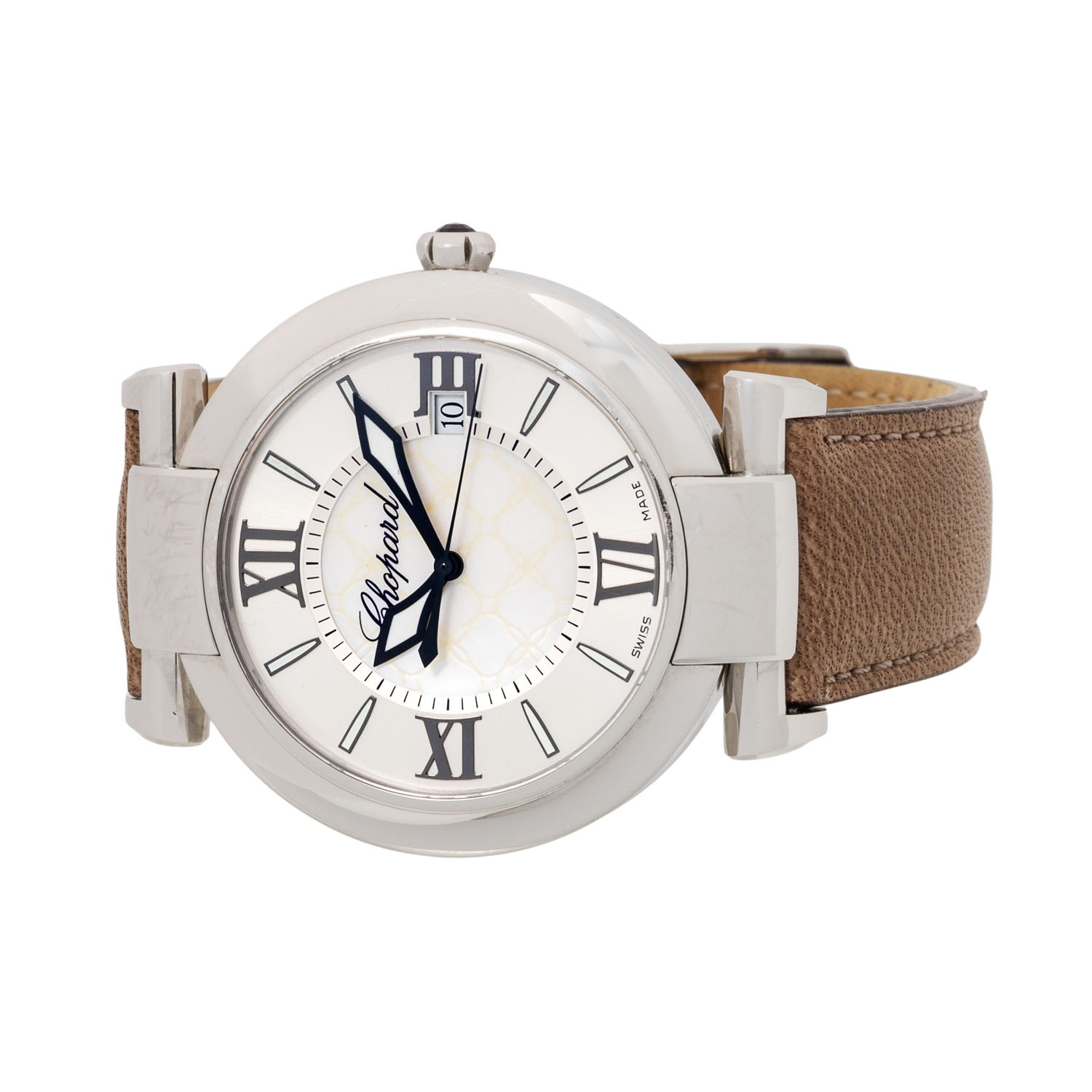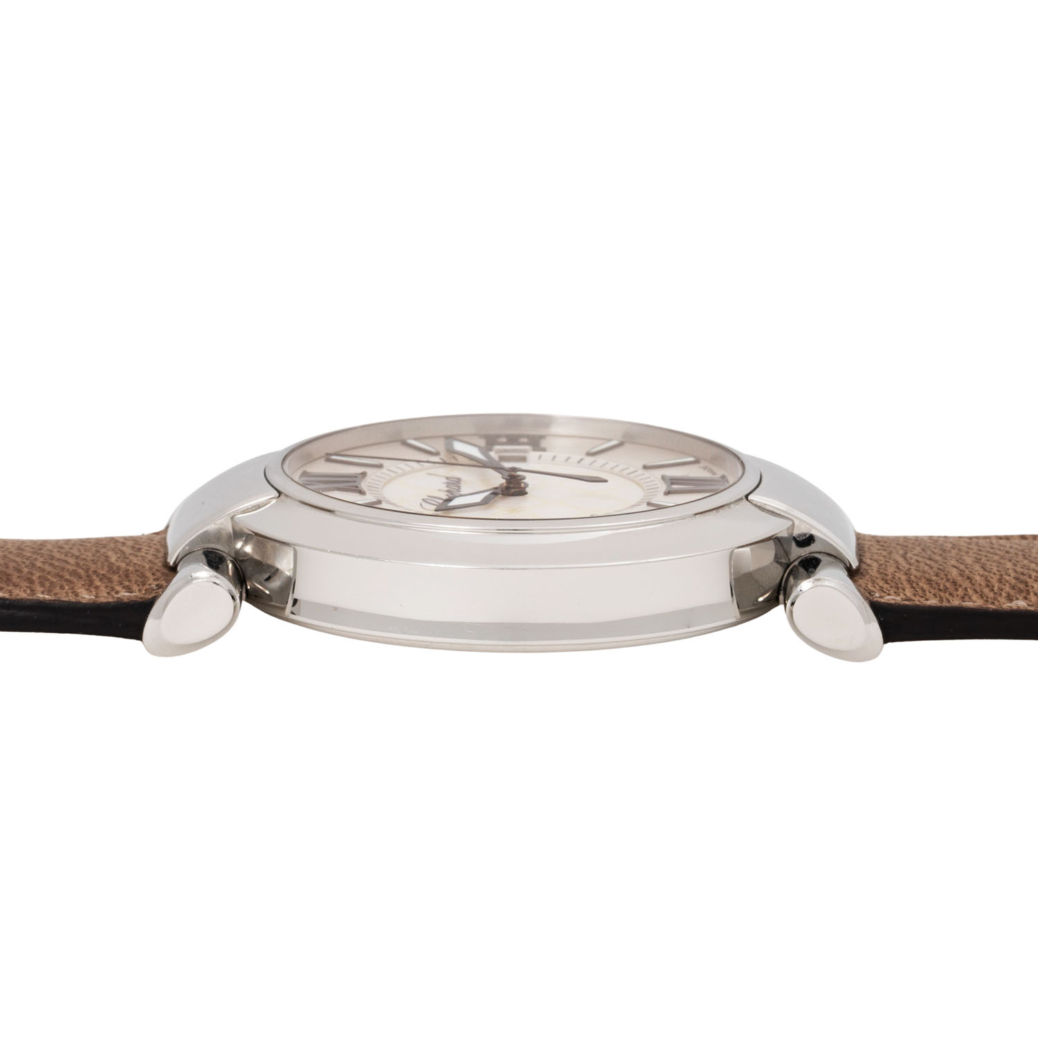 Edelstahl, Seriennummer 1597809. Automatikwerk Sellita SW300 mit guten Gangwerten (+8 s/d, 282° Amplitude). Silbernes Zifferblatt mit Perlmutteinlage, römischen Zahlen und Stabindizes, zentraler Sekunde und Datumsanzeige. Neues, graubraunes Lederarmband mit Original Chopard Edelstahl Dornschließe. Gebraucht mit Tragespuren, Bandanstoßglieder mit größeren Kratzern. Durchmesser ca. 40 mm gemessen ohne Krone.