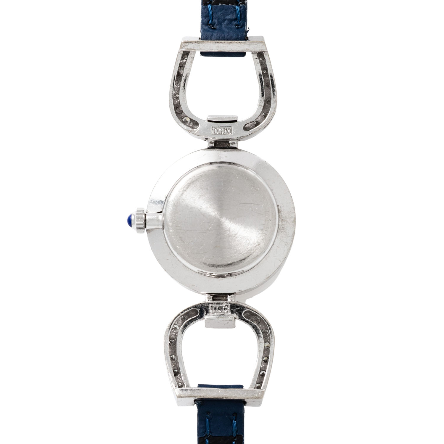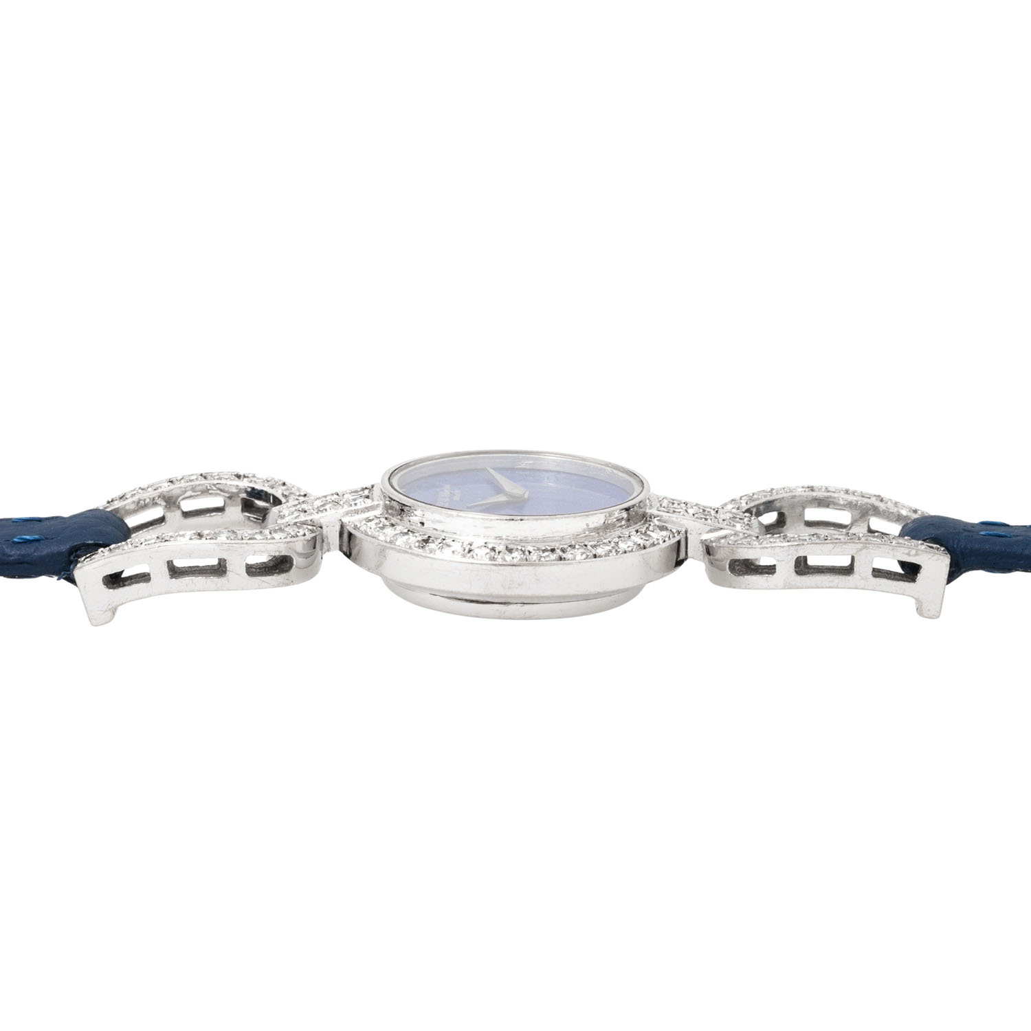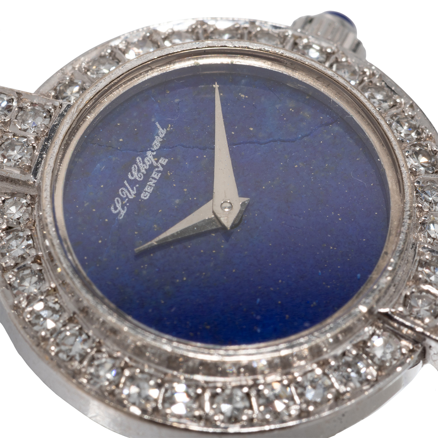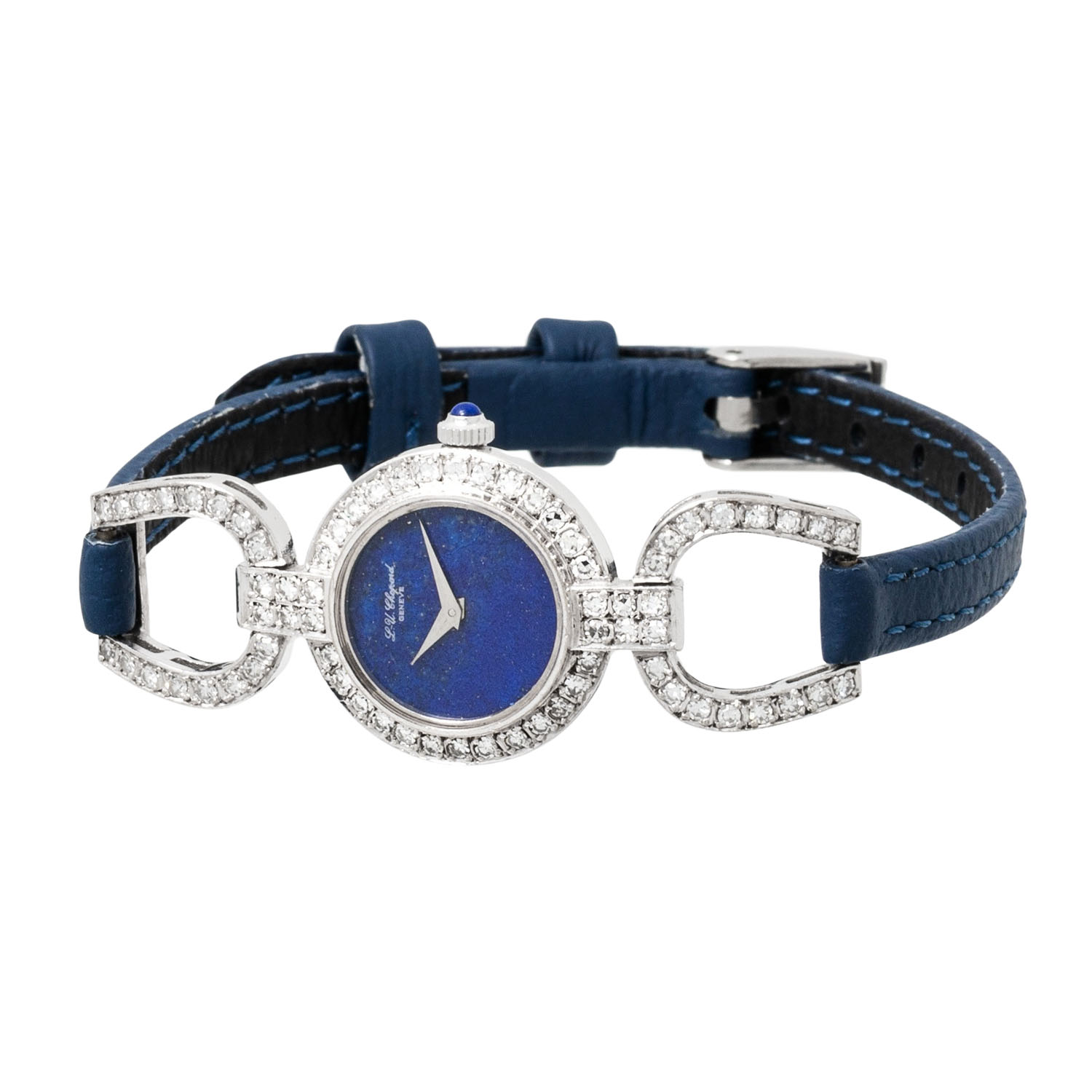 18K Weißgold. Handaufzugswerk Kal. 4520 mit guten Gangwerten (+6 s/d. 247° Amplitude). Lapislazuli Zifferblatt (mit Riss) mit Dauphine Zeiger. Die Uhr erhielt im Juni 2025 eine neue Revision. Lünette und Bandanstöße mit Diamantenbesatz. Bandanstöße in Hufeisen Form. Krone mit blauem Saphir Cabbochon. Neues Lederband mit der originalen Chopard Dornschließe aus Edelstahl. Für das Alter ist die Uhr in einem guten Zustand mit sichtbaren Tragespuren am Gehäuse. Revisionsnachweis anbei. Durchmesser ca. 20 mm (gemessen ohne Krone).