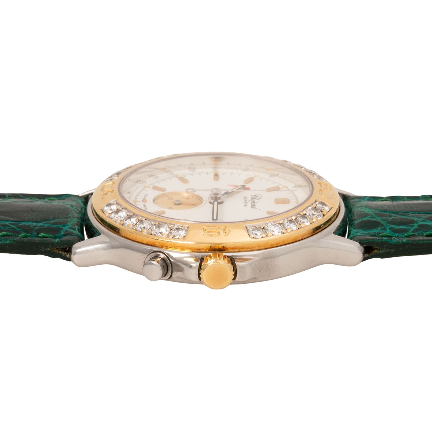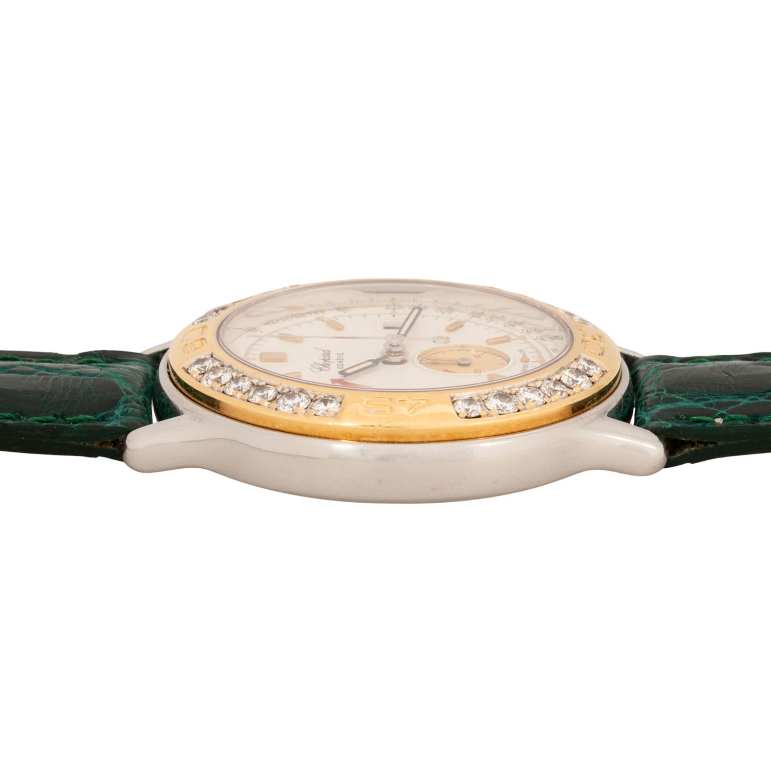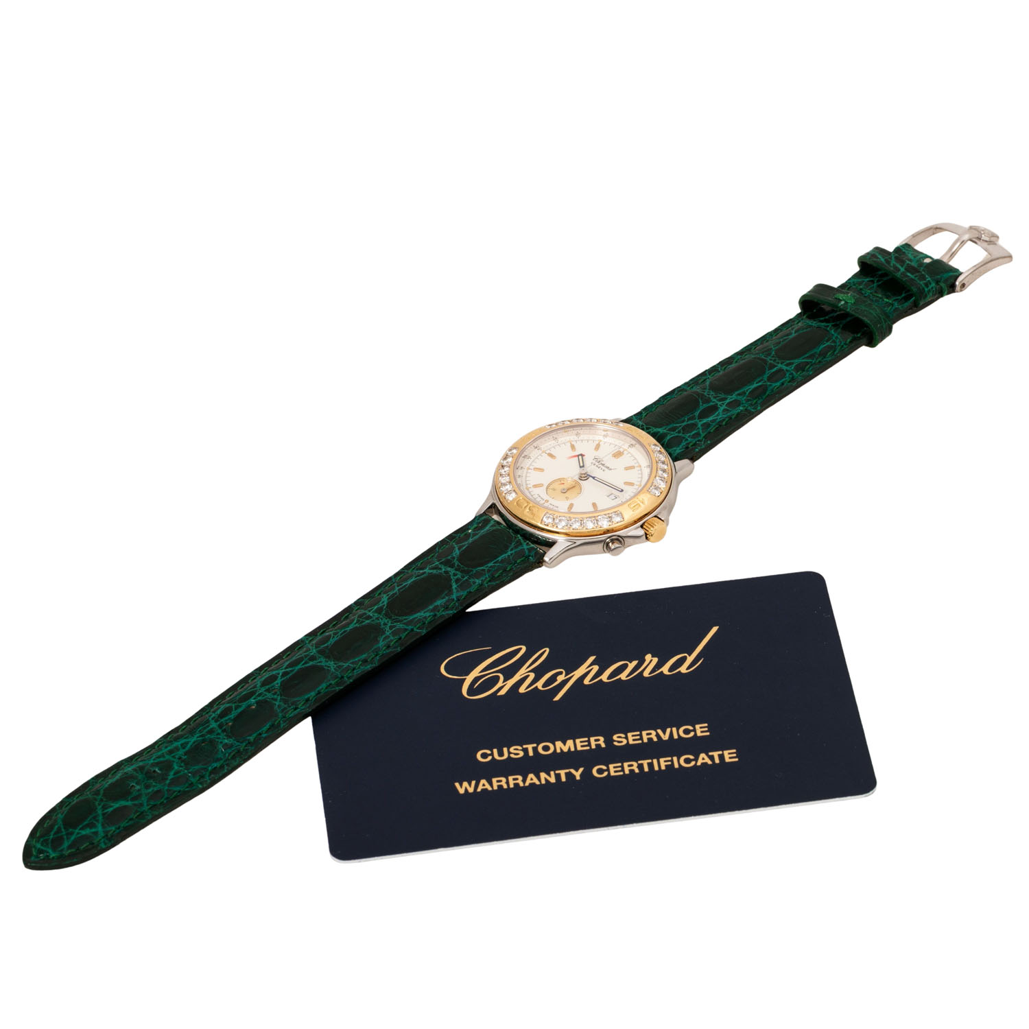 Edelstahl / Gelbgold 18K. Quarzwerk ETA 256.241 in funktionsfähigem Zustand. Neue Batterie. Weißes Zifferblatt mit Stabindizes, ein Hilfszifferblatt, Tachymeter Skala und Datumsanzeige. Die Lünette ist mit 24 Diamanten besetzt. Grünes Lederband mit Chopard Dornschließe aus Edelstahl. Gehäuseboden mit Gravur 'M.N. 29.3.93'. Guter Zustand mit Tragespuren. Revisionsnachweise von 1999, 2001 und 2014 sowie Chopard Service Garantiekarte vom September 2014 anbei. Durchmesser ca. 31 mm (gemessen ohne Krone).