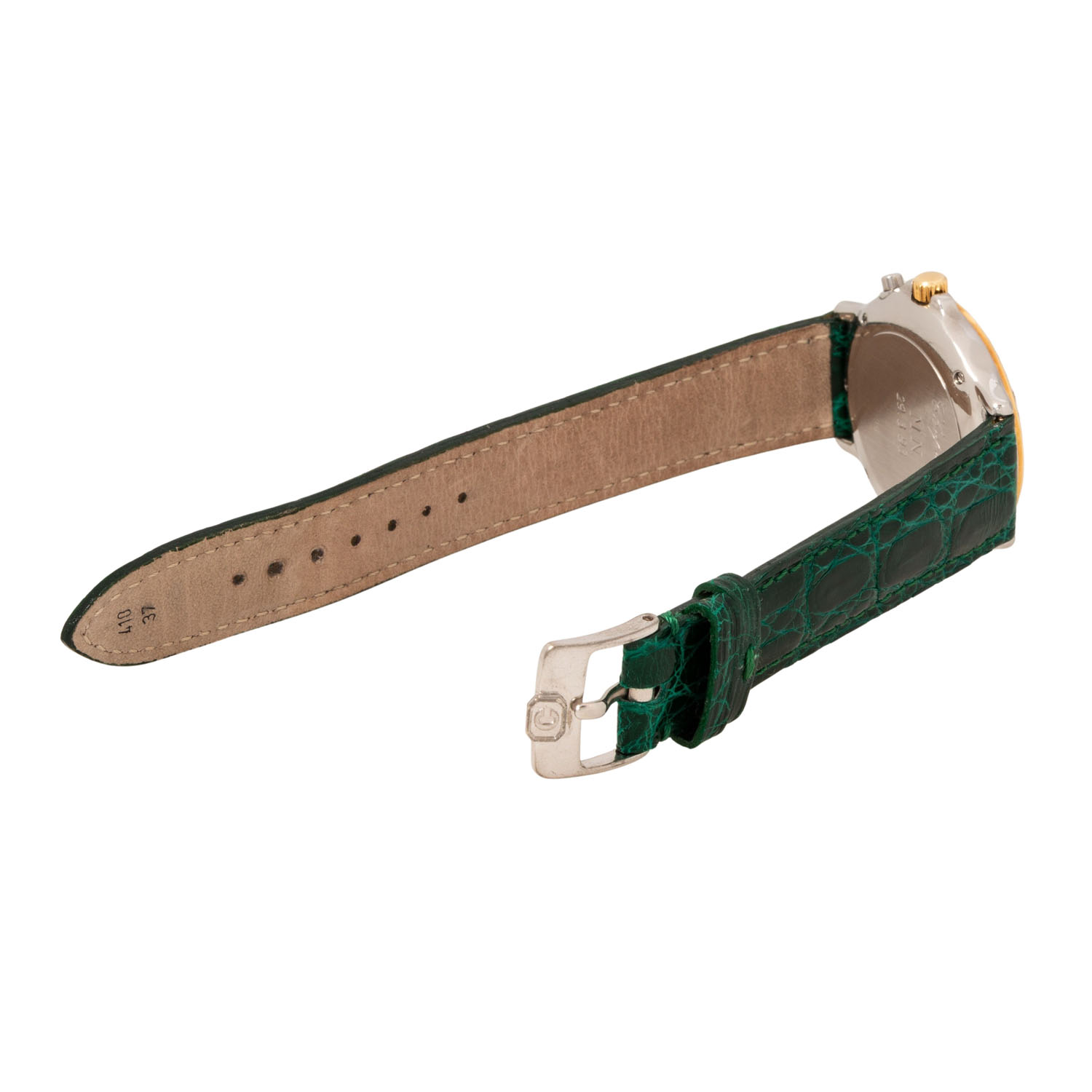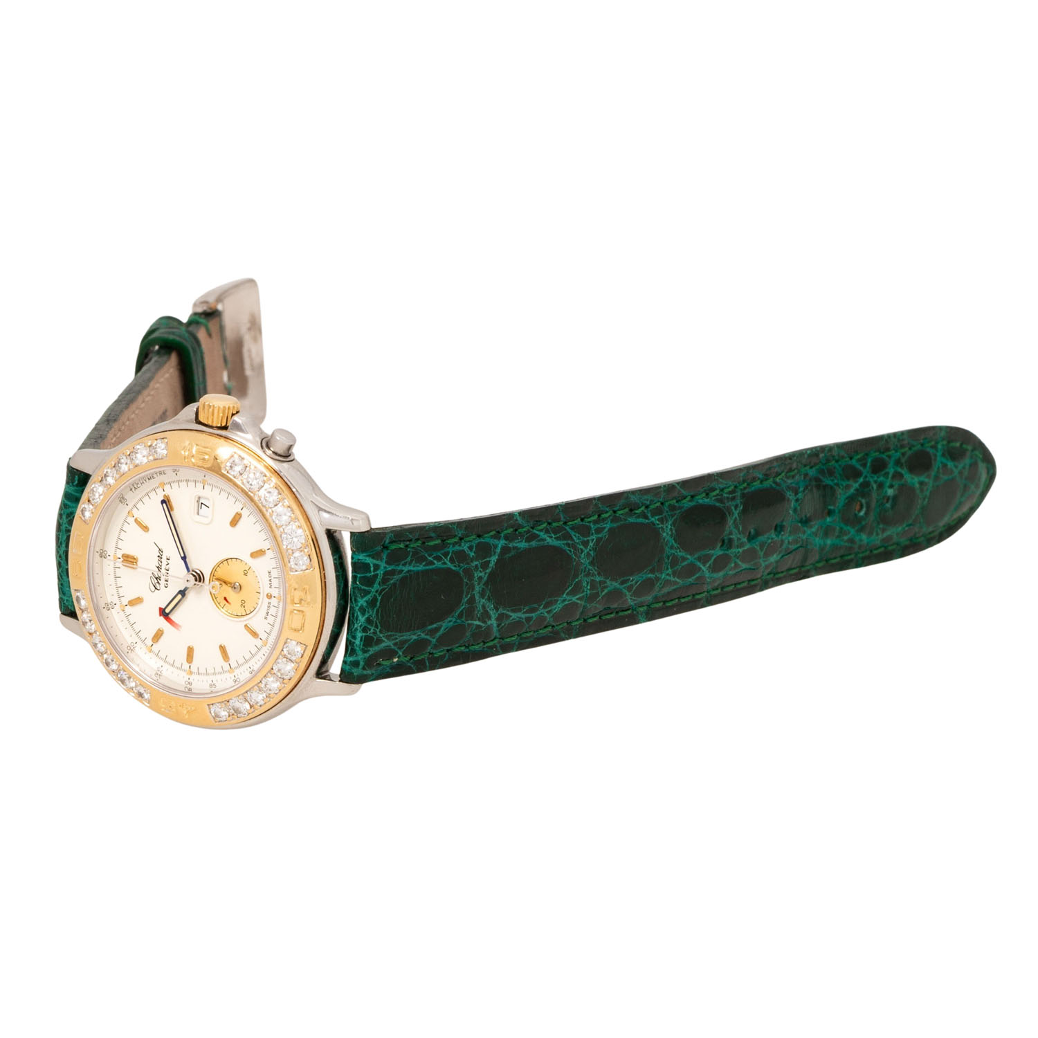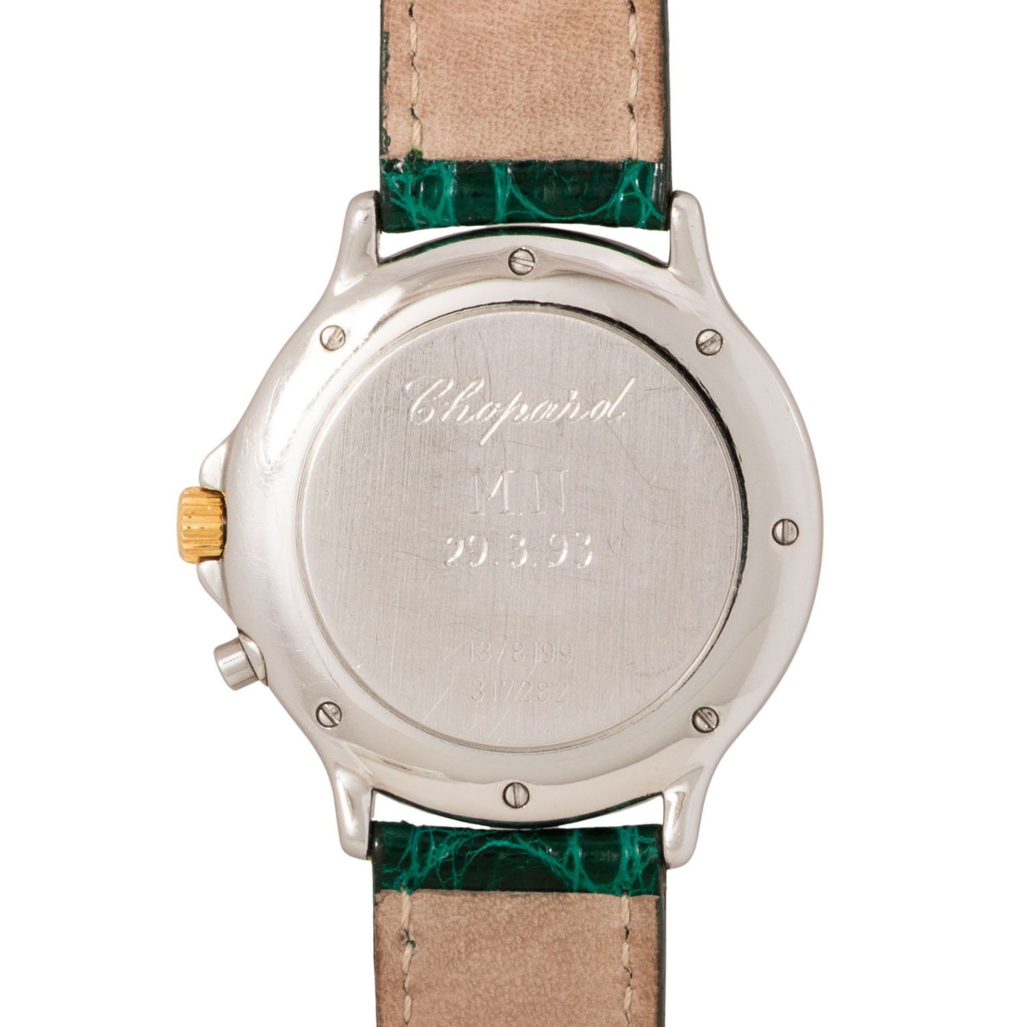 Edelstahl / Gelbgold 18K. Quarzwerk ETA 256.241 in funktionsfähigem Zustand. Neue Batterie. Weißes Zifferblatt mit Stabindizes, ein Hilfszifferblatt, Tachymeter Skala und Datumsanzeige. Die Lünette ist mit 24 Diamanten besetzt. Grünes Lederband mit Chopard Dornschließe aus Edelstahl. Gehäuseboden mit Gravur 'M.N. 29.3.93'. Guter Zustand mit Tragespuren. Revisionsnachweise von 1999, 2001 und 2014 sowie Chopard Service Garantiekarte vom September 2014 anbei. Durchmesser ca. 31 mm (gemessen ohne Krone).