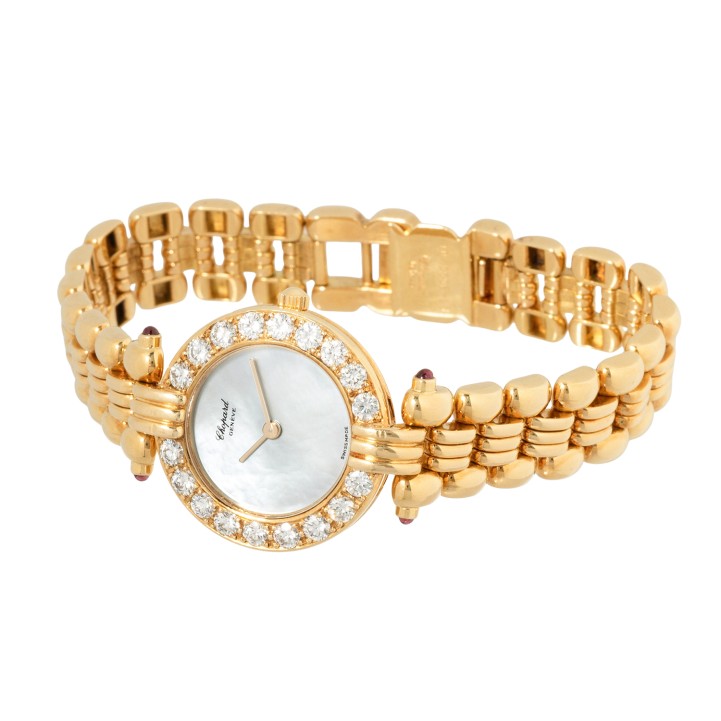Gelbgold 18K. Seriennummer 436528. Quarzwerk in funktionsfähigem zustand. Neue Batterie. Perlmutt Zifferblatt . Anstöße mit 4 Rubin Cabochons. Lünette mit 18 Brillanten. Chopard Armband in 18K Gelbgold mit Faltschließe. Guter Zustand mit leichten Tragespuren. Durchmesser ca. 23 mm (gemessen ohne Krone). Passend bis zu ca. 17,5 cm Handgelenkumfang.